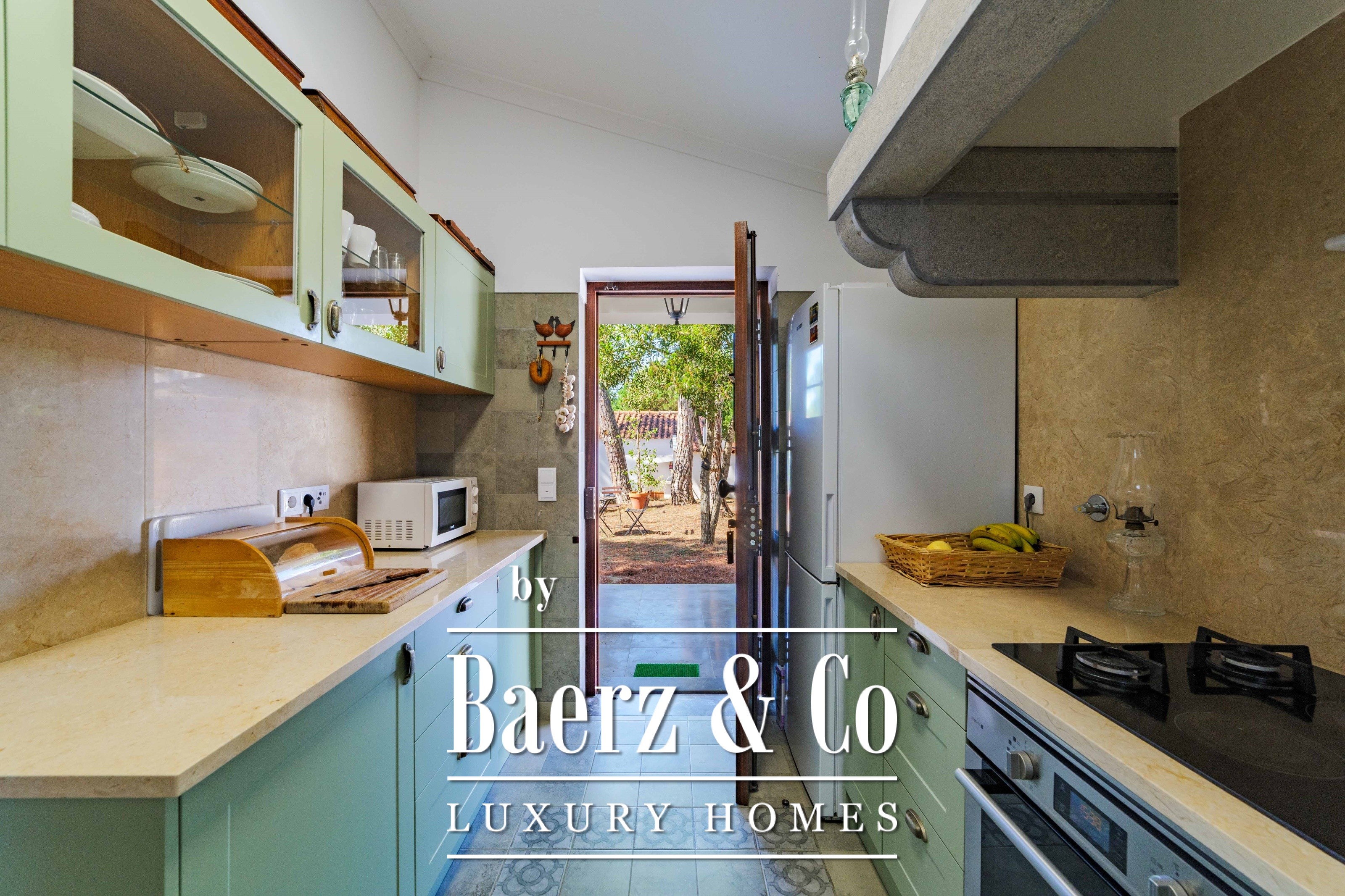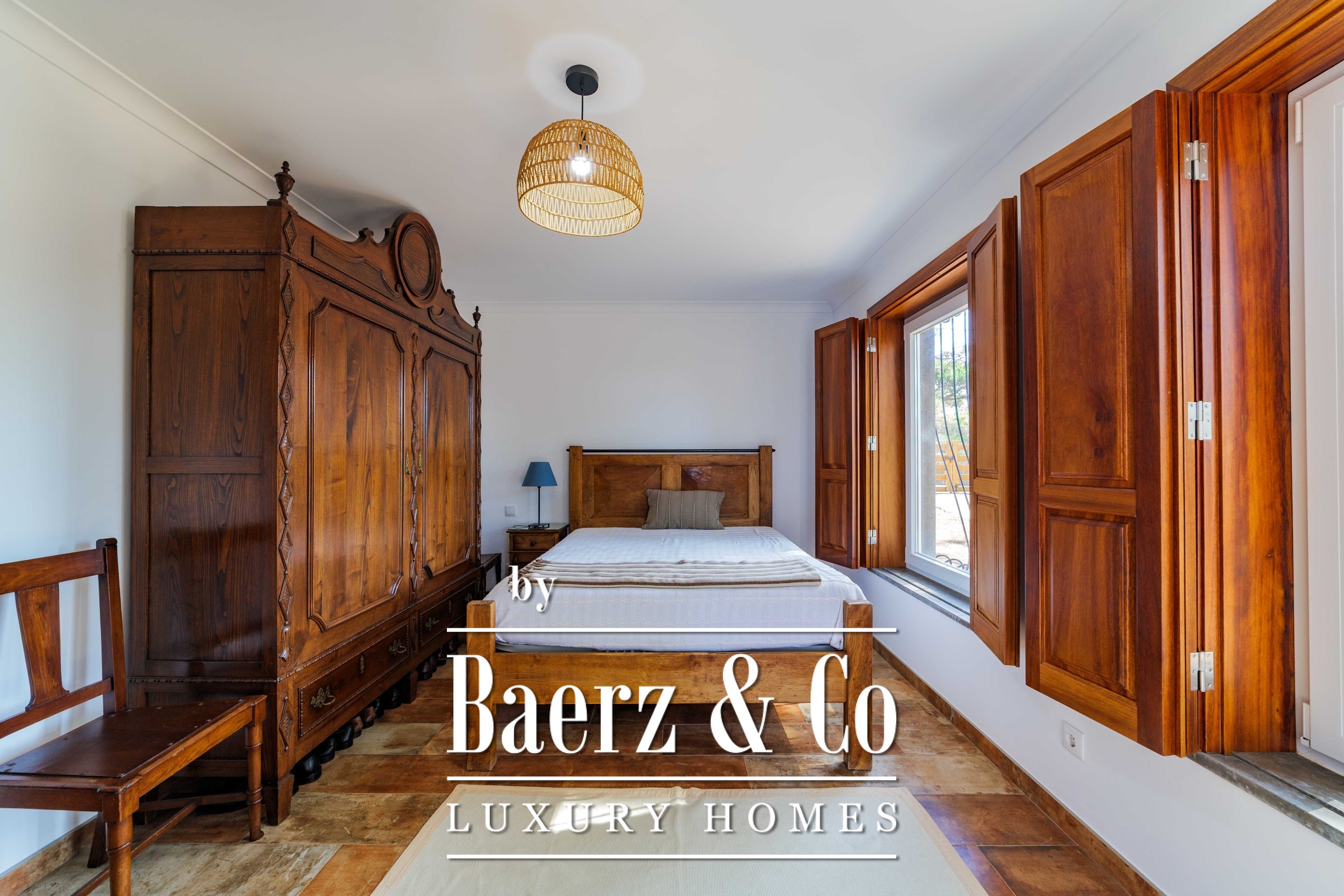 De hoofdresidentie beslaat twee woonlagen en 302 m², voltooid in 2023 met bijzondere aandacht voor authentieke materialen: exotische houtsoorten, natuursteen, traditionele dakpannen van gebakken klei en met de hand vervaardigd smeedijzeren details. Zonlicht van oost tot west vult harmonieus de royaal ingedeelde kamers—ruime woonvertrekken met open haard, een volledig uitgeruste keuken met directe toegang tot de tuin, privé-suites en terrassen georiënteerd op het rustgevende uitzicht over de heuvels van Sintra en de Atlantische Oceaan.
