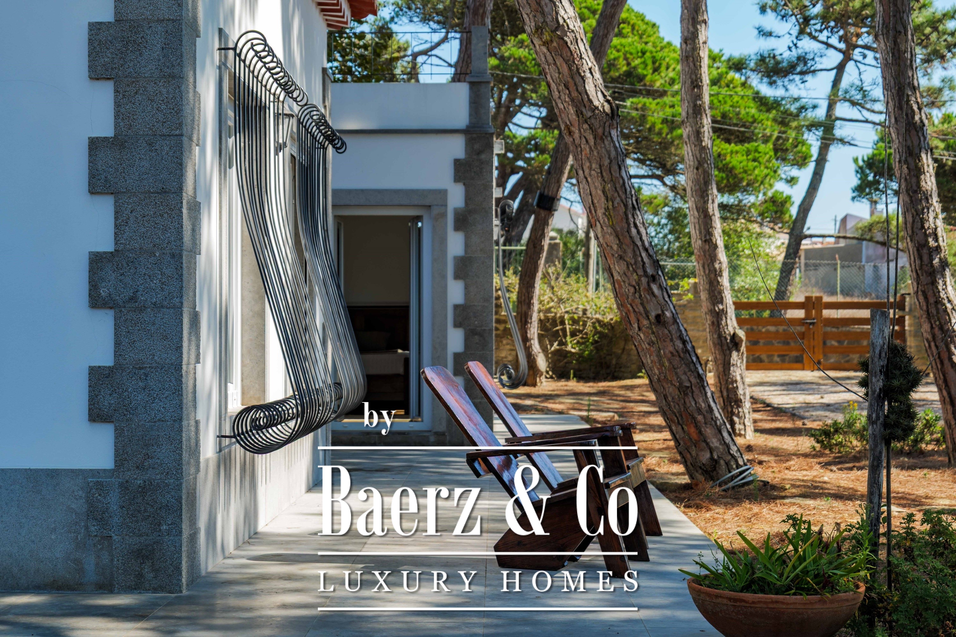 Villa Sintra met tuin en zeezicht combineert Portugese architectuur uit de twintigste eeuw met hedendaagse verfijning. Gelegen op een perceel van 2.341 m² fraai aangelegde tuinen, op slechts vijf minuten van Praia do Magoito, worden het hoofdverblijf en het gastenverblijf omgeven door volgroeide pijnbomen onder een uitgestrekte hemel.