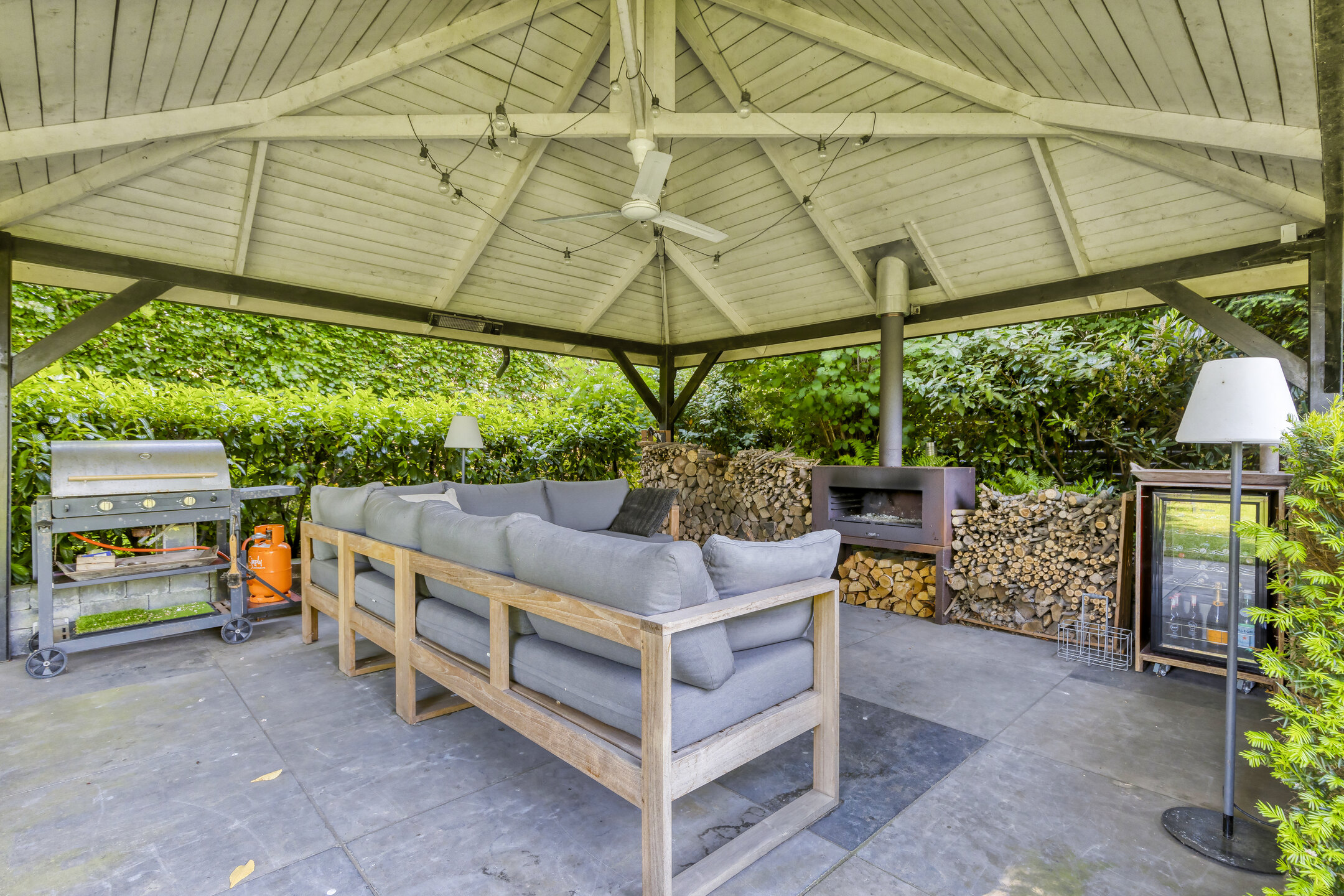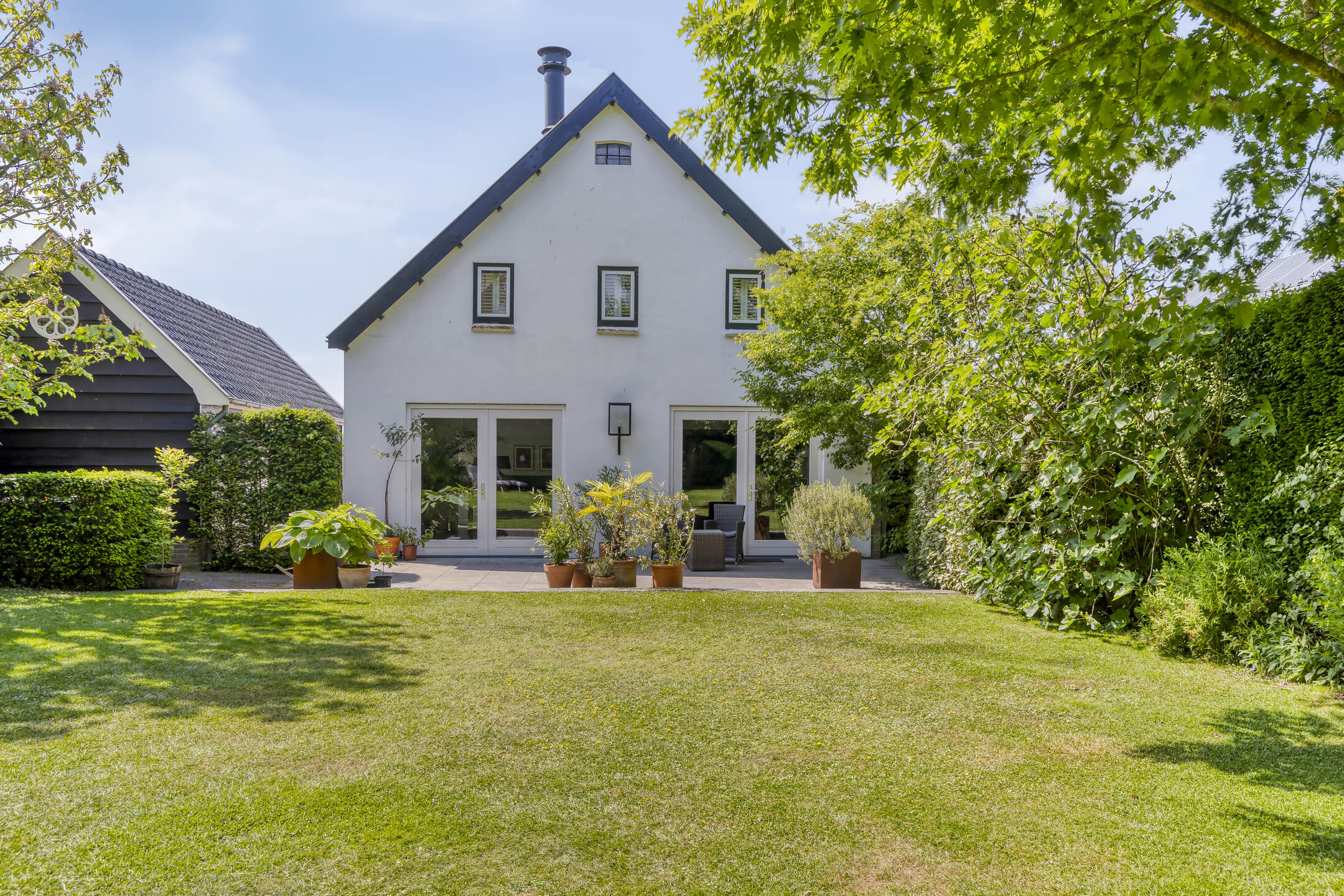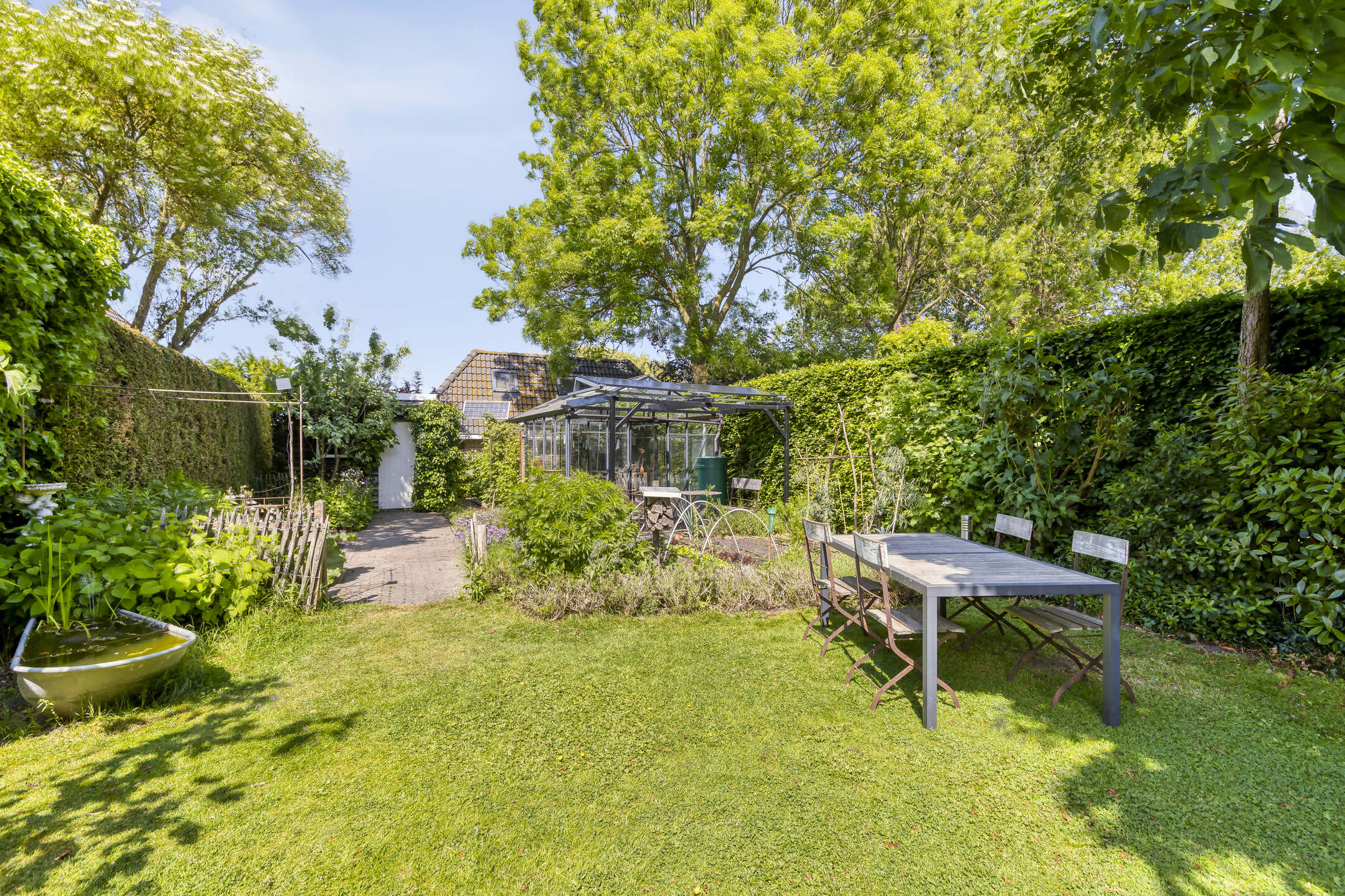 Aangelegde tuin, terras bestraat met sierbestrating en voorzien van een overkapping vv. buitenhaard, tuinkas vv. beregeningscomputer en groentetuin vv. drinkwatertappunt, borders, gazon vv. beregeningsinstallatie en een zij-uitgang;