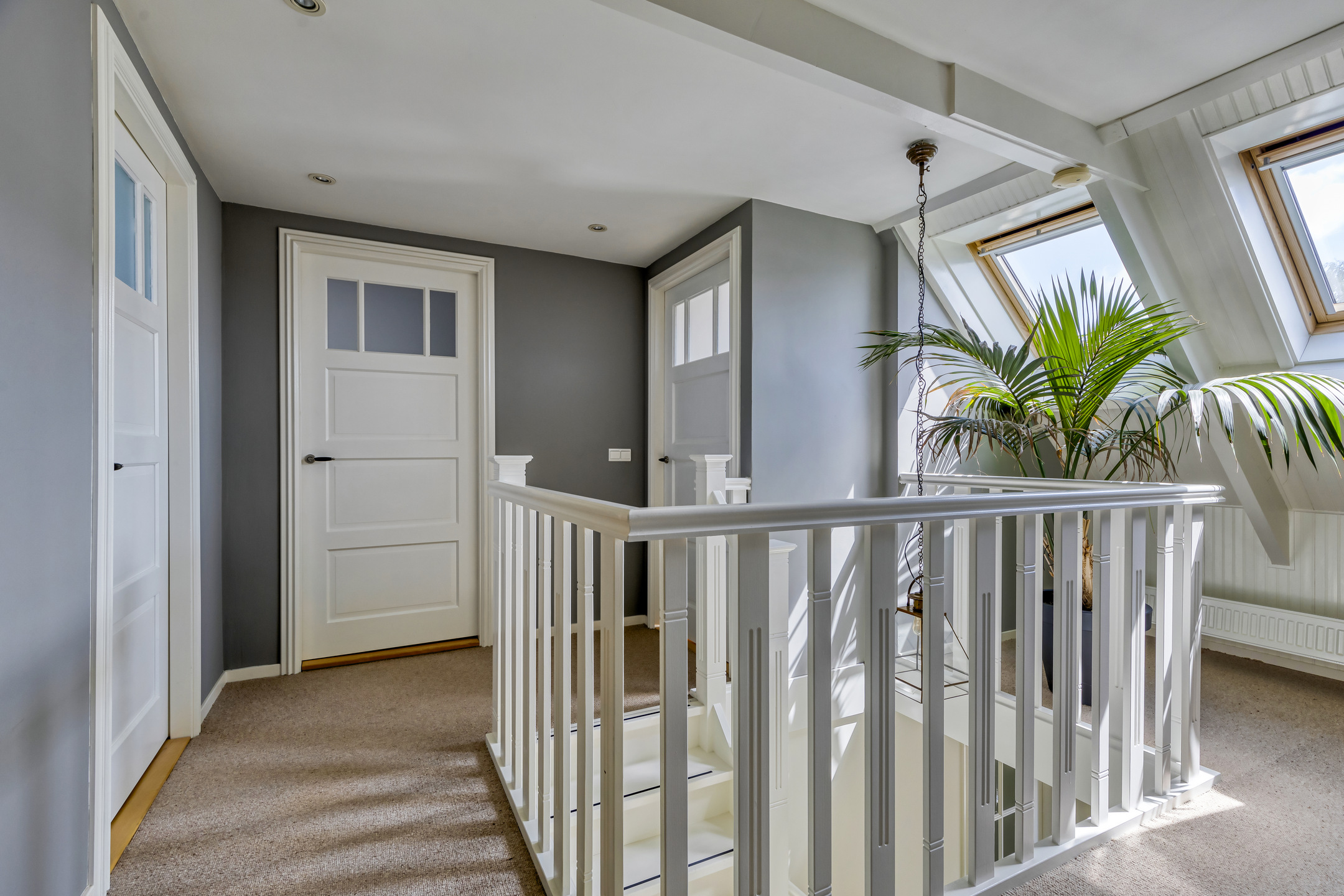 Overloop, voorzien van een vlizotrap en 2-tal dakramen, wandafwerking stucwerk, vloer afgewerkt met tapijt, plafond afgewerkt met stucwerk vv. inbouwspots;
