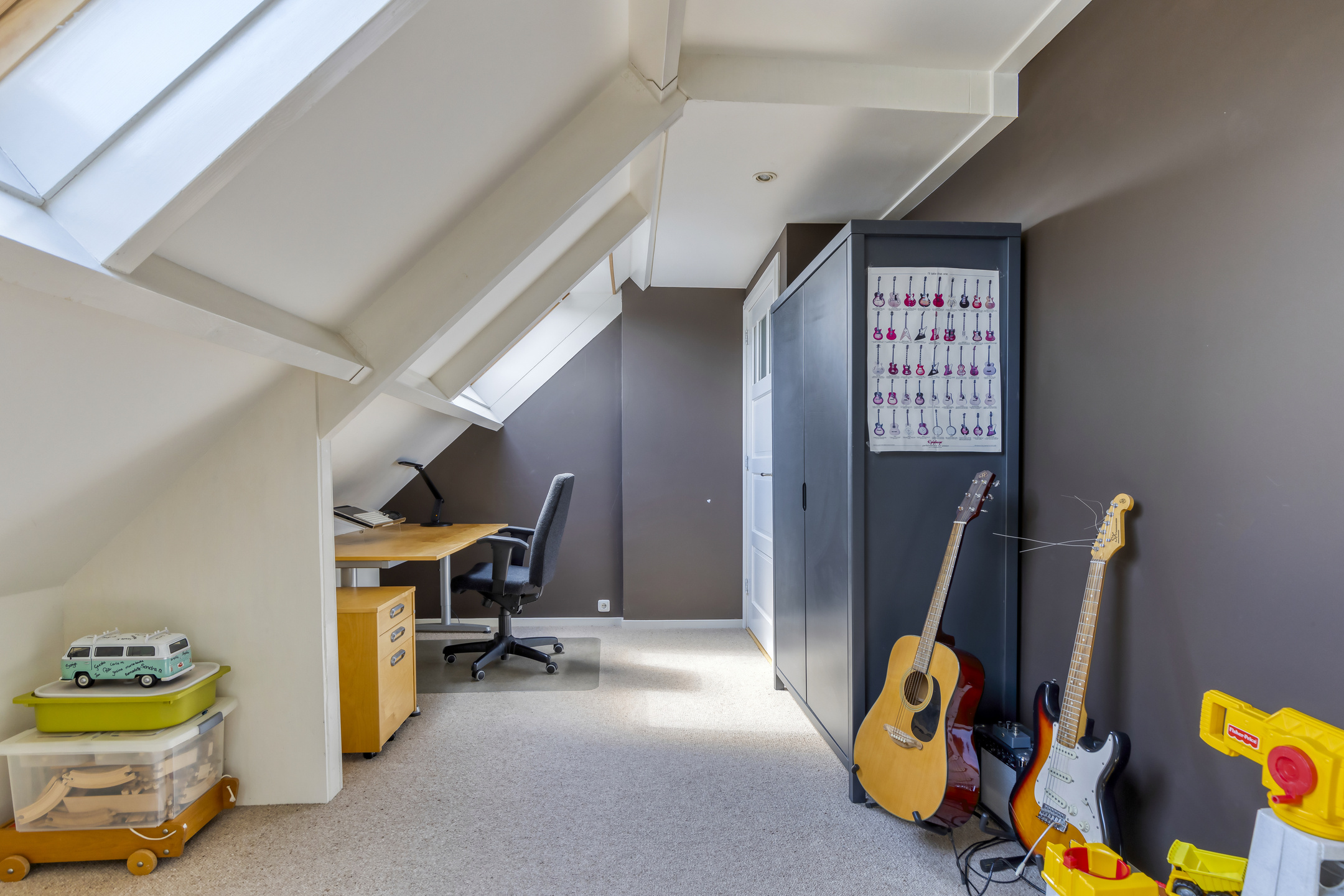 slaapkamer (boven werkkamer), met 2-tal dakramen, wandafwerking stucwerk, laminaatvloer, dakbeschot (geïsoleerde dakplaten) in zicht;