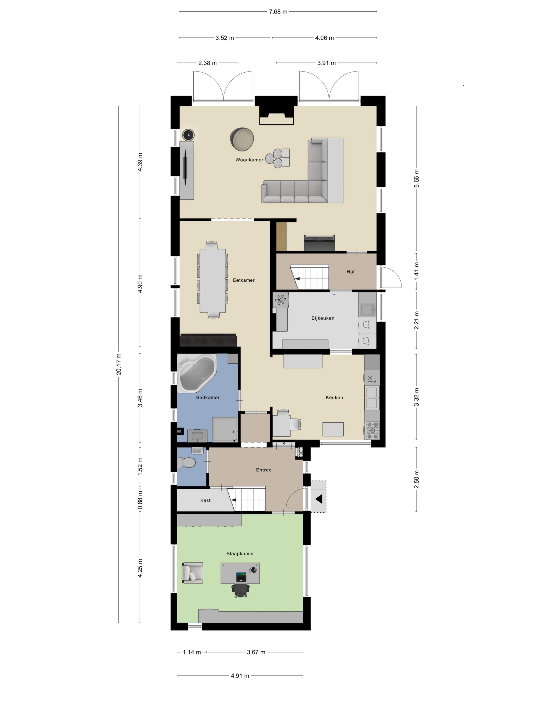 De royale en sfeervolle woonkamer bevindt zich aan de achterzijde met zicht op de tuin. Tevens bevindt zich op de begane grond ook een keuken en bijkeuken.
