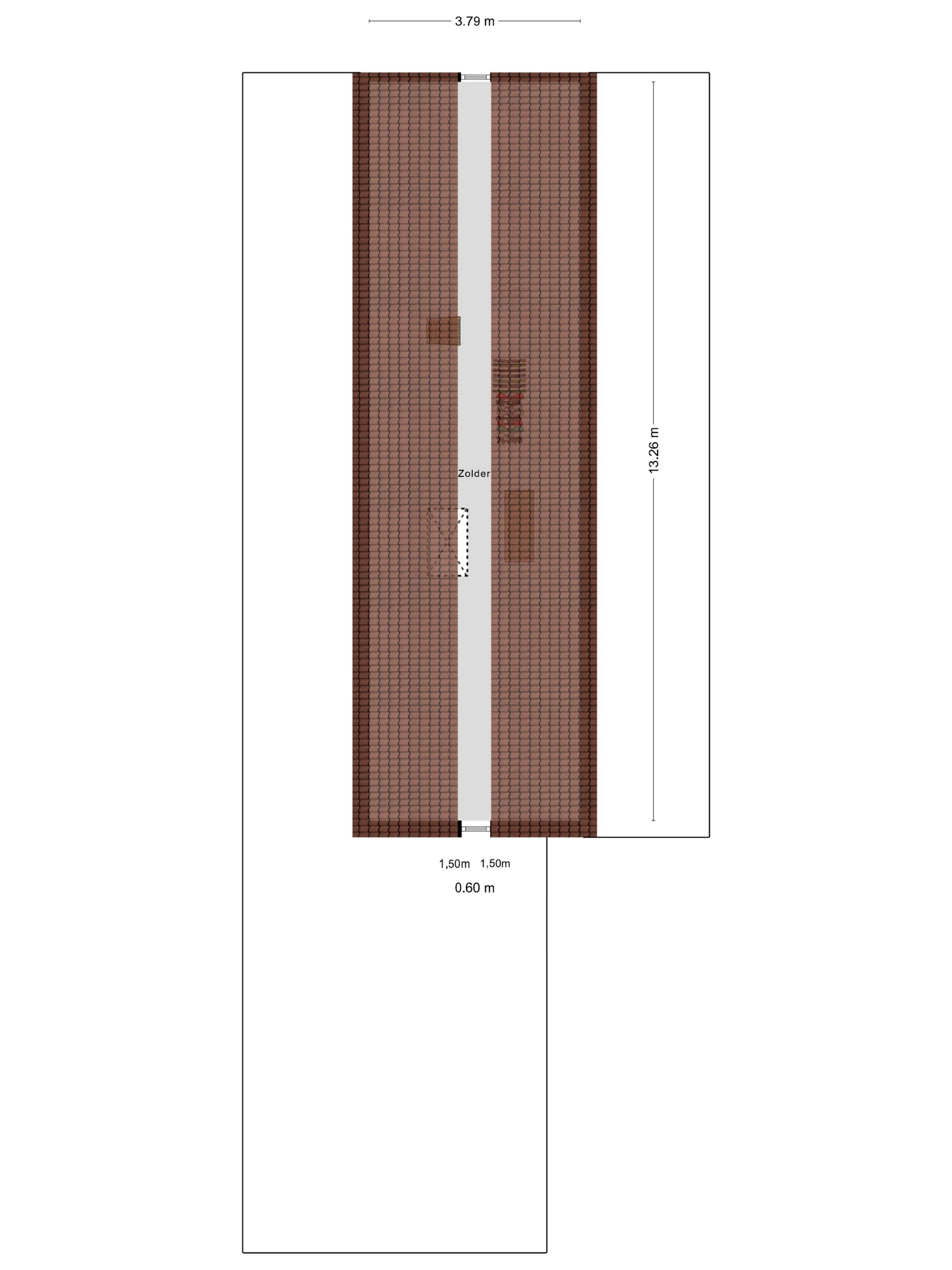 Bergzolder, houten vloer, dakplaten in het zicht.