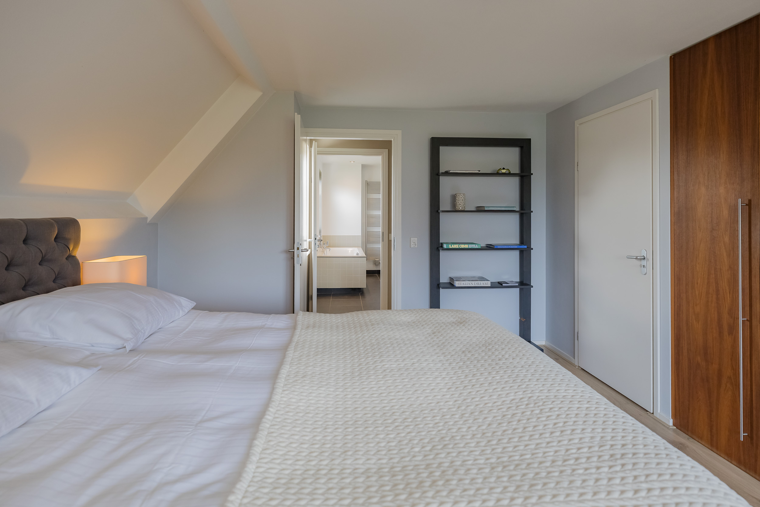 Via de open trap kom je op de eerste verdieping. De vide en overloop zorgen voor een open en ruimtelijk gevoel. Je hebt hier vier royale slaapkamers waarvan er één momenteel in gebruik is als kleedkamer.