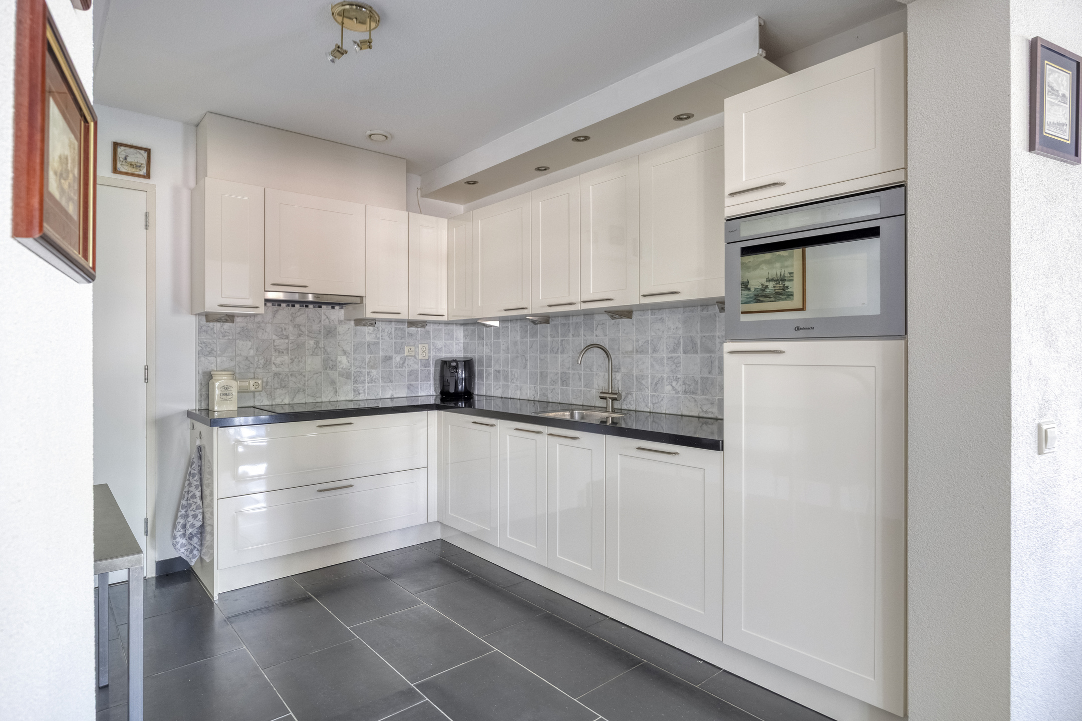 half open keuken waarin geplaatst een in hoek opgestelde inbouwkeuken (2013), voorzien van een granieten aanrechtblad met een spoelbak, inbouw inductie kookplaat, -koeler, -combi oven/magnetron, -vaatwasser en een afzuigkap, wandafwerking sierpleister, tegelvloer, plafond afgewerkt met spuitwerk;