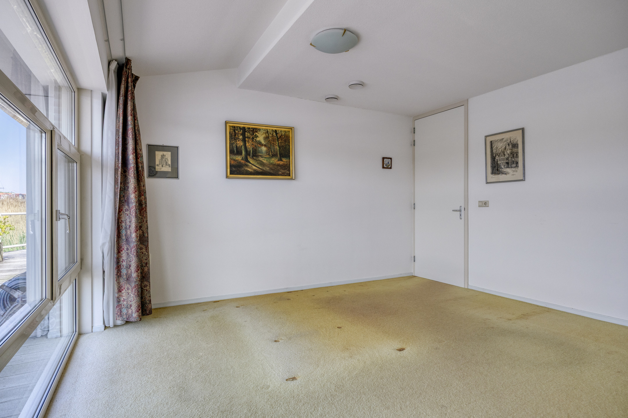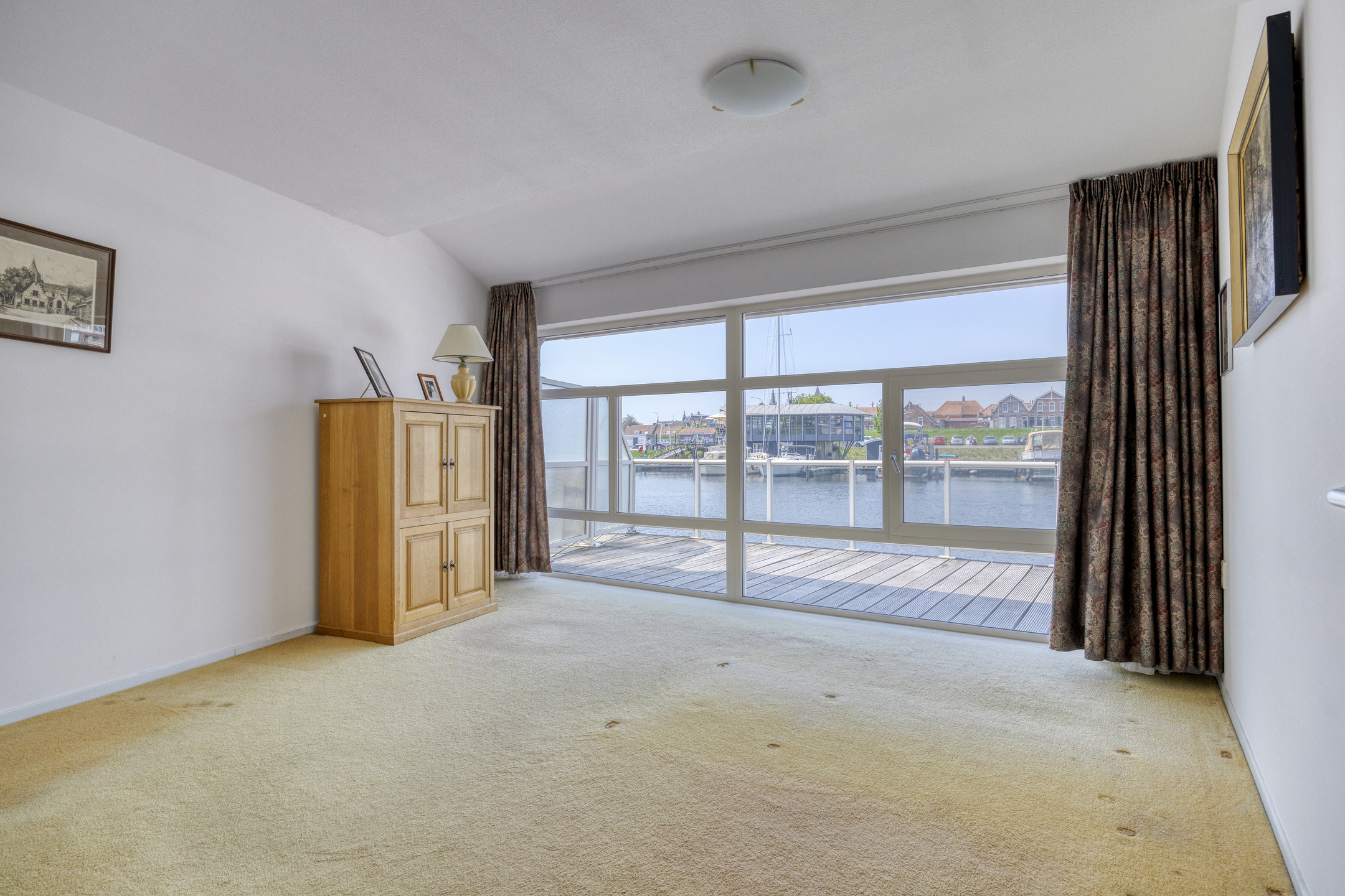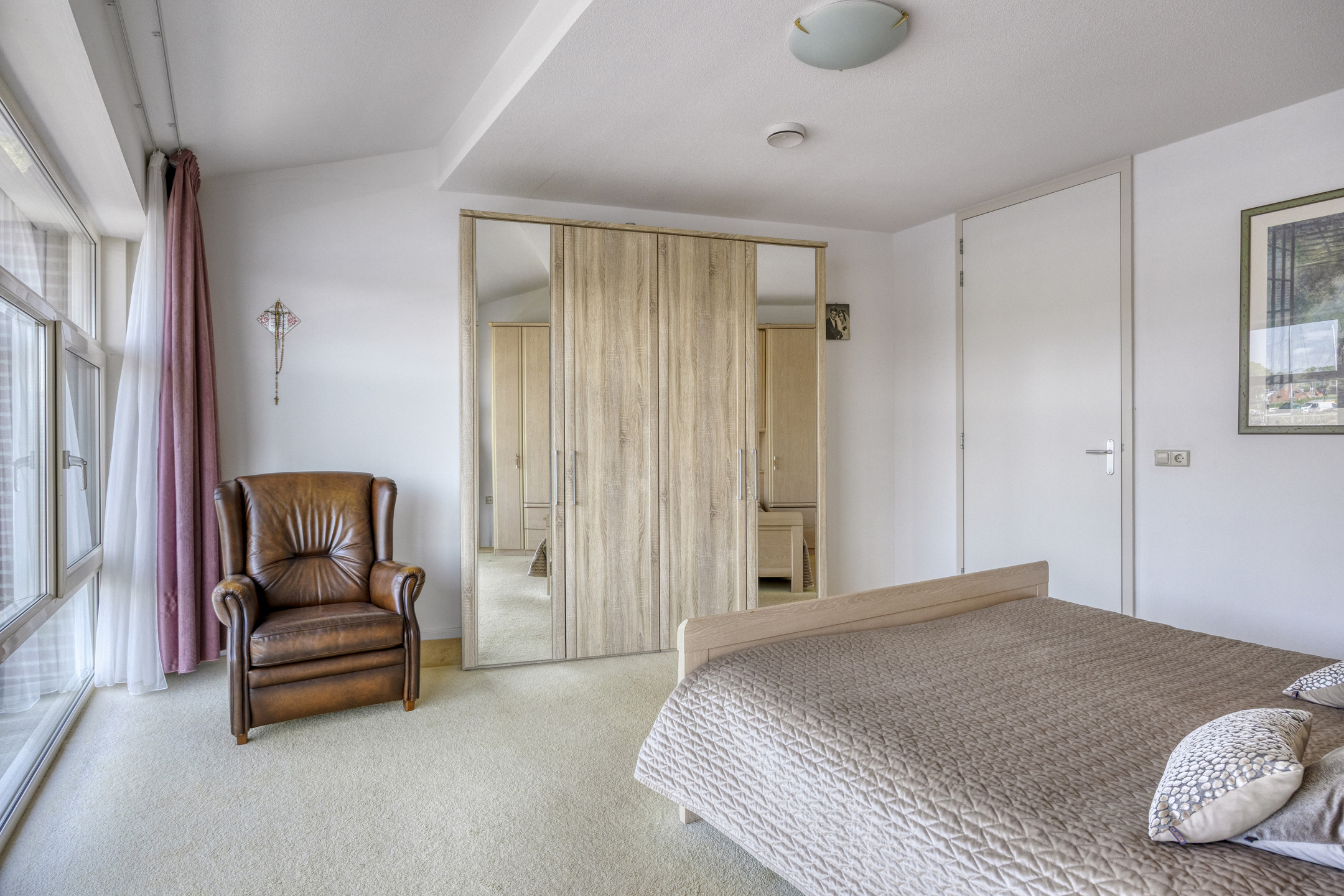 slaapkamer rechts voor (master) met uitzicht op het water, wandafwerking sierpleister, vloer afgewerkt met tapijt, plafond afgewerkt met spuitwerk;