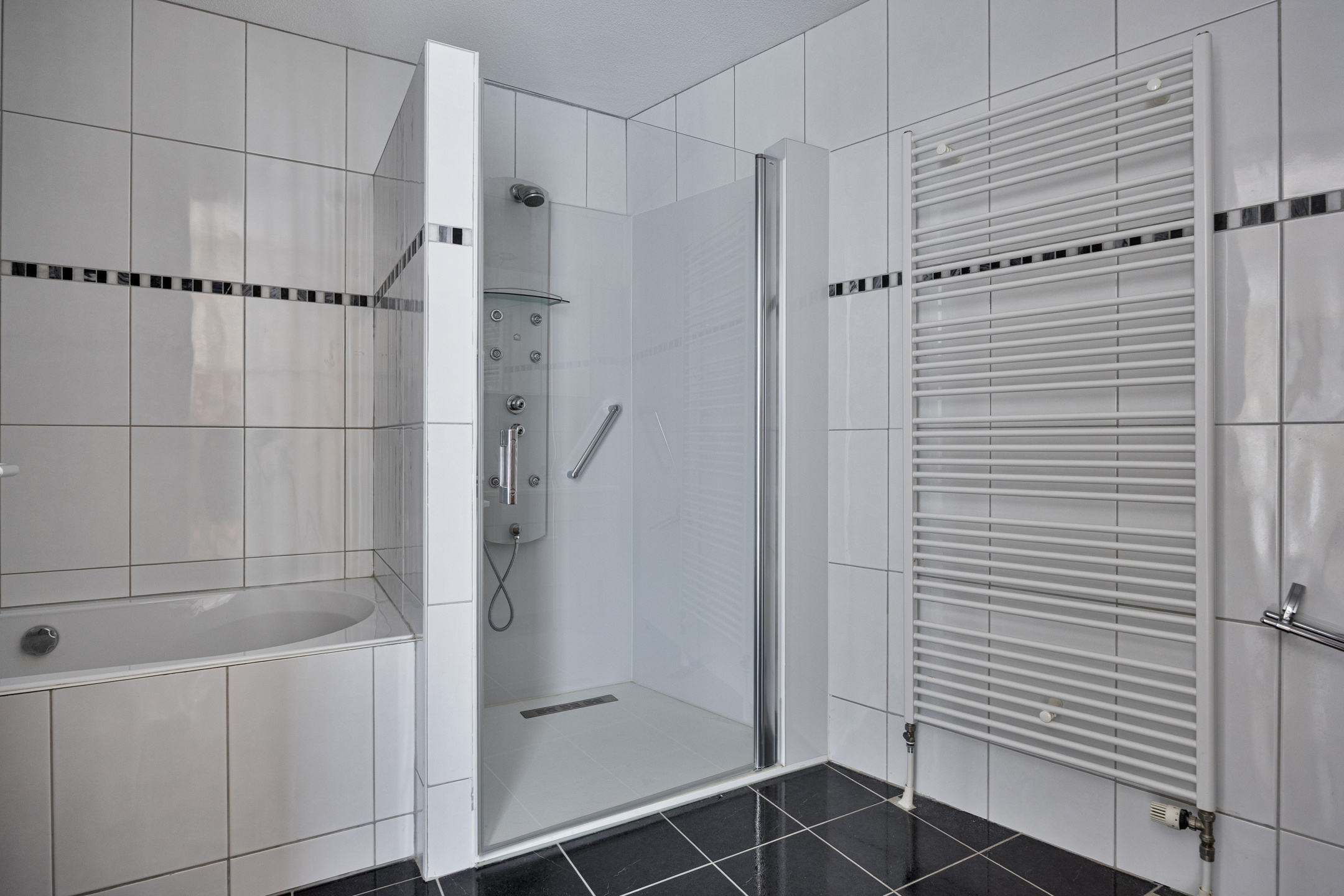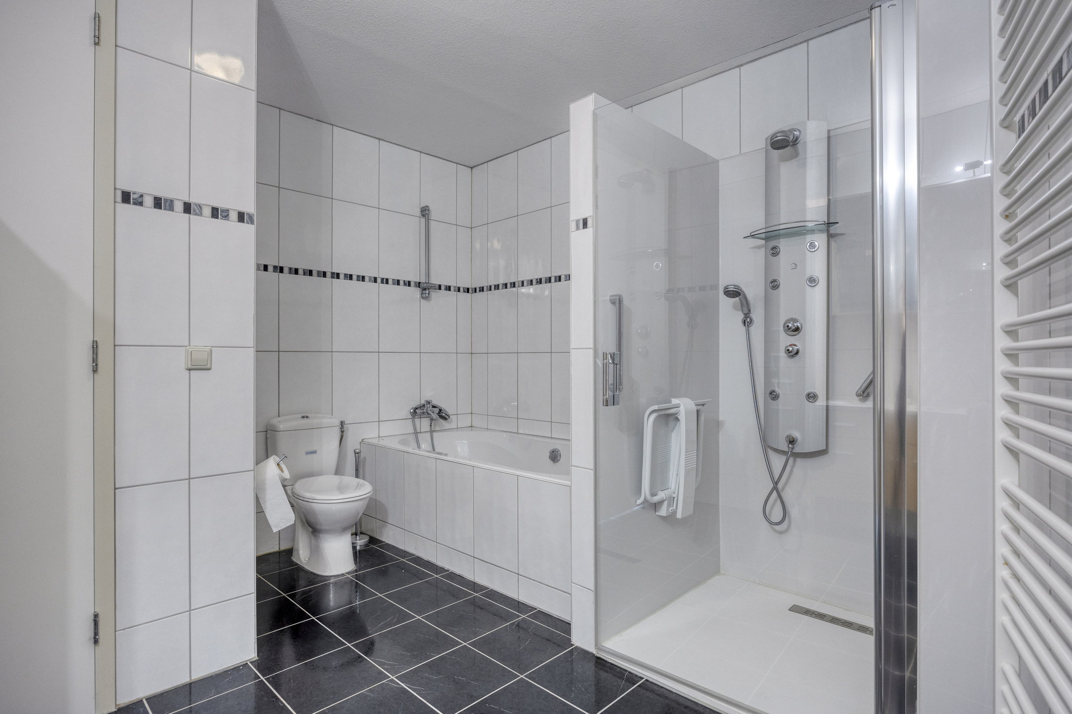 betegelde badkamer, voorzien van een ligbad, douchecabine met jets en massagepaneel voorzien van een lage instap, toilet, badkamermeubel met een dubbele wastafel en een designradiator;