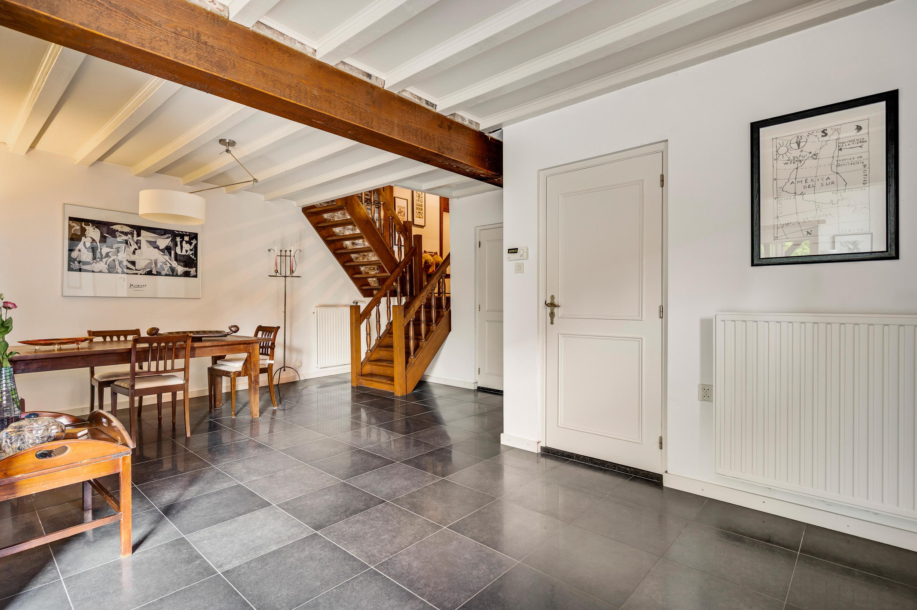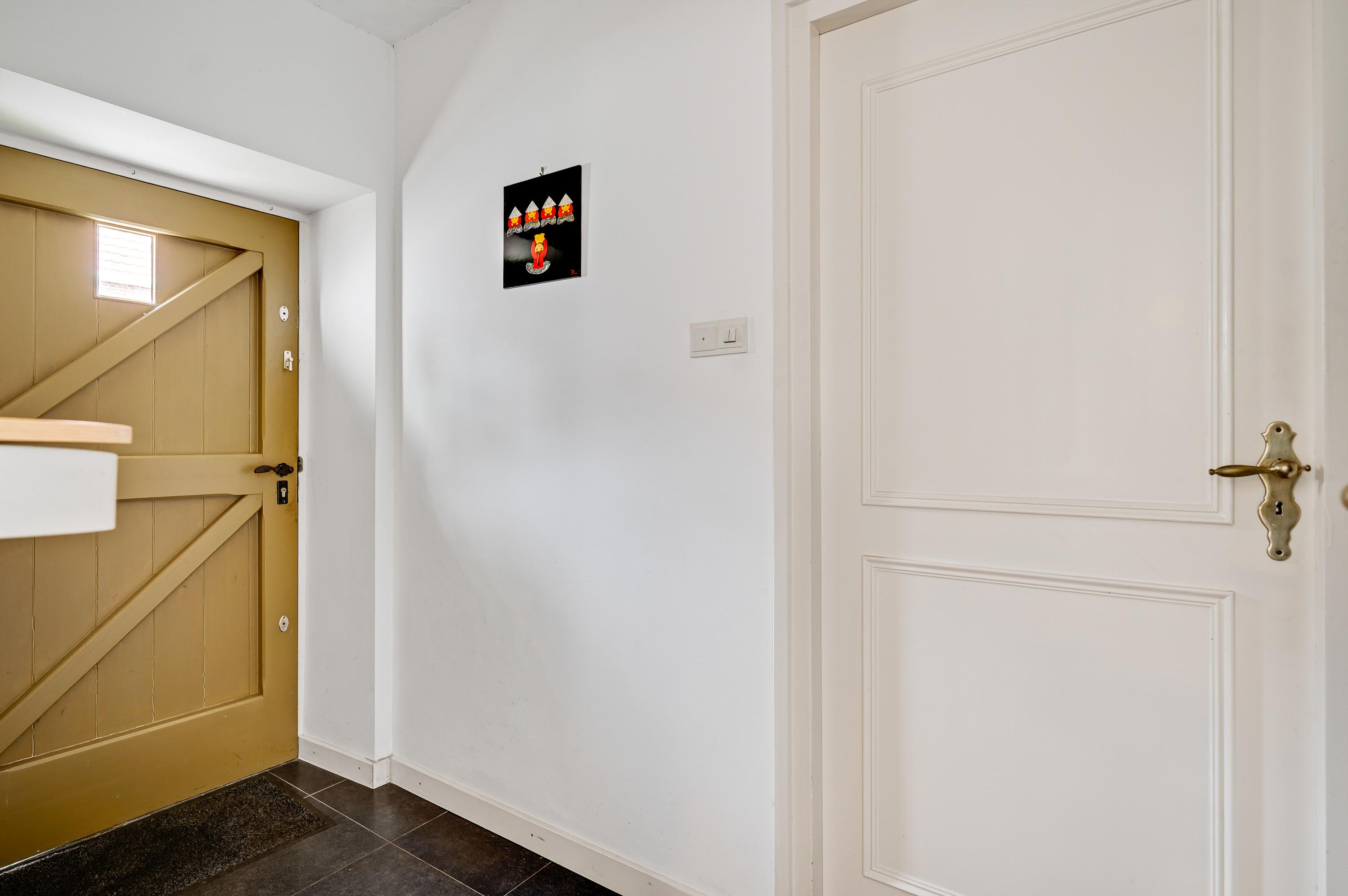 De royale hal met schouw en meterkast geeft toegang tot de toiletruimte, een slaapkamer met aparte badkamer en de keuken. Vanuit de hal bereikt u ook de trap naar de eerste verdieping. De hal is tevens de voormalige zitkamer van de B&B. Deze ruimte kan dienst doen voor verschillende doeleinden.