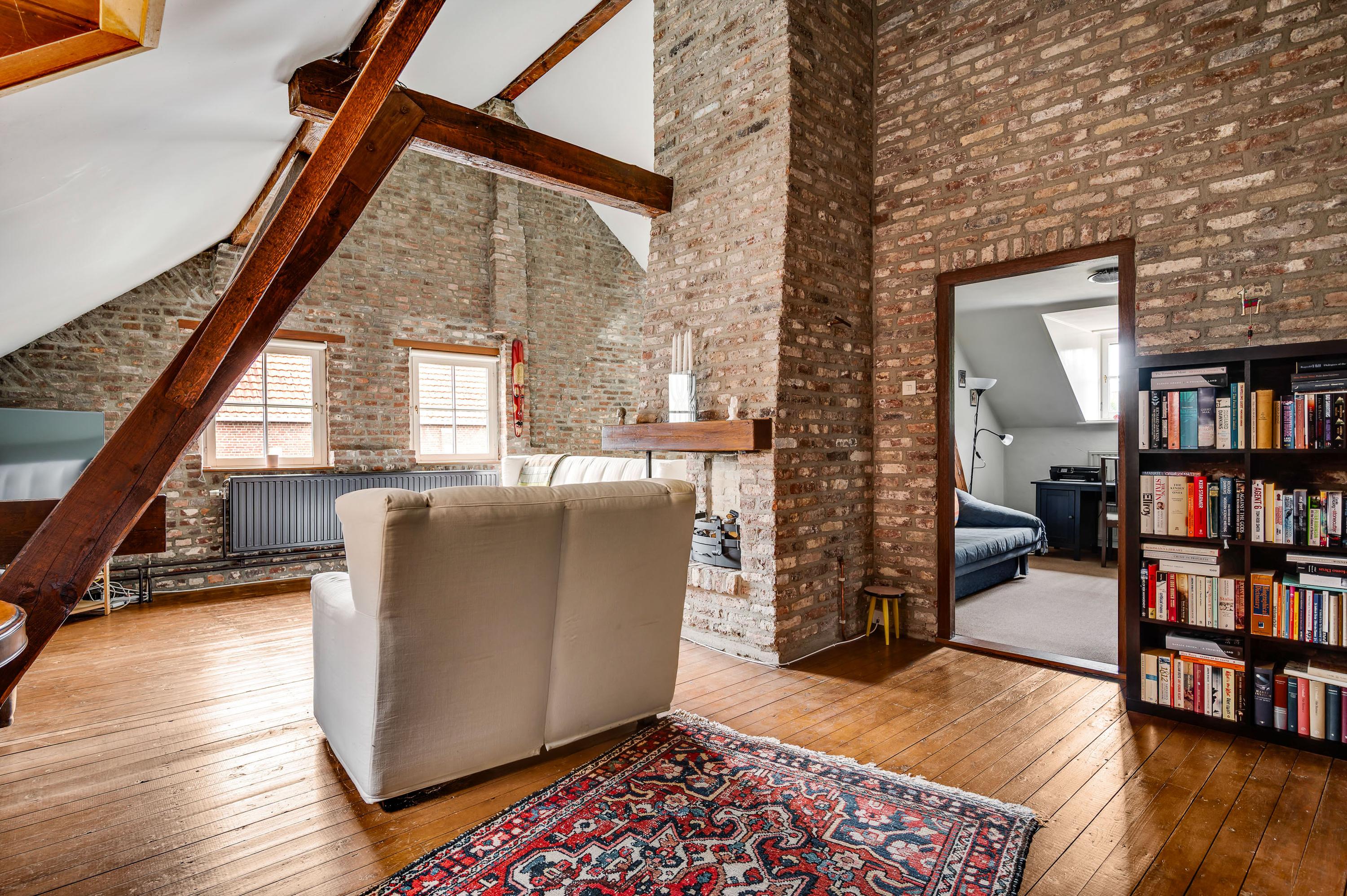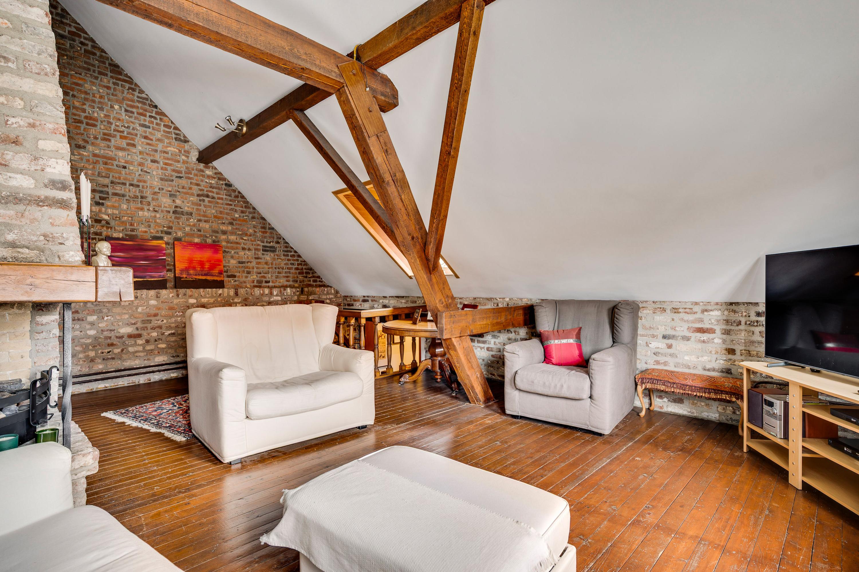 Gezellige zitkamer/verblijfsruimte (± 34 m²) met plankenvloer en open haard, een heerlijke plek om te ontspannen.