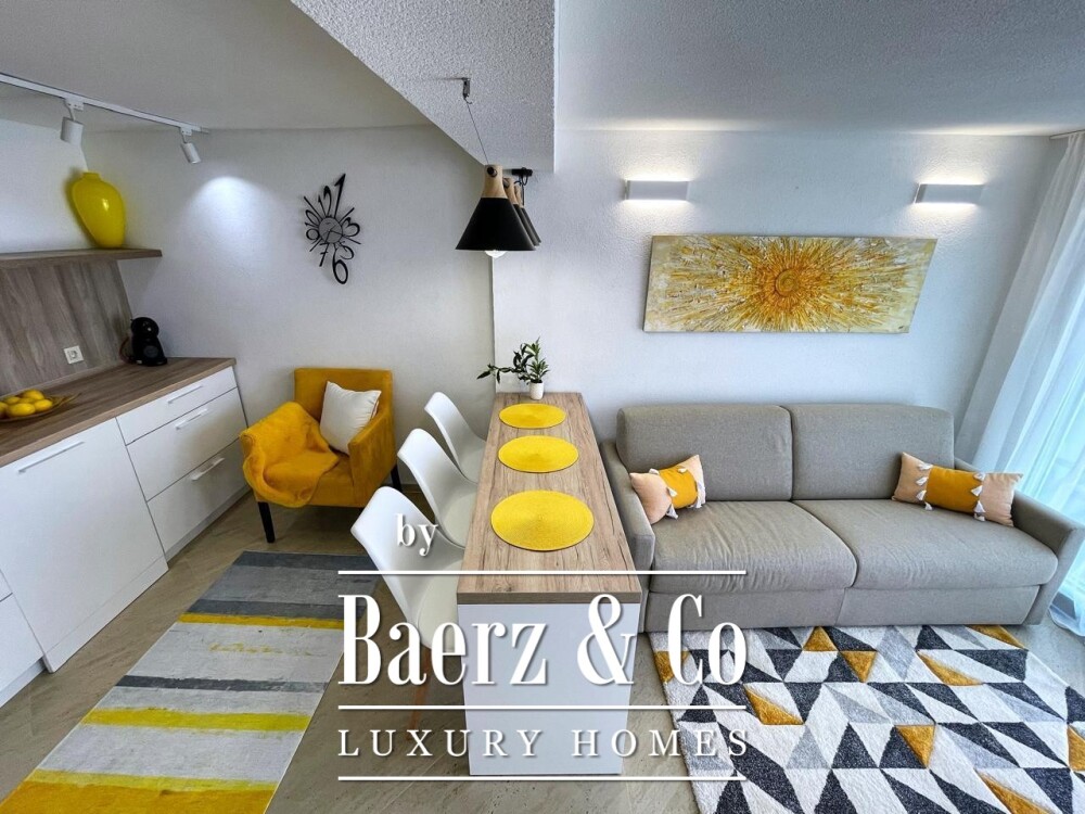 De woning beschikt over twee slaapkamers en twee badkamers, verrijkt met een professioneel interieurontwerp en compleet nieuw meubilair. Veel daglicht stroomt naar binnen via ruime terrassen, die een panoramisch zicht bieden op zee en bergen. De leefruimtes gaan naadloos over in de buitenruimte, terwijl de inbouwapparatuur in de keuken en moderne sanitaire voorzieningen aan alle functionele wensen voldoen. De doordacht aangelegde tuin met citrusbomen, bloeiende planten en automatische bewatering versterkt de mediterrane sfeer van het geheel. De garage van 15 m² en directe toegang via een geasfalteerde weg bieden praktische comfort.
