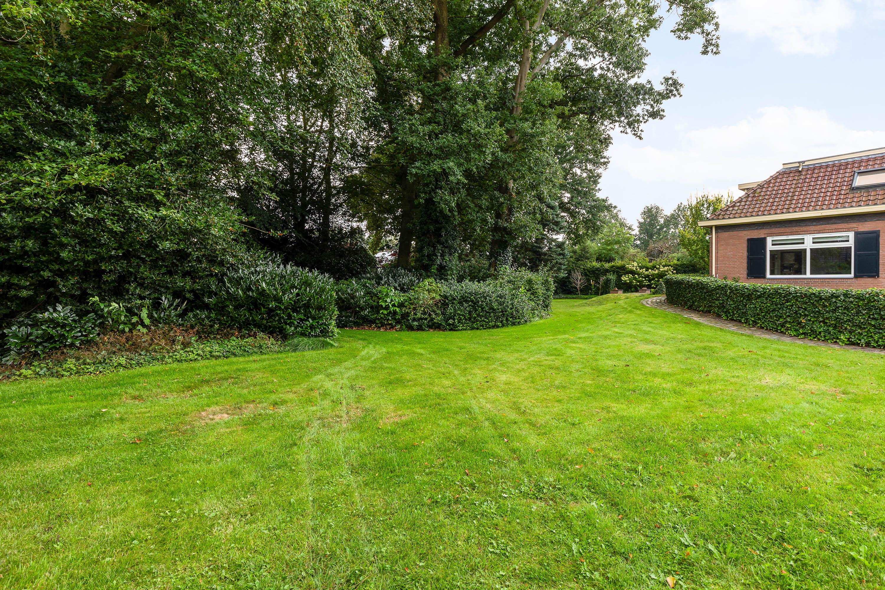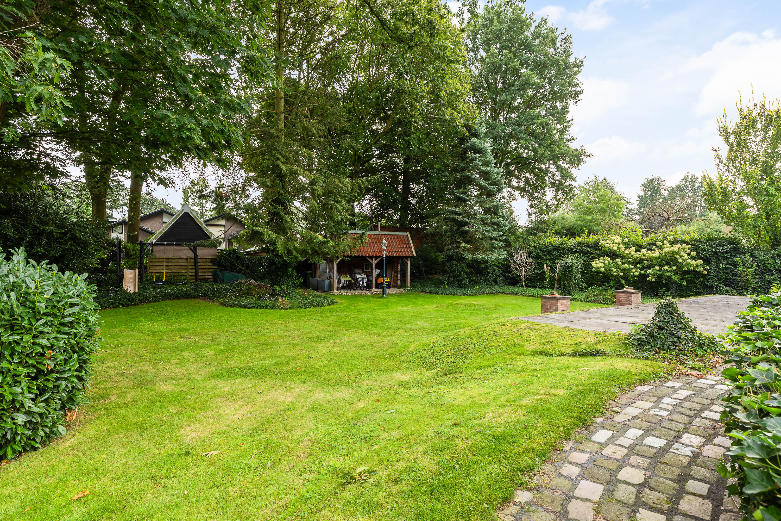 De rondom gelegen tuin is royaal en met zorg aangelegd. Meerdere terrassen bieden ieder een eigen sfeer en mate van privacy. Aan de voorzijde ligt een statige oprijlaan met groenplantsoen, hoge vlaggenmast en acht parkeerplaatsen. Deze leidt naar een vrijstaande garage met berging, carport en een extra parkeerplek. Achterin de tuin bevindt zich een charmante kapschuur met pannendak, ideaal als berging of veranda. Het geheel wordt omlijst door volwassen bomen, sierbestrating, hagen en een ruim gazon – perfect voor ontspanning en buitenleven.