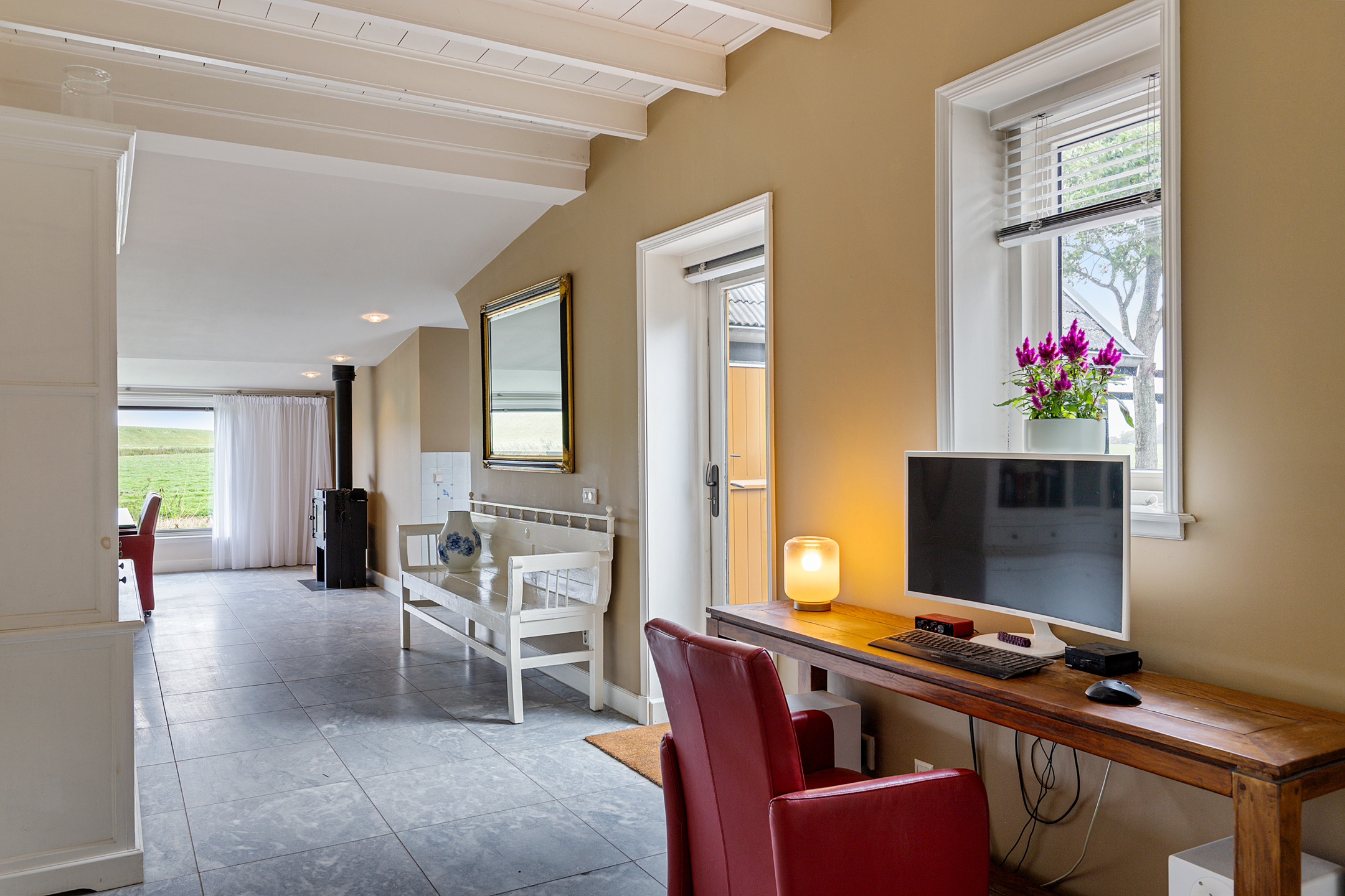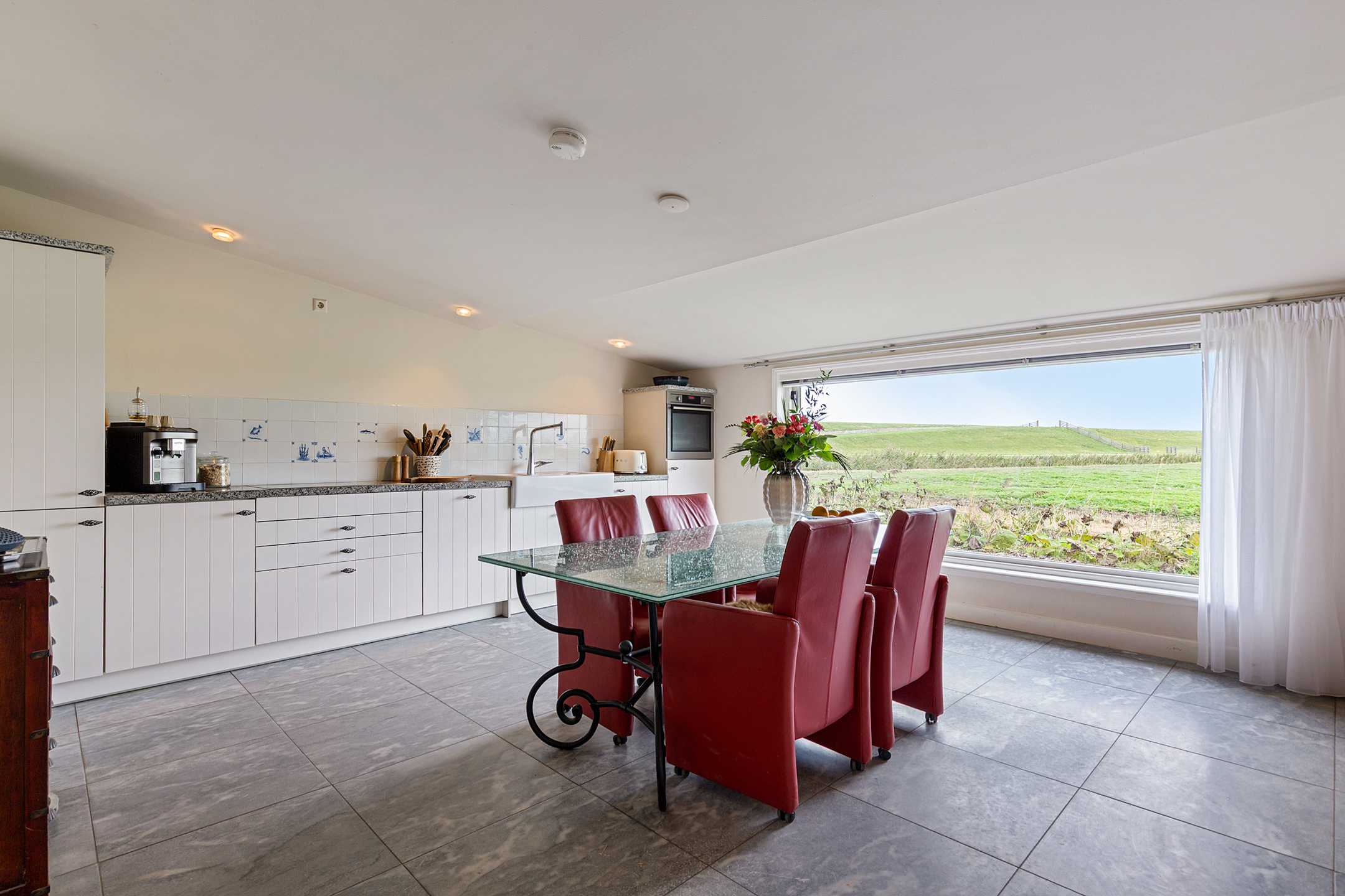 De lichte woonkeuken in de linker vleugel biedt panoramisch zicht op de Waddendijk en landerijen. Een centrale plek om te koken en te tafelen, voorzien van hoogwaardige inbouwapparatuur. Achter de keuken bevindt zich via een gang met prachtige Friese tegelwand de huidige studeerkamer, met deuren naar tuin en badkamer/toilet. Boven de studeerkamer ligt een lichte loft, geschikt als logeerkamer of atelier.