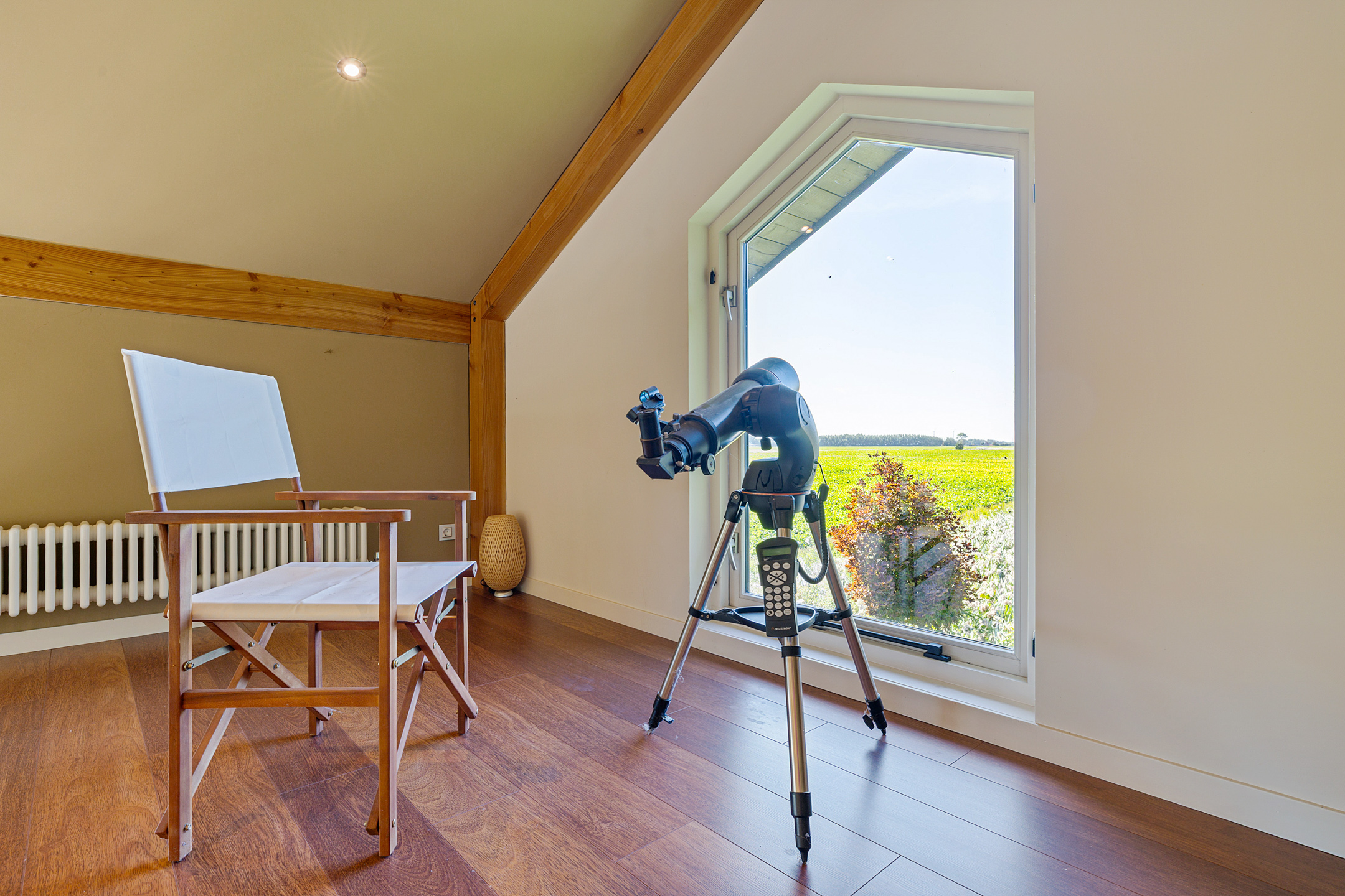Het bijhuis, type schuurwoning (ca 13x4.5m) is onder architectuur gebouwd, volledig geïsoleerd en rondom voorzien van hoge raampartijen (HR++) met panoramisch zicht. De huisje is aan de lange zijde zowel aan de voorkant als aan de achterkant middels openslaande tuindeuren te betreden. Met aan beide zijden terrassen met handgevormde klinkers. De lichte hoge ruimte met stoere douglas spanten in het zicht benadrukken het leven in en met de natuur. Dankzij het dark-sky gebied is de prachtige sterrenhemel helder in volle glorie te zien. Zelfs het Noorderlicht vertoont zich hier geregeld. En wat van de overvliegende zwermen water-, trek- en weidevogels..