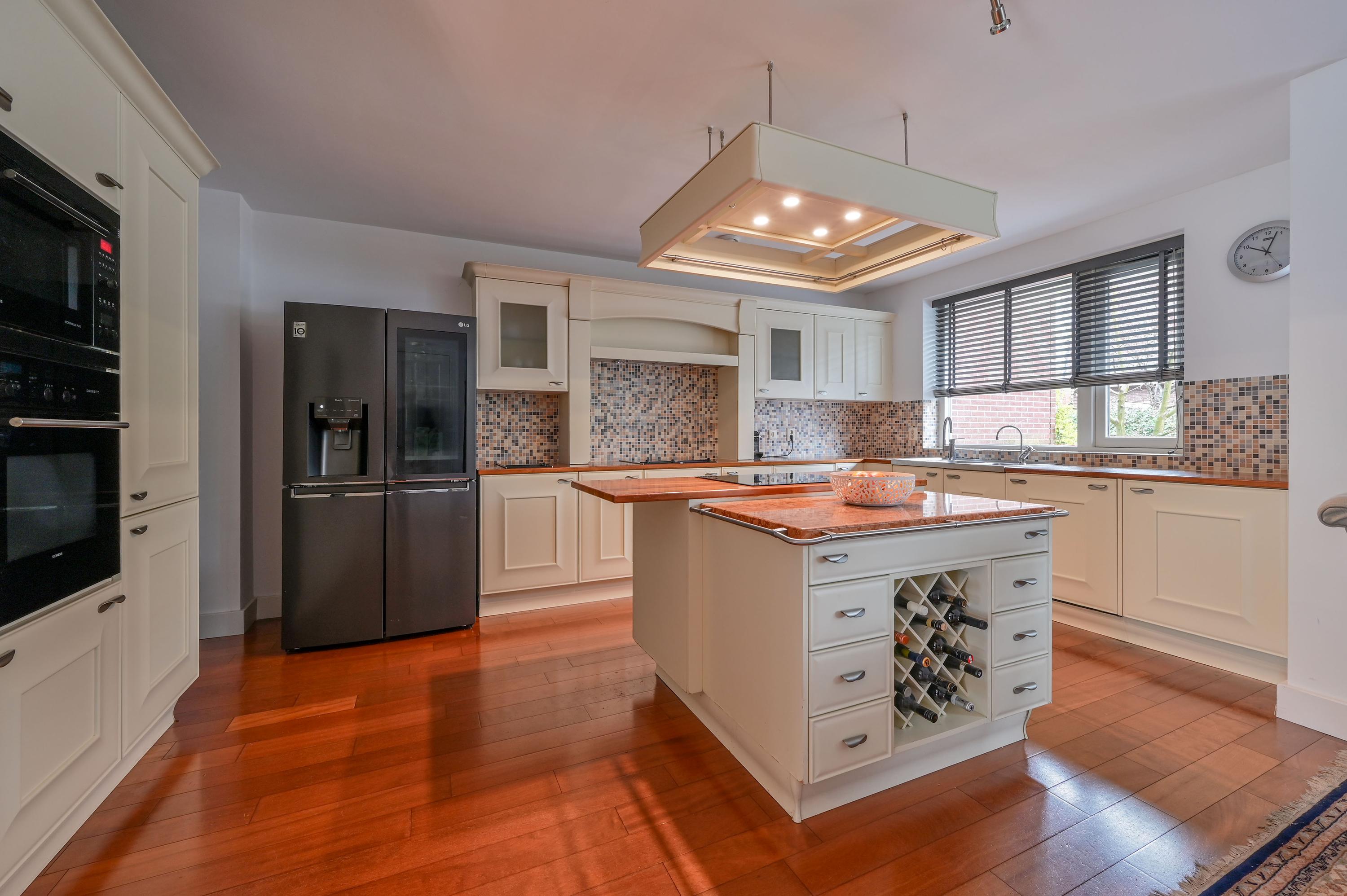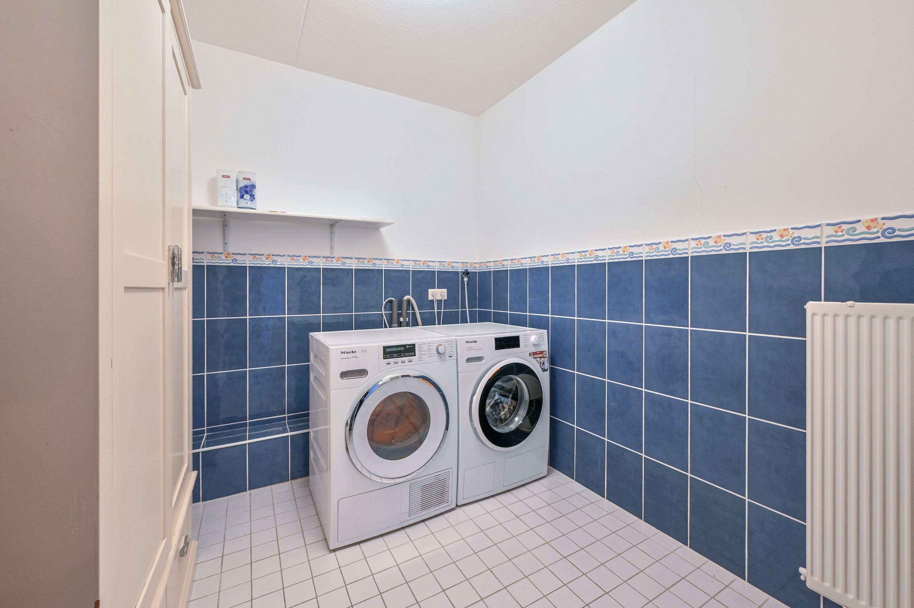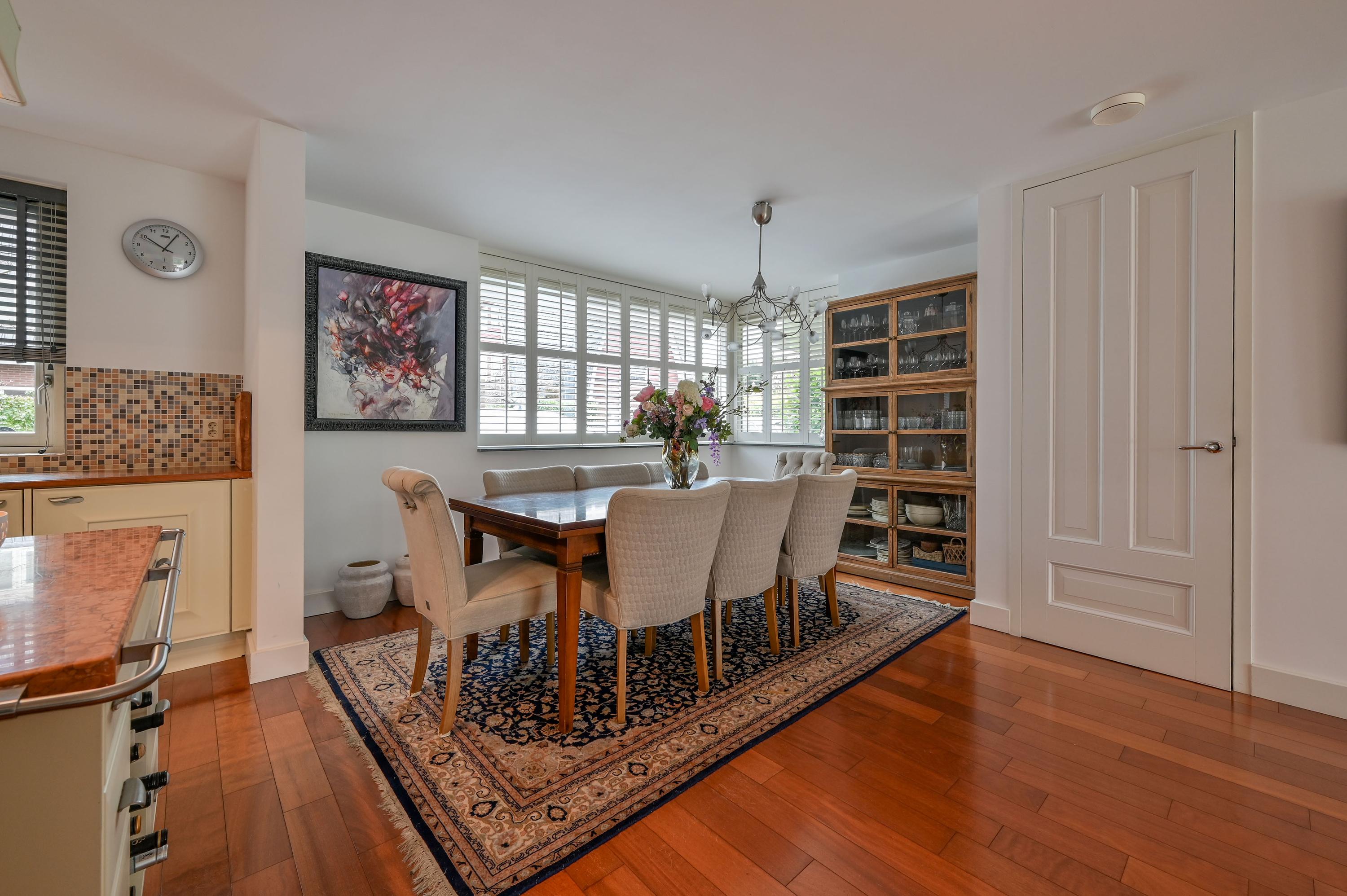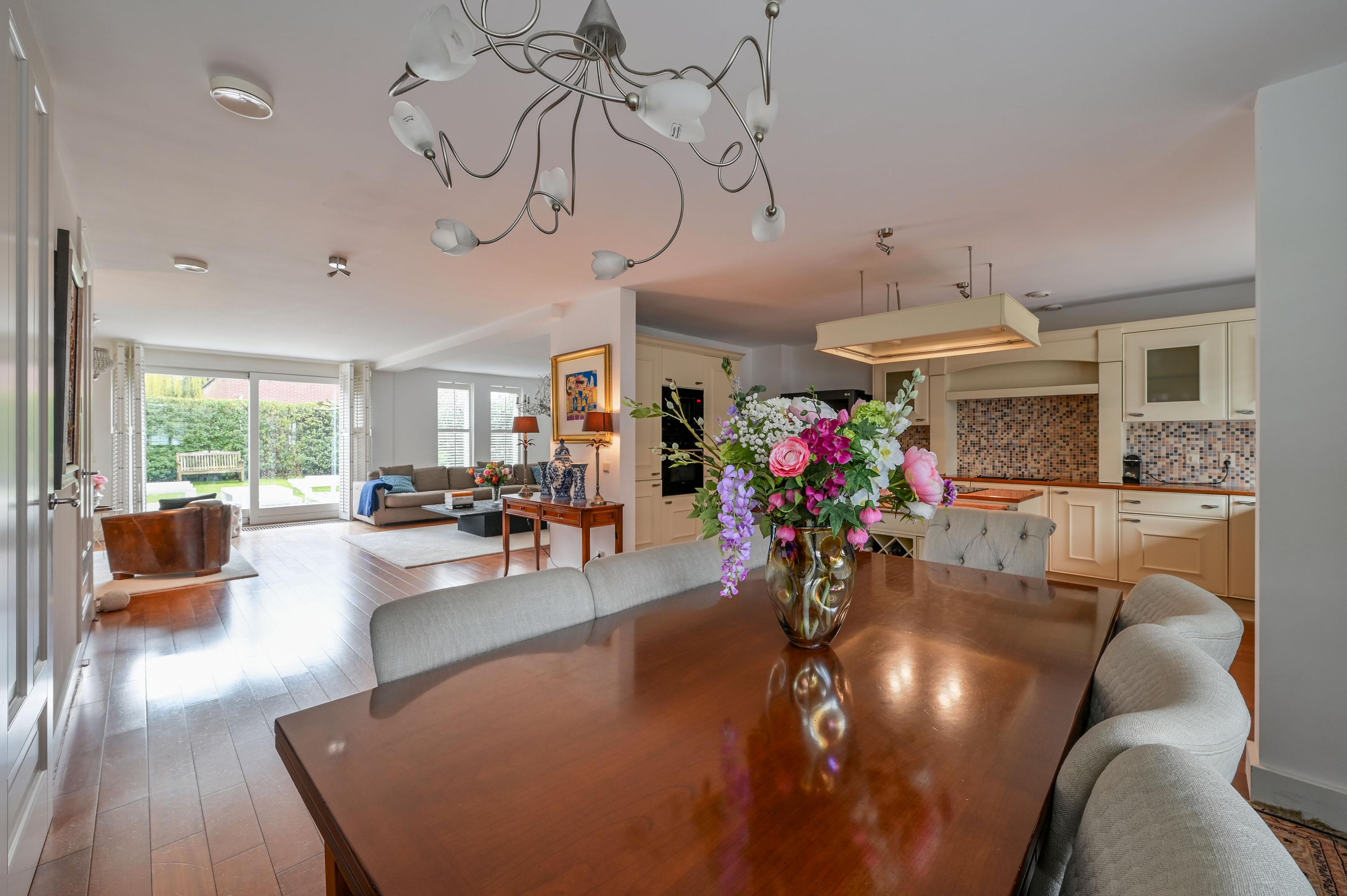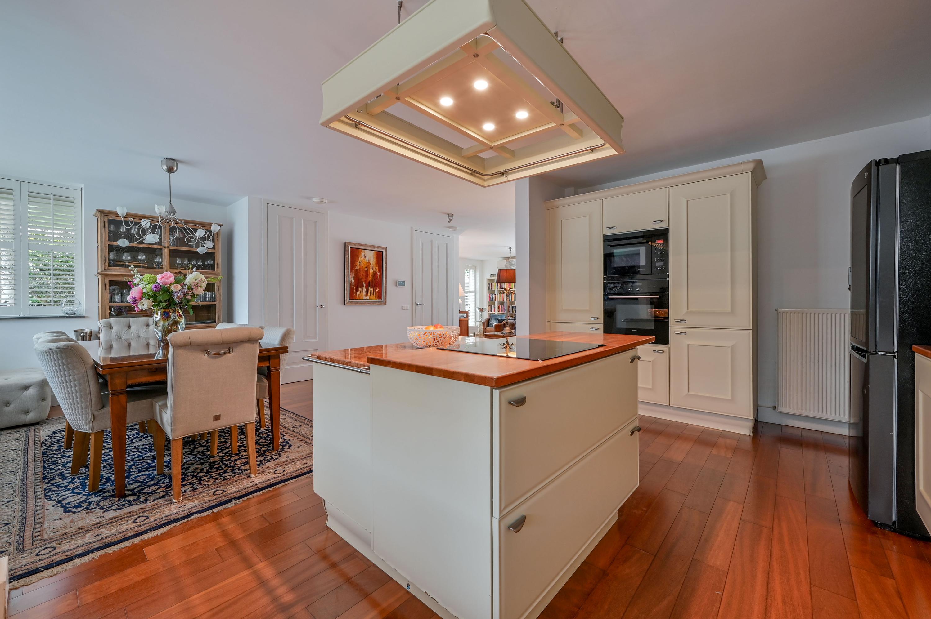 Via de fraai bestraatte voortuin met pad naar de zijkant van de woning, geflankeerd door statige platanen, bereik je de voordeur. De representatieve, royale hal straalt direct een verzorgde afwerking uit en biedt toegang tot het moderne toilet met fontein, de meterkast en de vaste trap naar de eerste verdieping. Een stijlvolle dichte deur leidt naar de indrukwekkende leefruimte, waar de woonkamer en de open woonkeuken naadloos in elkaar overlopen. De keuken aan de voorzijde is licht en ruim, met grote raampartijen en een hoekraam bij de eethoek voorzien van sfeervolle shutters – een ideale plek om gezellig te dineren. De landelijke keuken beschikt over een centraal kookeiland met inductiekookplaat en praktische lades aan beide zijden, aangevuld met een elegant wijnrek. Het L-vormige werkblad biedt volop ruimte en is uitgerust met luxe inbouwapparatuur, waaronder grillplaat, frituur met afzuigkap en ingebouwde keukenmachine. Aan de raamzijde bevindt zich de spoelzone met dubbele spoelbak, Quooker en vaatwasser. Een royale kastenwand met combimagnetron, extra oven aan de andere zijde van de keuken met daarnaast nog ruimte voor een grote dubbele koel-/vriescombinatie met ijsmachine (ter overname) maakt het geheel compleet. Onder de trap is bovendien een handige kast voor garderobe en extra opslag.