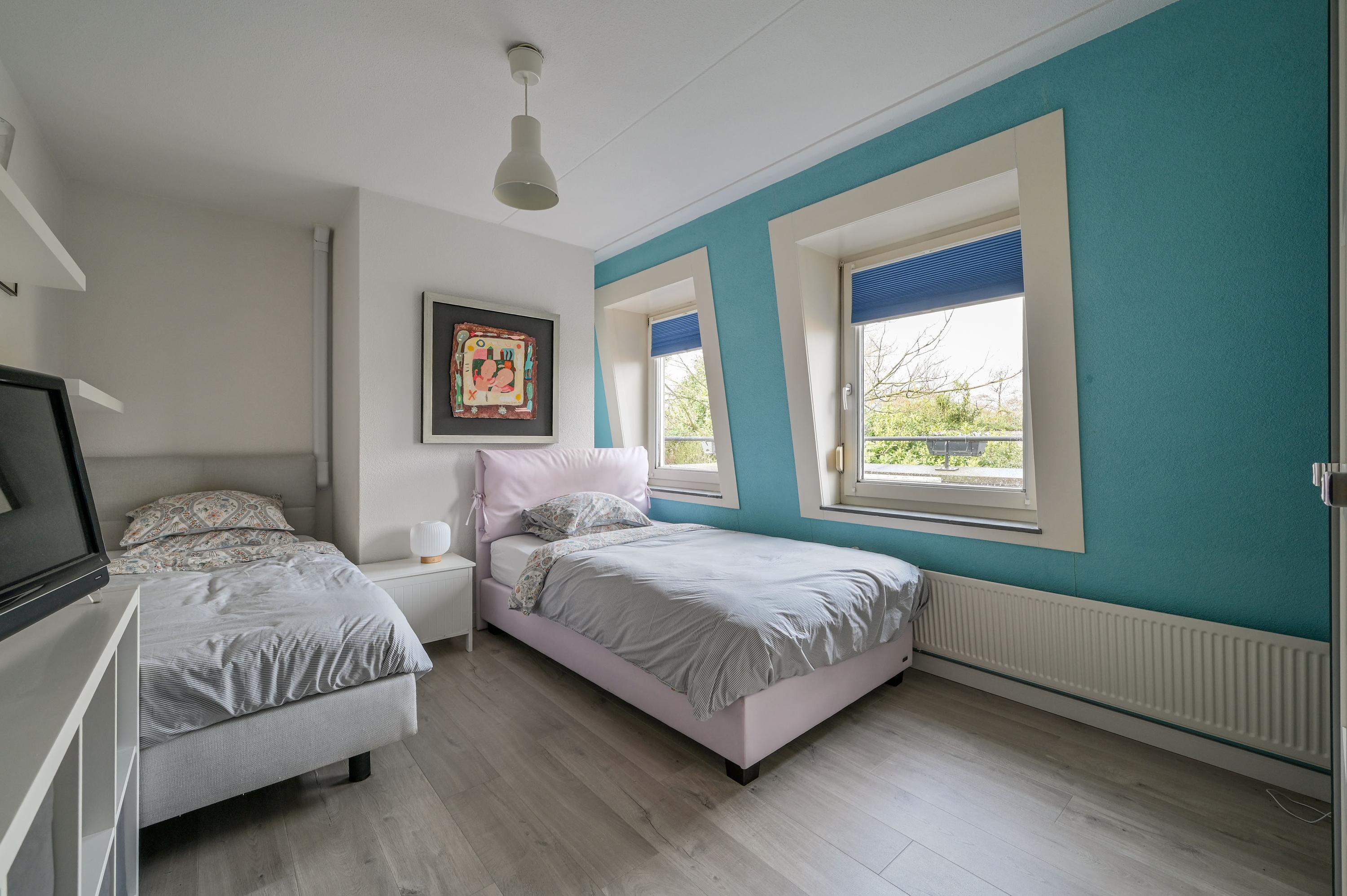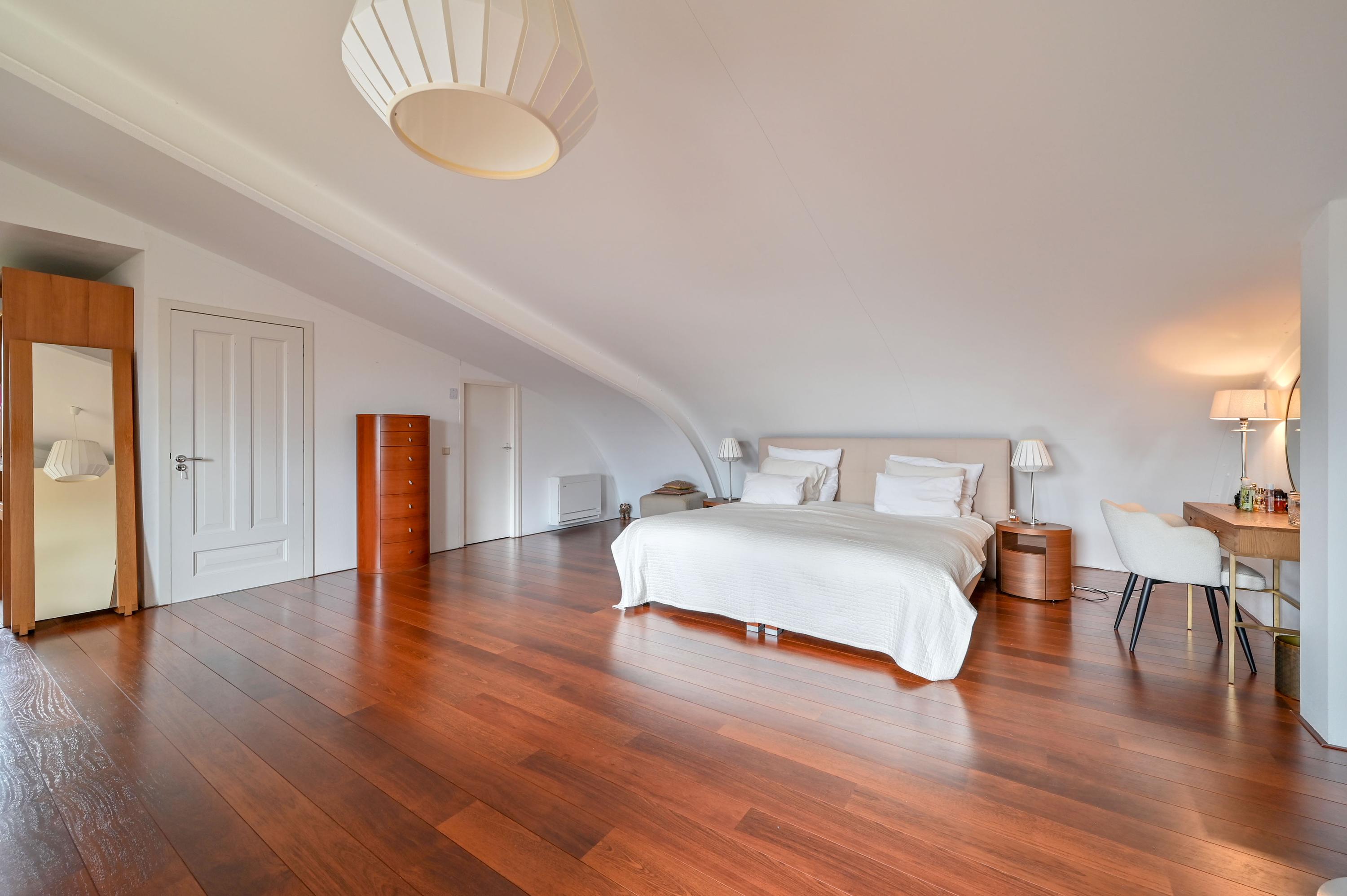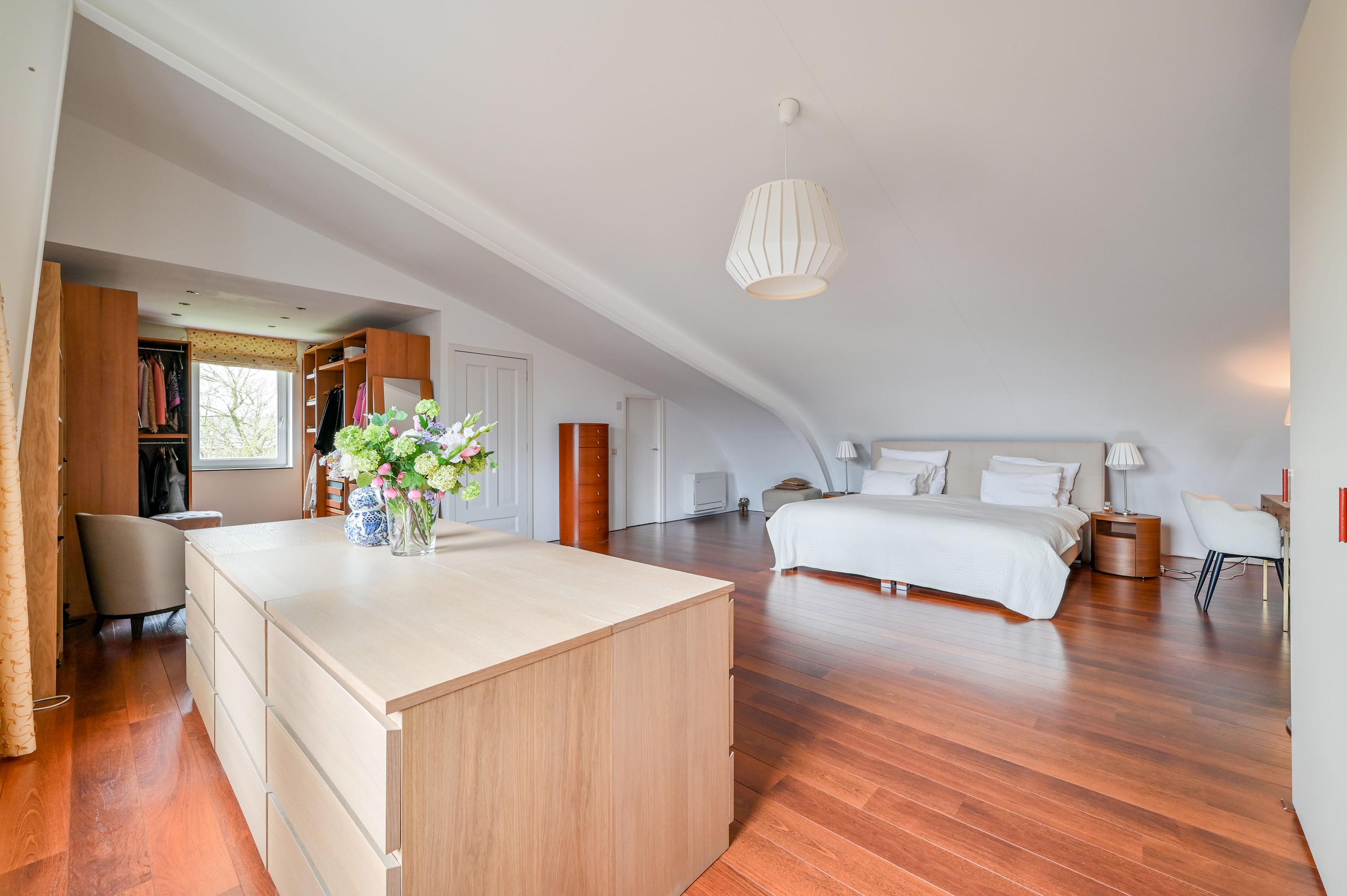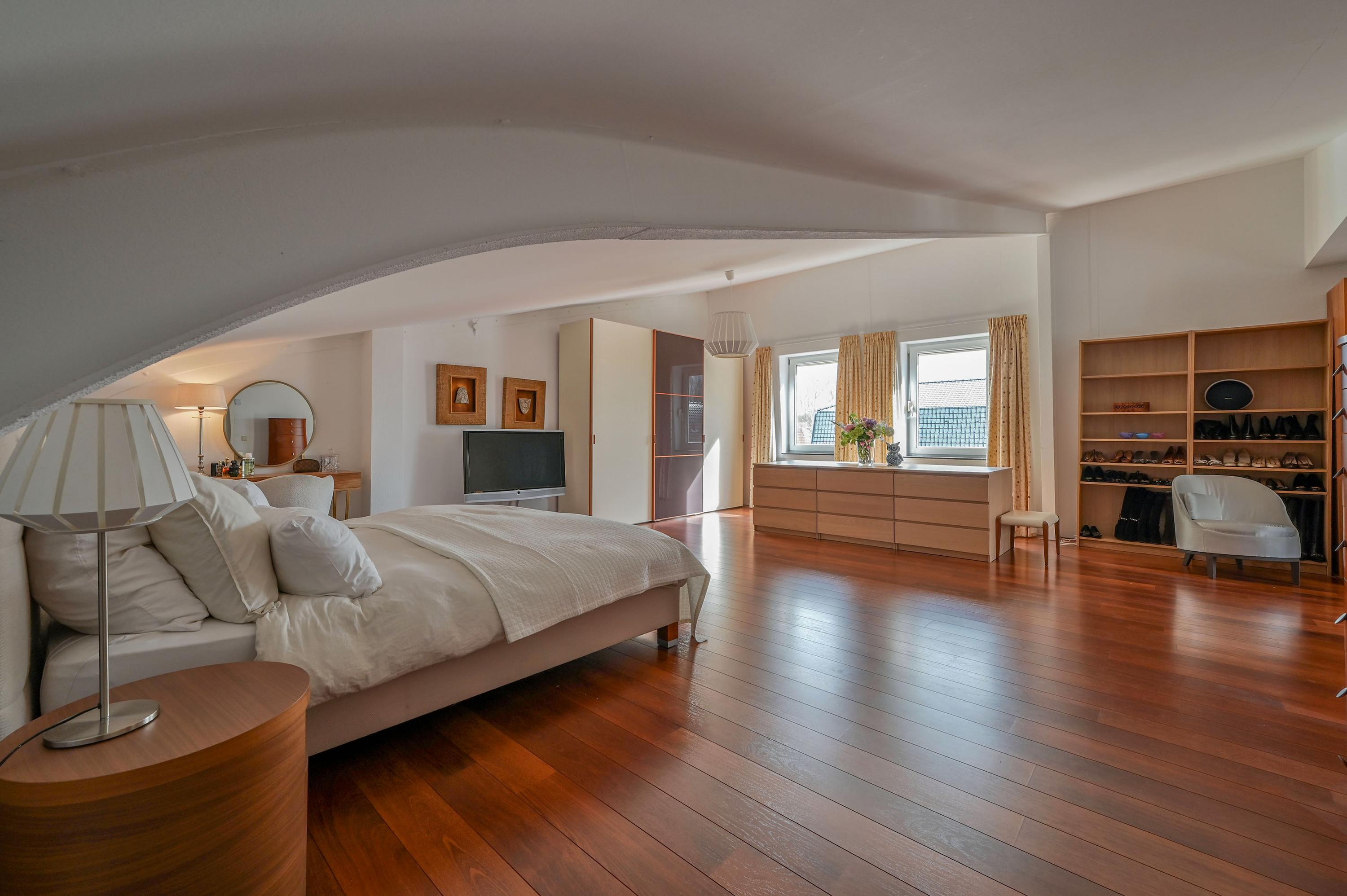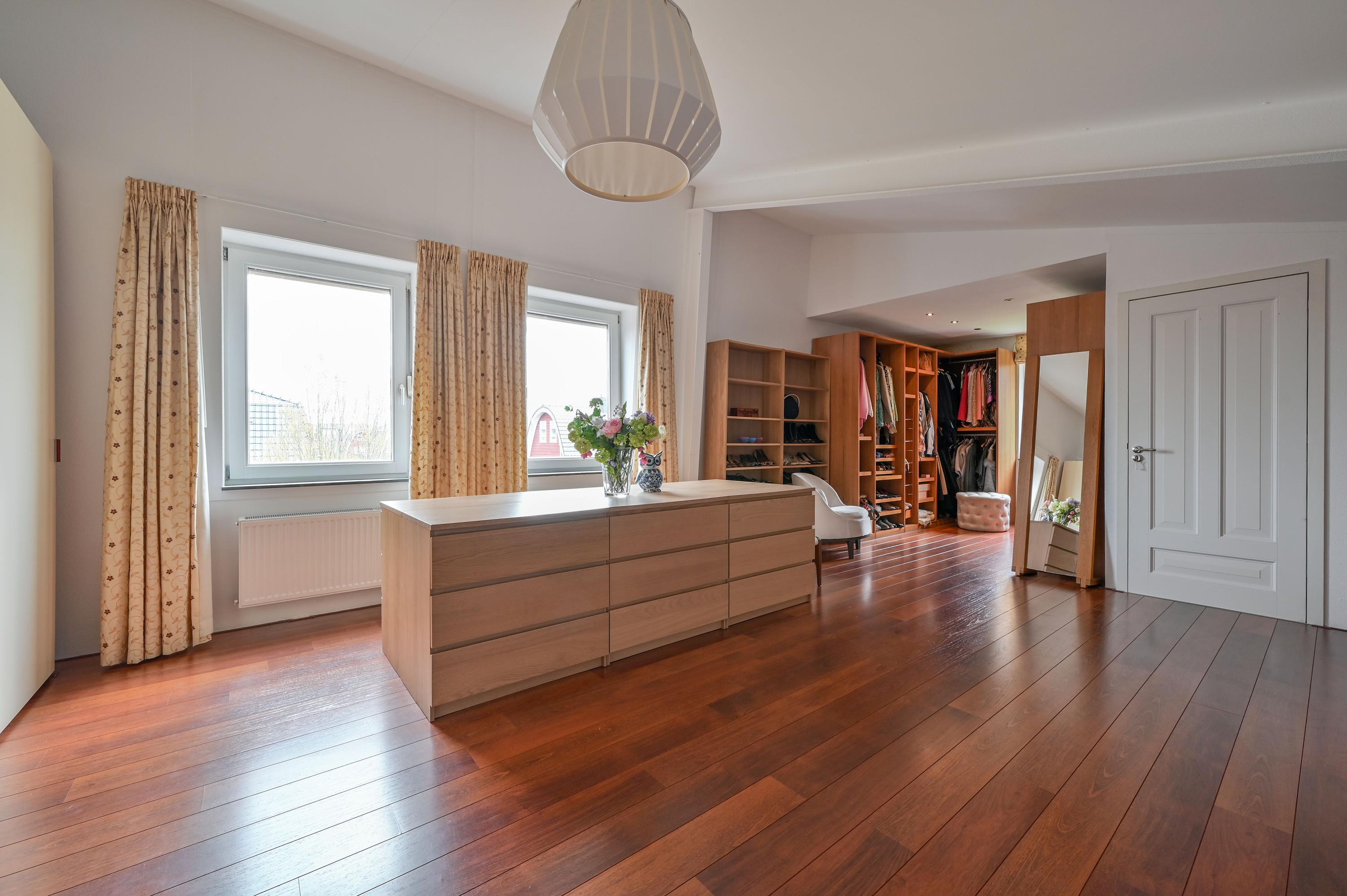 Via een open trap kom je op de tweede verdieping, waar de master bedroom een ware blikvanger is. Deze royale kamer biedt volop mogelijkheden voor een luxe en praktische indeling. De kamer beschikt over een open inloopkast met raam en uitzicht over de zijkant van de tuin, én een vaste kastenwand – beide van het Italiaanse merk Poliform – waardoor stijlvol en efficiënt opbergen gegarandeerd is. Twee ramen aan de voorzijde en het zijraam zorgen voor veel natuurlijk licht en zijn voorzien van sunscreens. Laminaat en airconditioning maken het geheel af. Deze royale verdieping biedt vanwege de grootte nog extra mogelijkheden om de indeling te veranderen met bijvoorbeeld twee zolderkamers. Daarnaast is er een ruime berging met CV-opstelling en mechanische ventilatie unit, ideaal voor extra opslag en praktische voorzieningen.