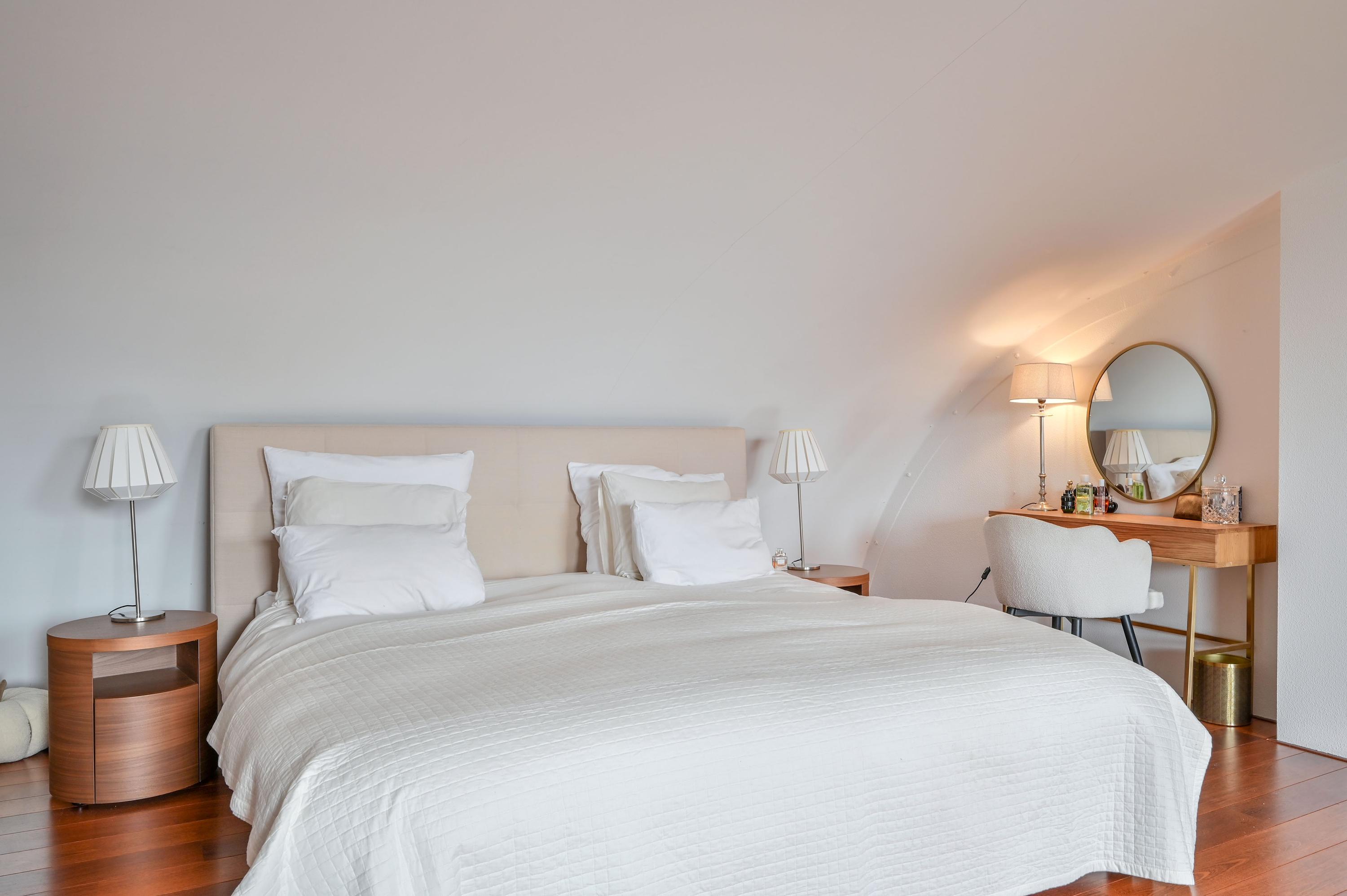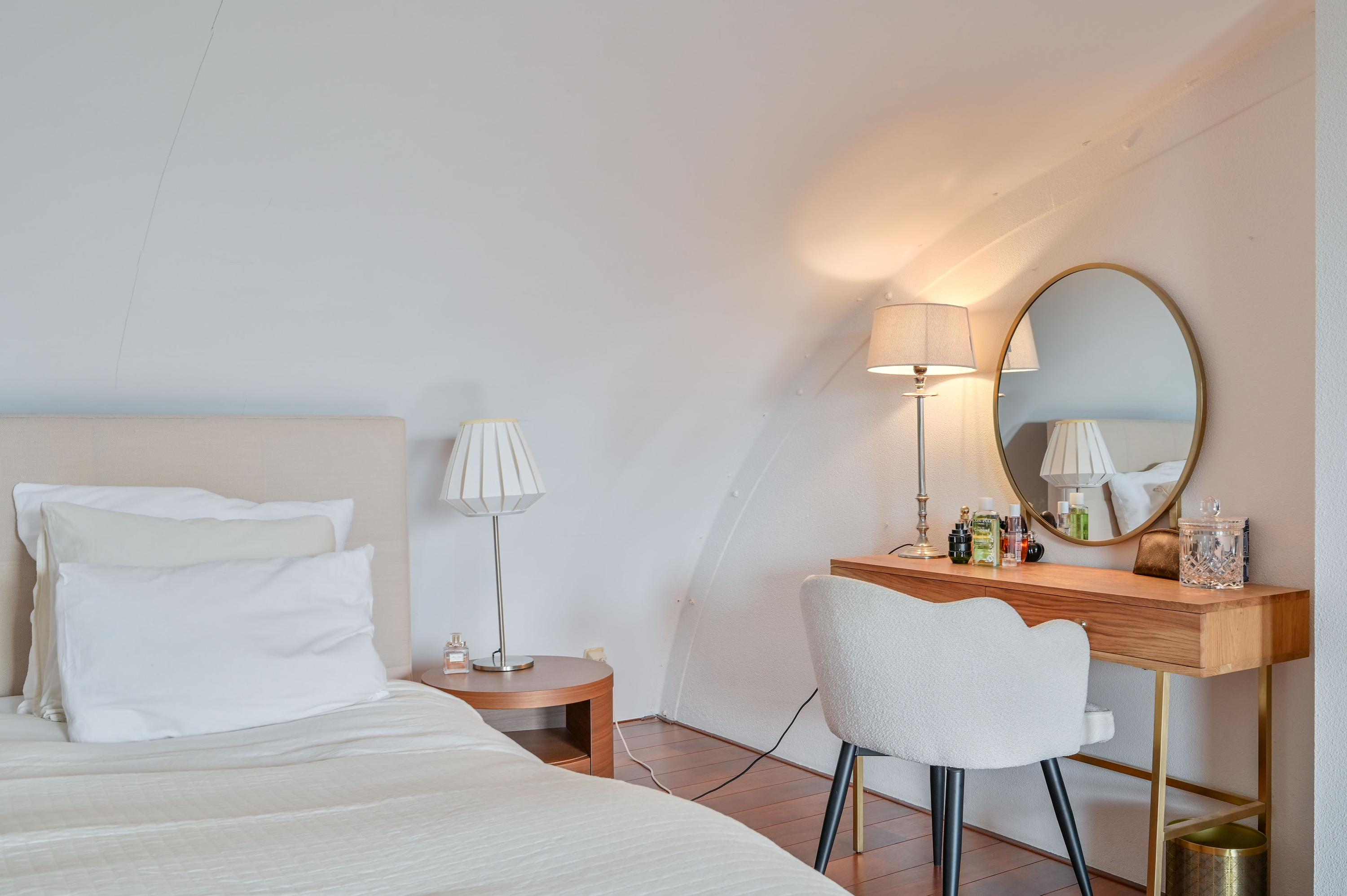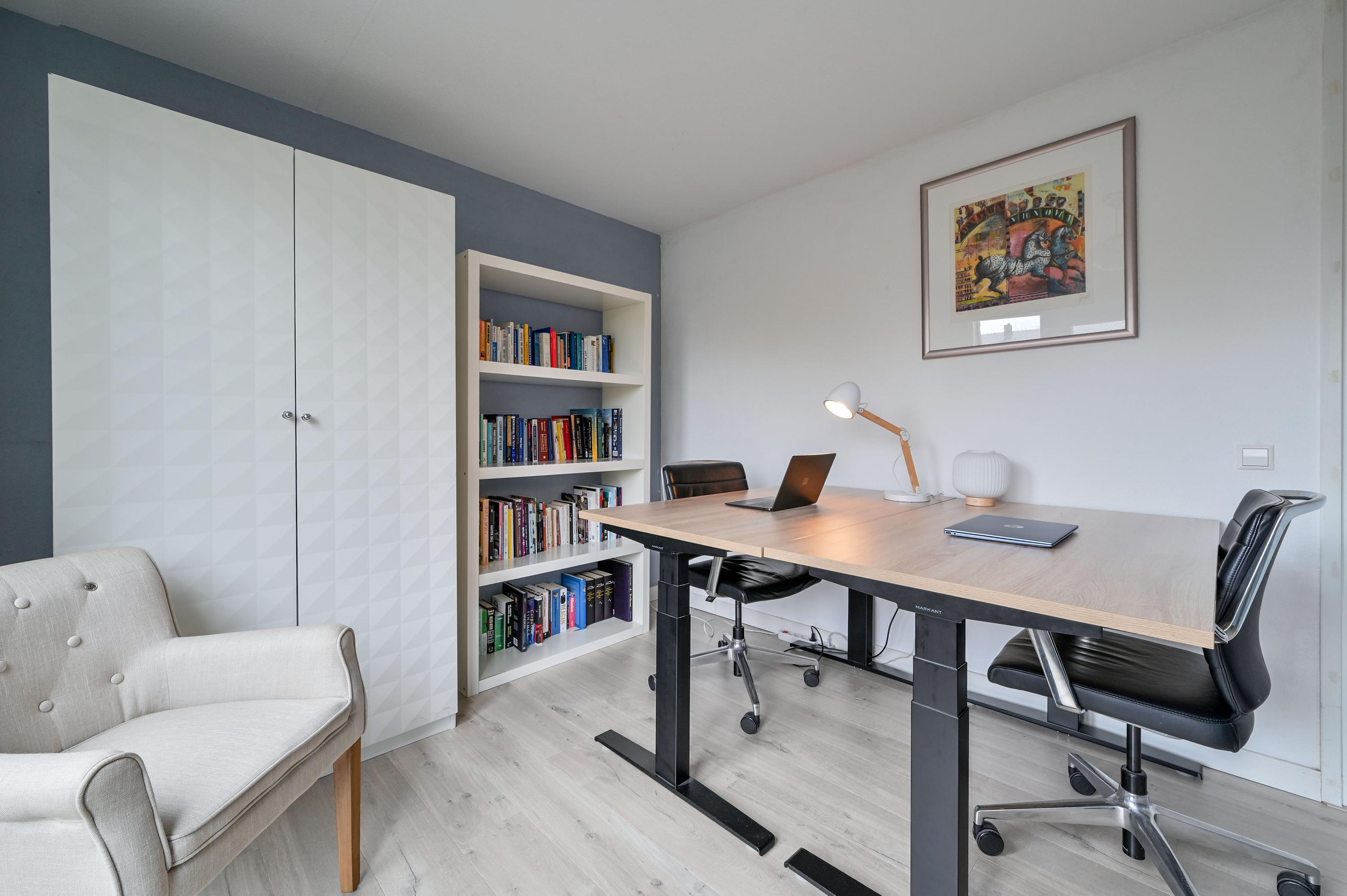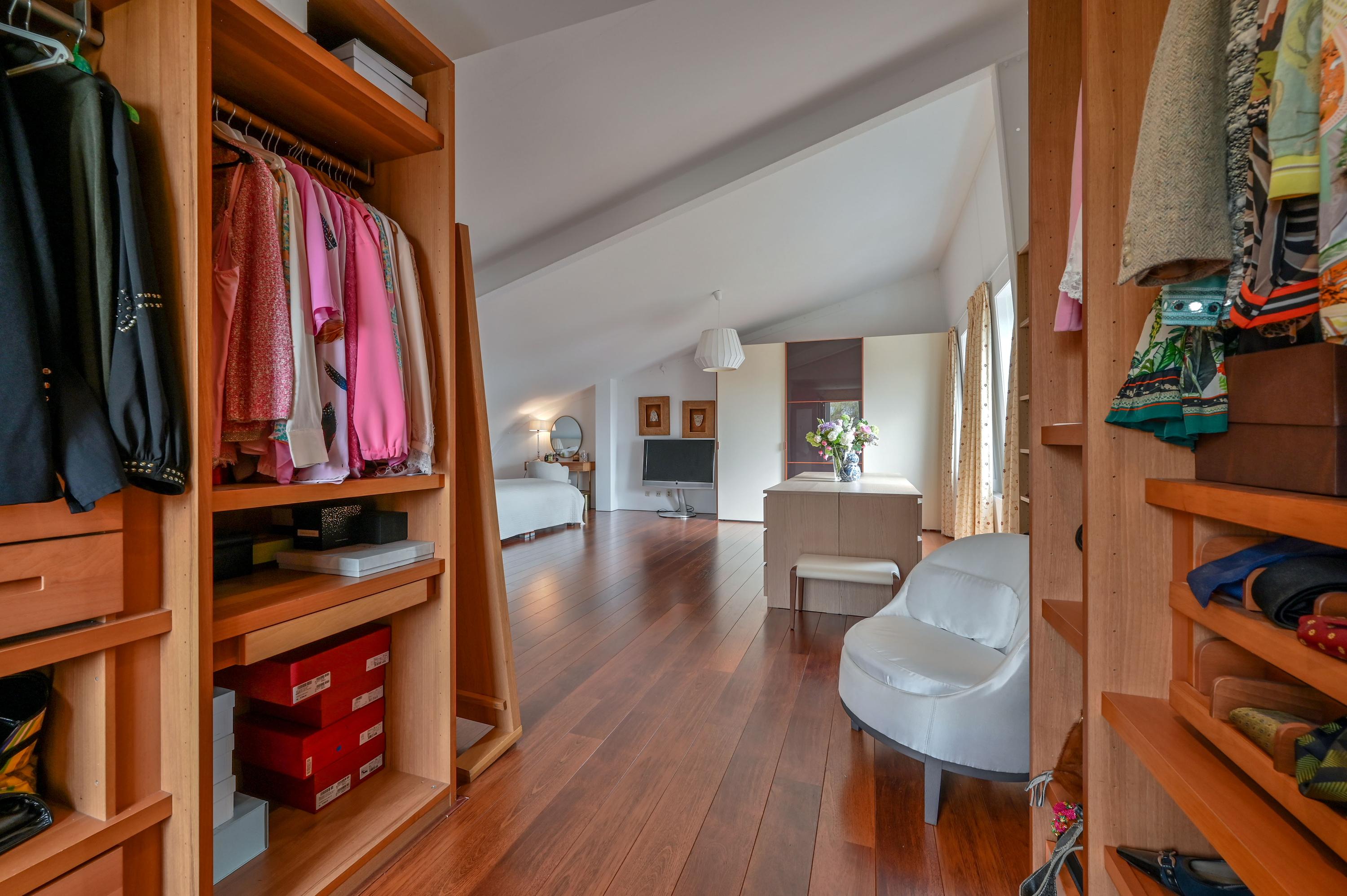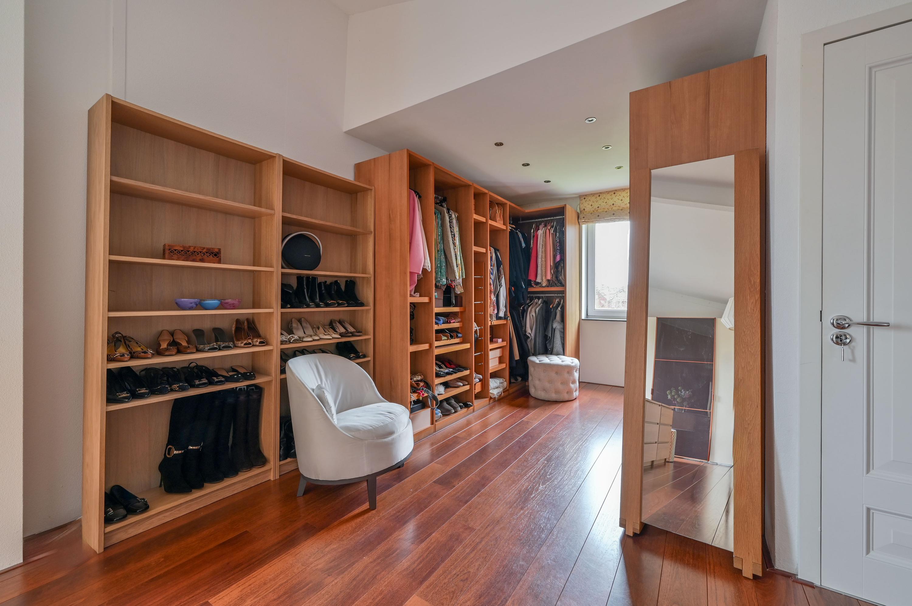 Via een open trap kom je op de tweede verdieping, waar de master bedroom een ware blikvanger is. Deze royale kamer biedt volop mogelijkheden voor een luxe en praktische indeling. De kamer beschikt over een open inloopkast met raam en uitzicht over de zijkant van de tuin, én een vaste kastenwand – beide van het Italiaanse merk Poliform – waardoor stijlvol en efficiënt opbergen gegarandeerd is. Twee ramen aan de voorzijde en het zijraam zorgen voor veel natuurlijk licht en zijn voorzien van sunscreens. Laminaat en airconditioning maken het geheel af. Deze royale verdieping biedt vanwege de grootte nog extra mogelijkheden om de indeling te veranderen met bijvoorbeeld twee zolderkamers. Daarnaast is er een ruime berging met CV-opstelling en mechanische ventilatie unit, ideaal voor extra opslag en praktische voorzieningen.