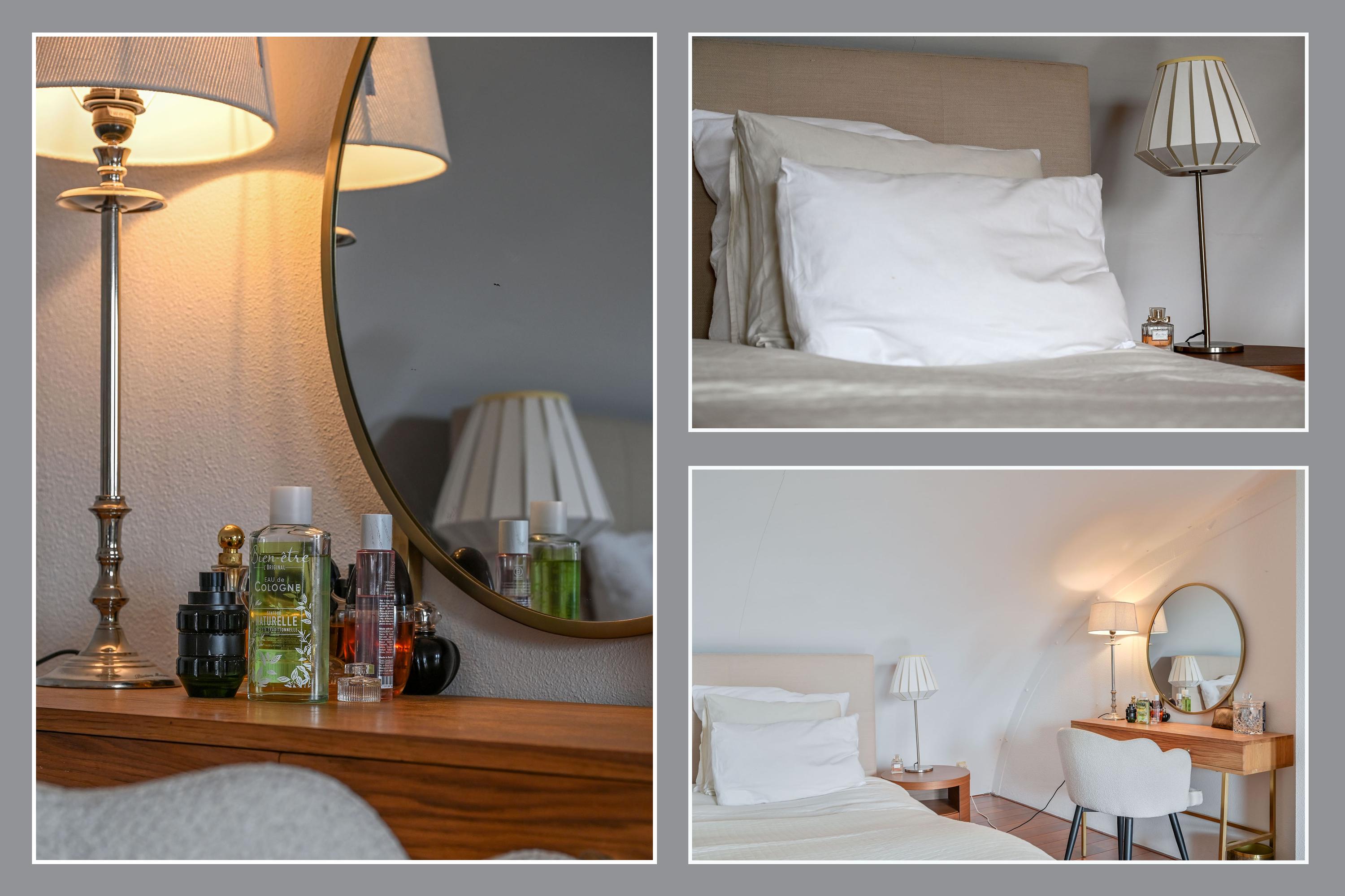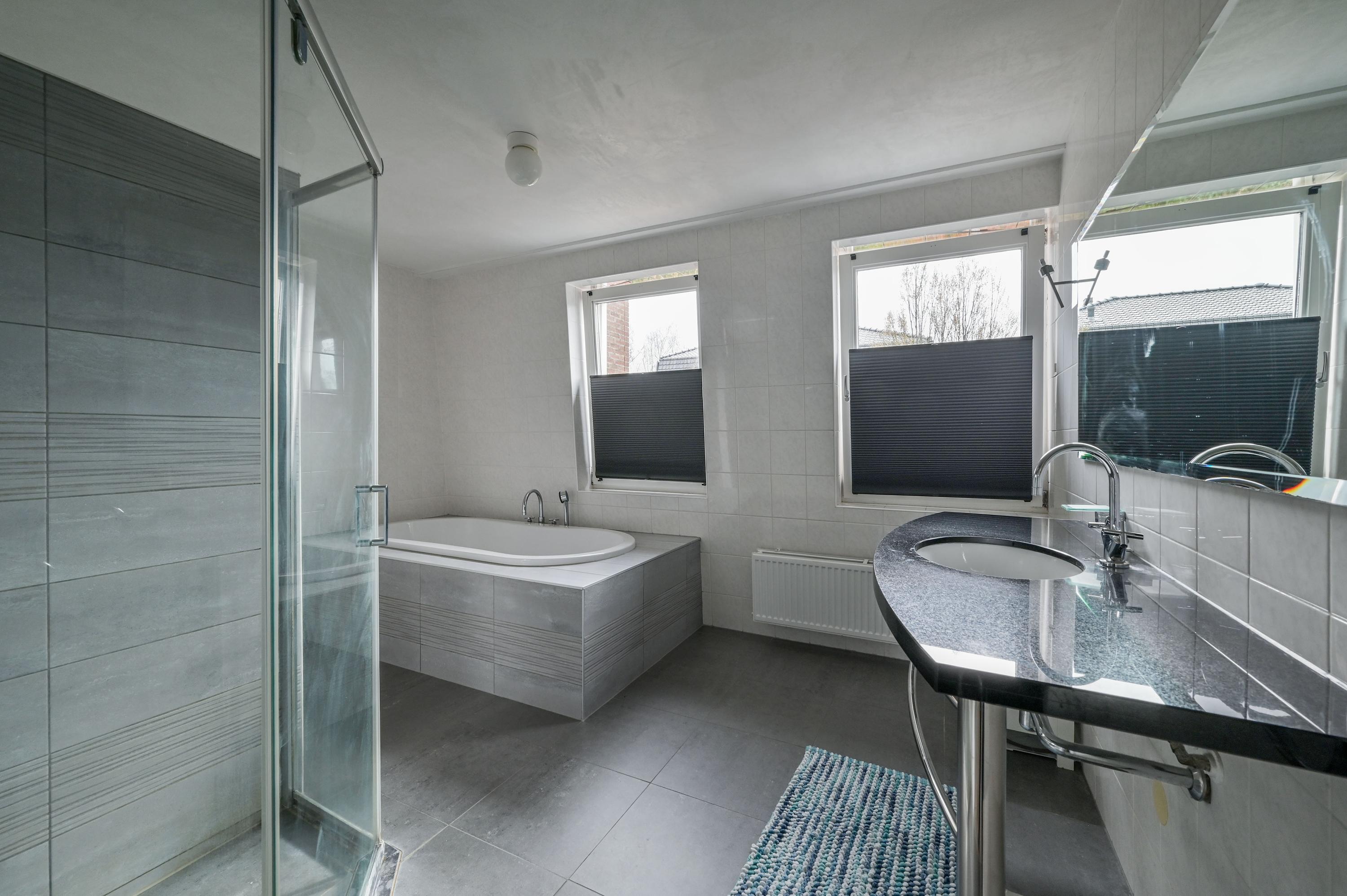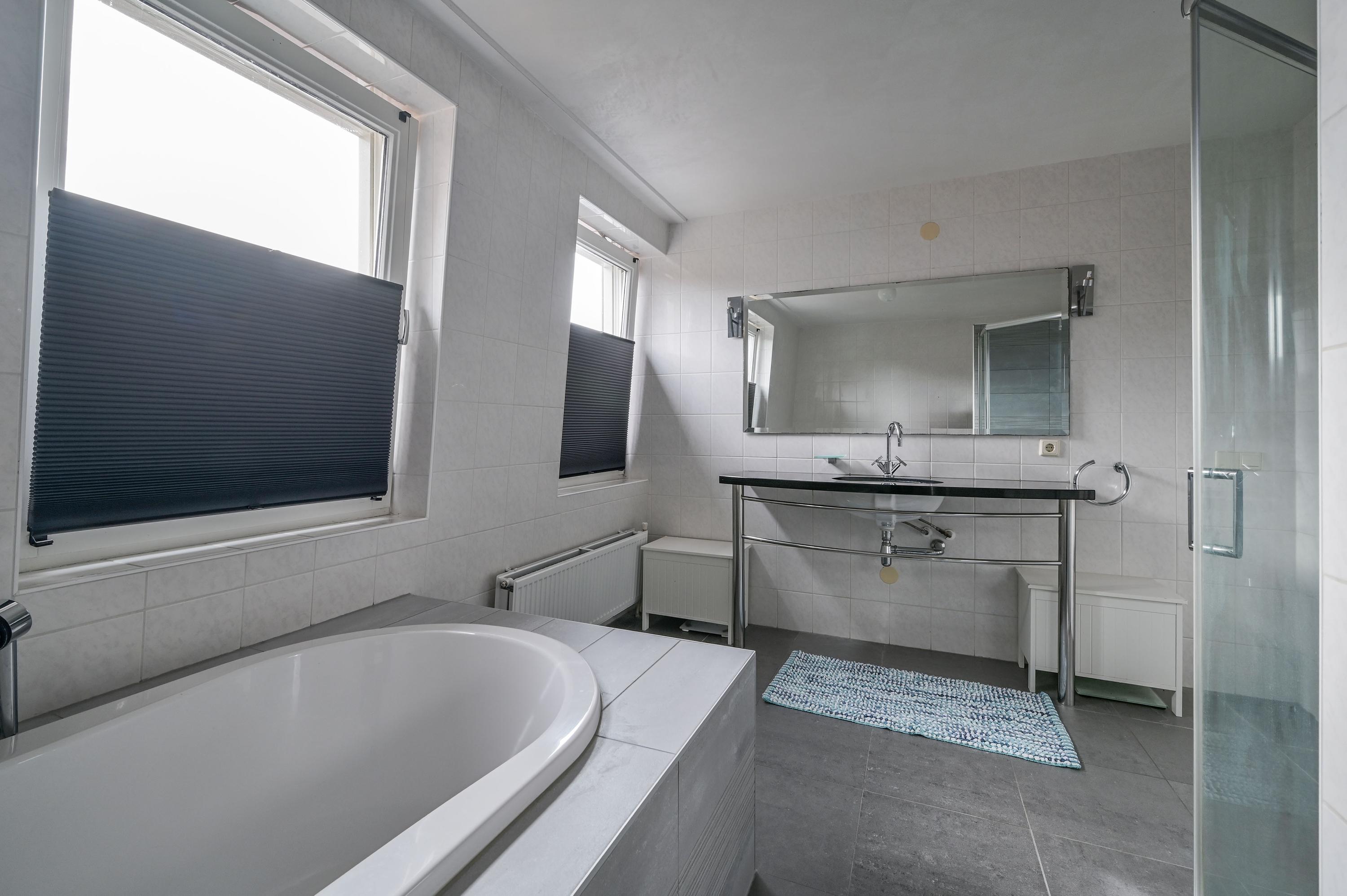 De ruime hal van de eerste verdieping biedt toegang tot drie grote slaapkamers, de stijlvolle badkamer en de praktische waskamer. De ruime L-vormige slaapkamer aan de voorzijde heeft twee grote ramen en een zijraam met uitzicht op de tuin. De naastgelegen badkamer is uitgerust met een royaal ligbad, moderne douchecabine, verlichte wastafel, toilet en bidet – een ruimte die luxe en functionaliteit perfect combineert.