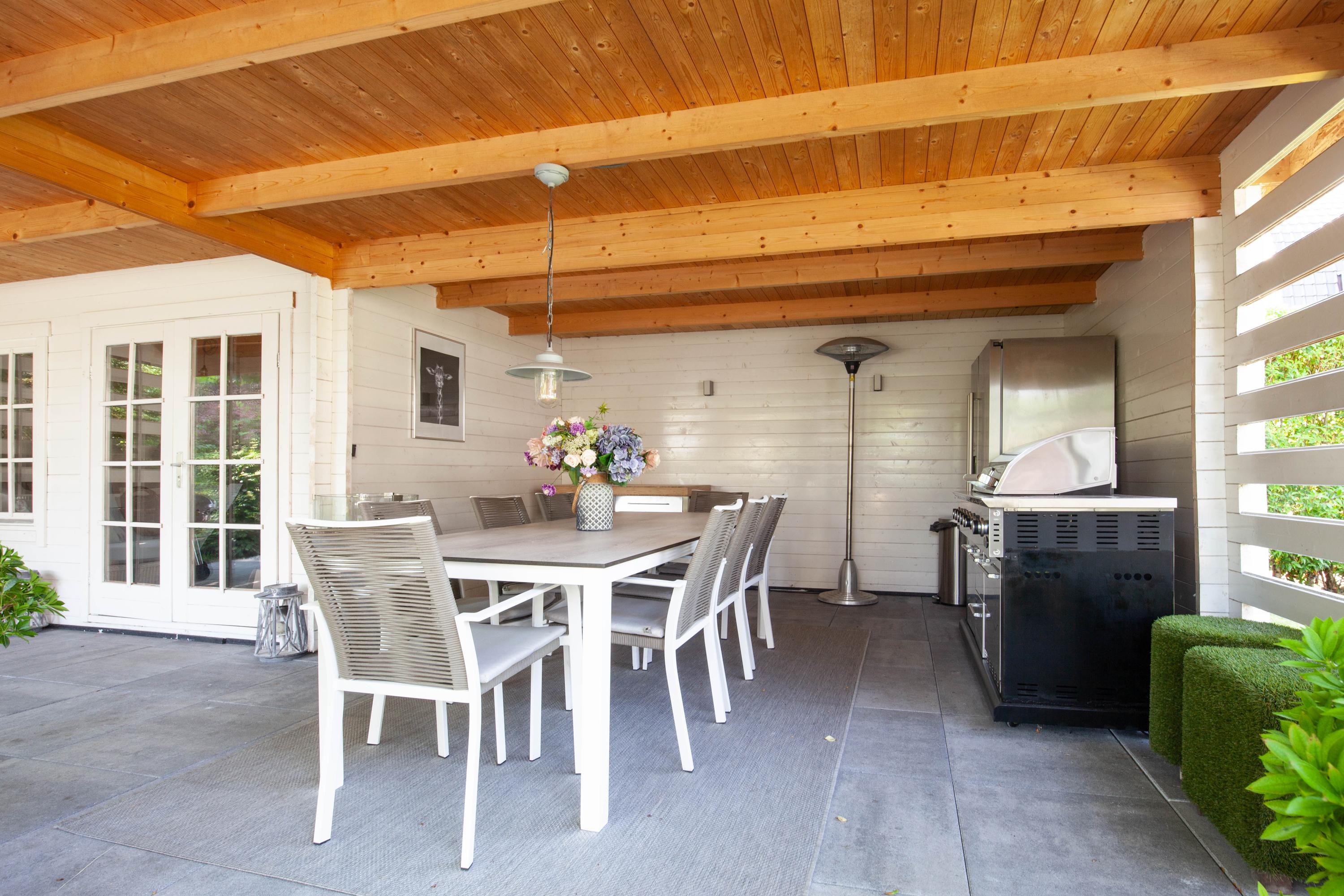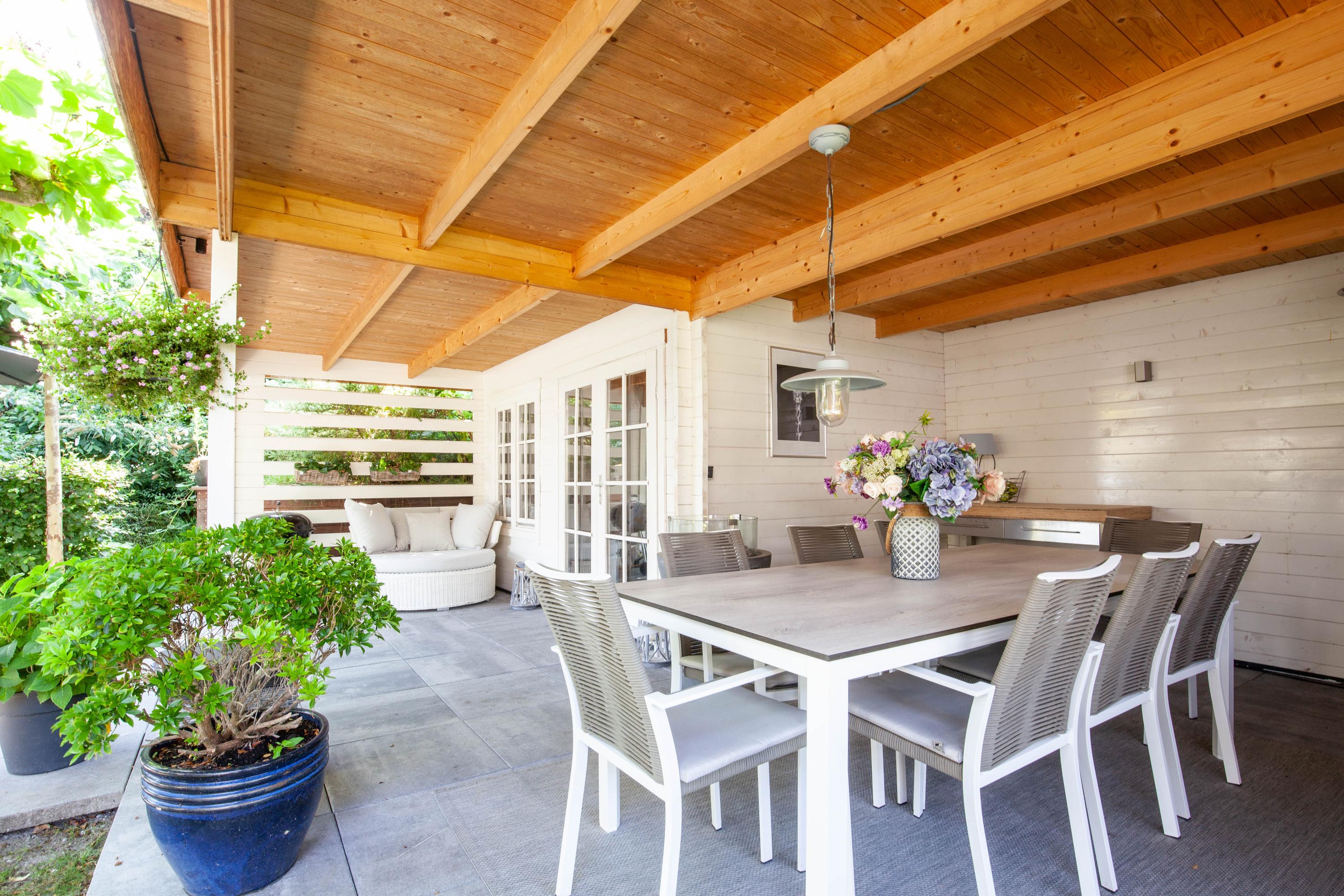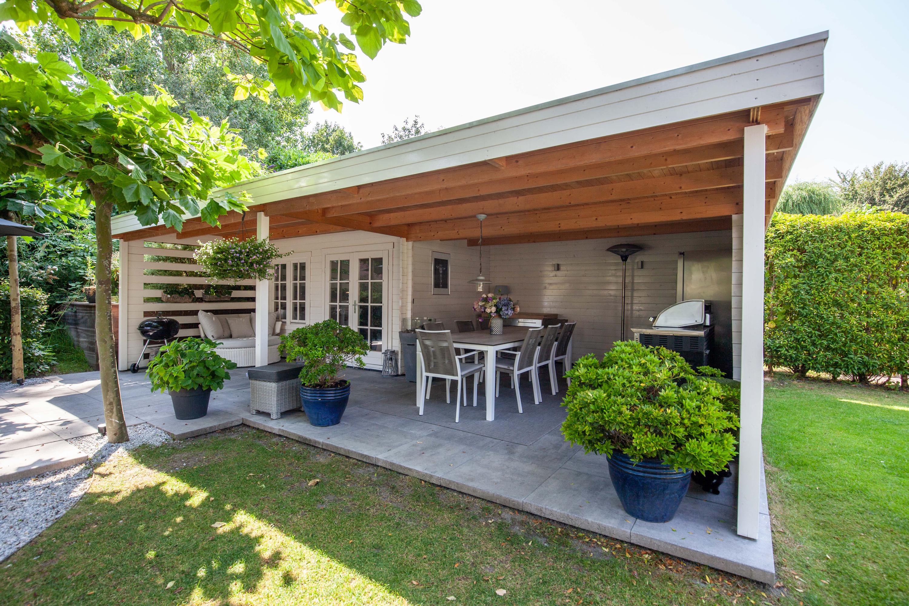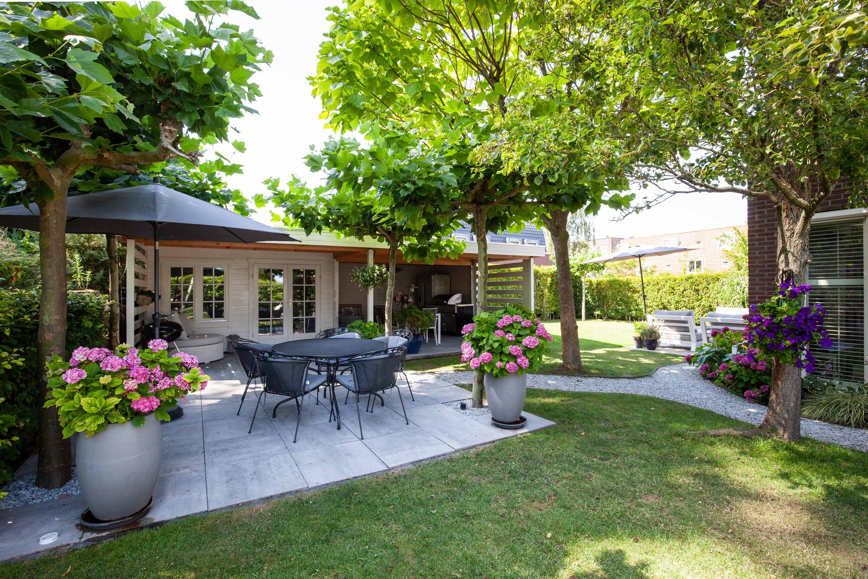 De prachtige tuin is een waar buitenparadijs, direct bereikbaar via de schuifpui in de woonkamer en via de zijkant van de woning via een fraai open hekwand. De tuin biedt veel privacy en geniet de gehele dag van zon, ideaal om volop van buiten te genieten. Aan de achterzijde van de woning ligt een ruim terras met een sfeervolle zithoek, compleet met een uitvalscherm over de gehele breedte van de woning, ideaal om van zowel zon als schaduw te genieten. Achterin de tuin staat een charmant tuinhuis met overkapping, perfect voor een eethoek met barbecue. Het tuinhuis is voorzien van een nette houten vloer, elektriciteit en water, waardoor het uitstekend te gebruiken is als werkruimte, hobbyruimte of voor opslag. Aansluitend aan de overkapping bevindt zich een extra terras met zitruimte, beschut door een natuurlijke overkapping van vier prachtige platanen, waardoor een idyllische plek ontstaat om te ontspannen of gasten te ontvangen.