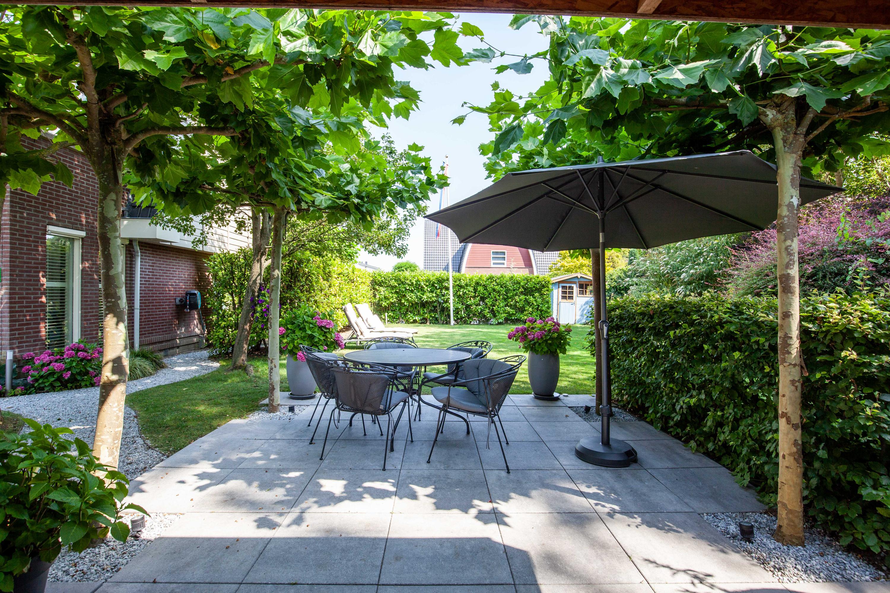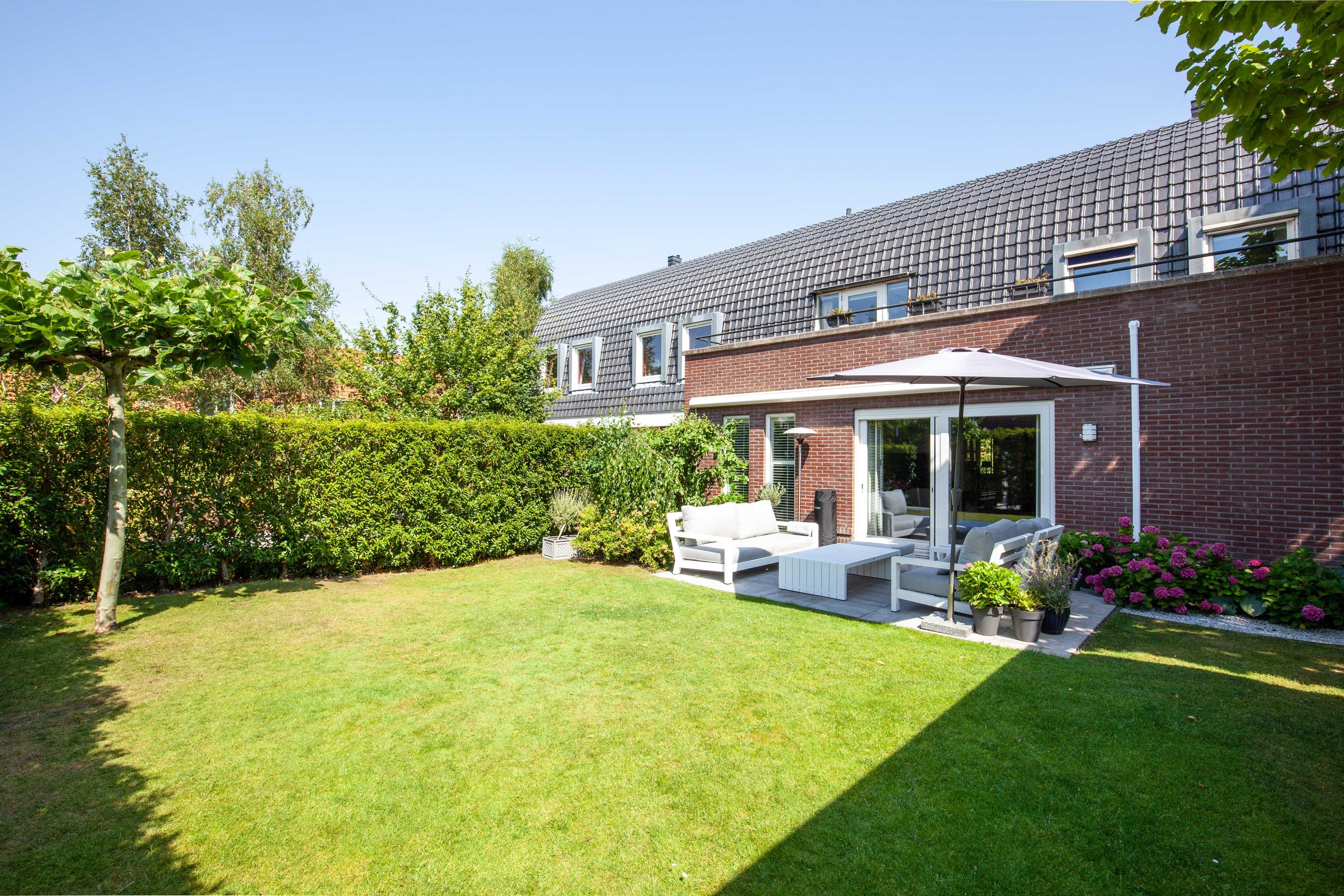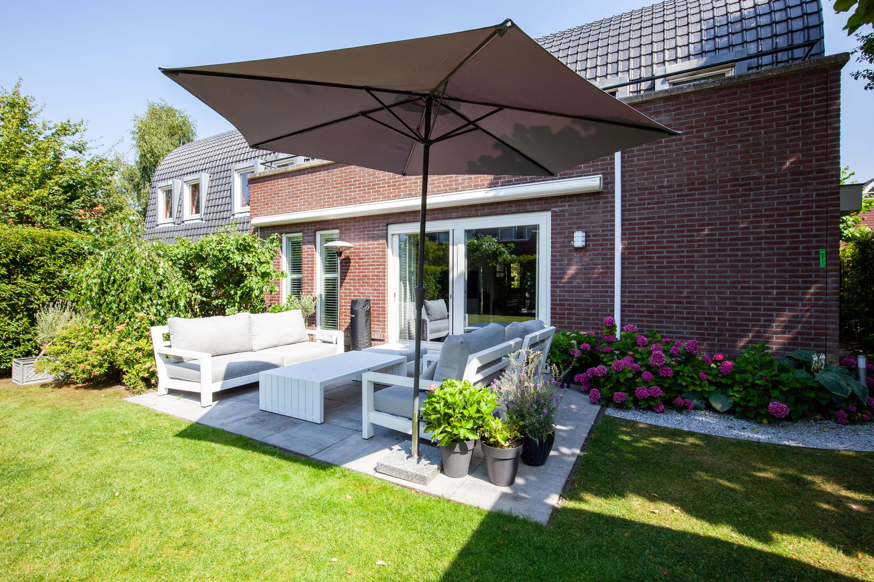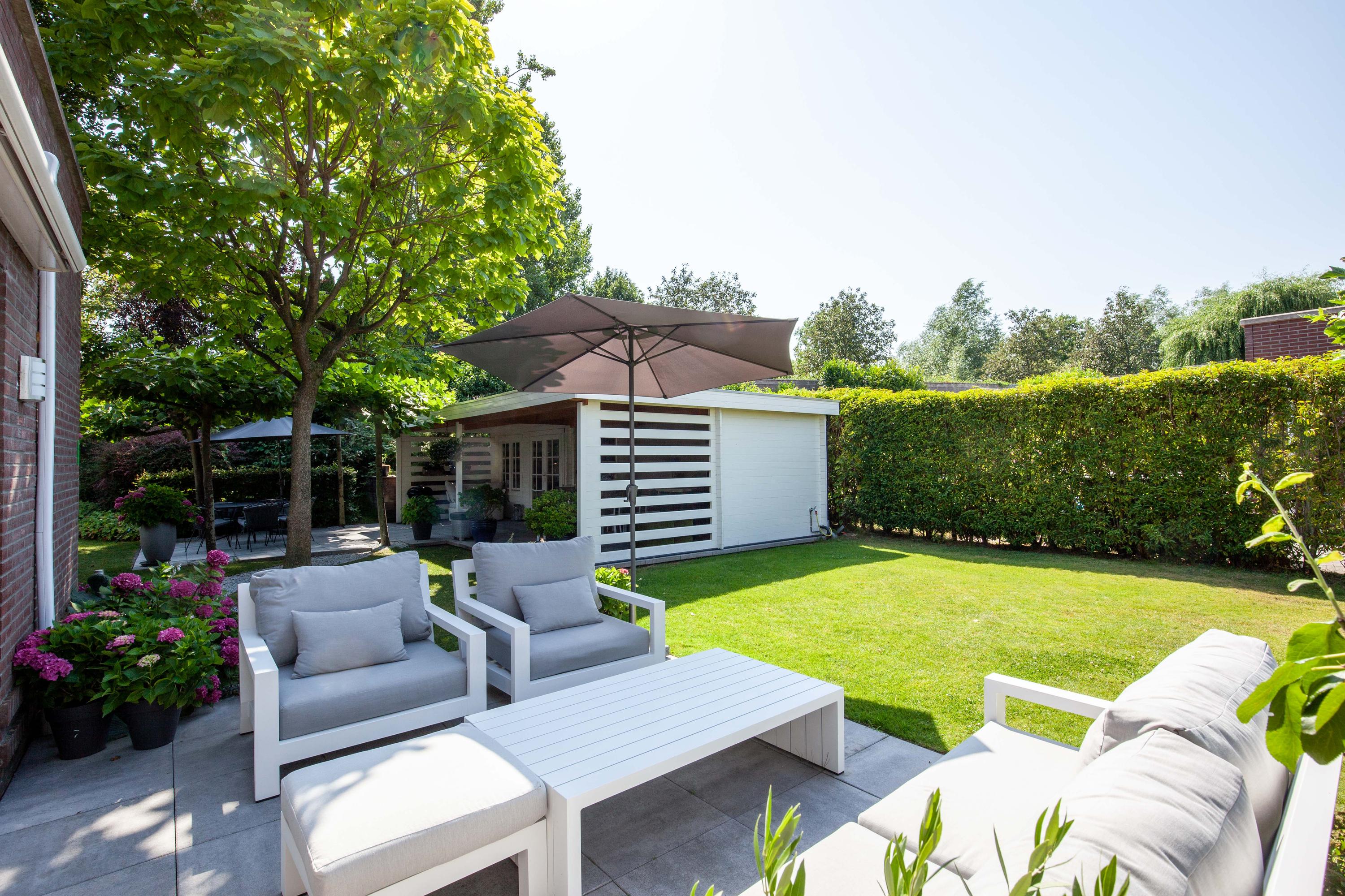De prachtige tuin is een waar buitenparadijs, direct bereikbaar via de schuifpui in de woonkamer en via de zijkant van de woning via een fraai open hekwand. De tuin biedt veel privacy en geniet de gehele dag van zon, ideaal om volop van buiten te genieten. Aan de achterzijde van de woning ligt een ruim terras met een sfeervolle zithoek, compleet met een uitvalscherm over de gehele breedte van de woning, ideaal om van zowel zon als schaduw te genieten. Achterin de tuin staat een charmant tuinhuis met overkapping, perfect voor een eethoek met barbecue. Het tuinhuis is voorzien van een nette houten vloer, elektriciteit en water, waardoor het uitstekend te gebruiken is als werkruimte, hobbyruimte of voor opslag. Aansluitend aan de overkapping bevindt zich een extra terras met zitruimte, beschut door een natuurlijke overkapping van vier prachtige platanen, waardoor een idyllische plek ontstaat om te ontspannen of gasten te ontvangen.