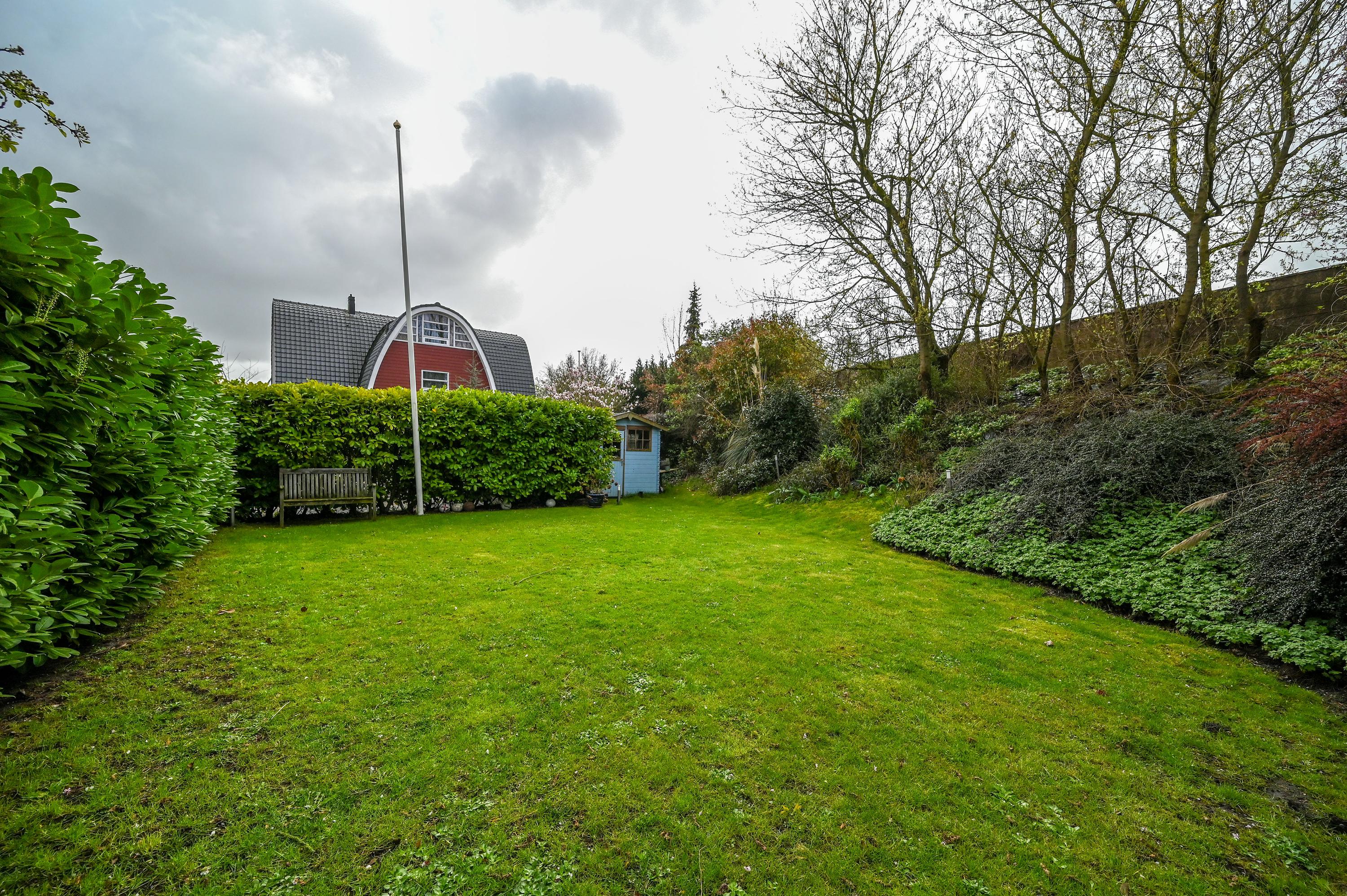 De tuin loopt door in een royale zijtuin, waar achterin een compact tuinhuis staat, ideaal voor gereedschap, fietsen of extra opslag, ook voorzien van elektriciteit. Over de gehele tuin ligt een prachtig gazon, afgewisseld met vaste planten, statige platanen en sfeervolle tuinverlichting. Een speels grindpad verbindt de verschillende terrassen en de ingang vanaf de zijkant van de woning, waar ook een wateraansluiting voor de tuinslang aanwezig is. De voortuin is volledig bestraat en biedt ruimte voor drie auto’s, inclusief een aansluiting voor elektrisch laden, waardoor zowel comfort als functionaliteit perfect samenkomen. Deze tuin combineert elegantie, praktisch gebruik en volop mogelijkheden om te genieten van buitenleven op elk moment van de dag.