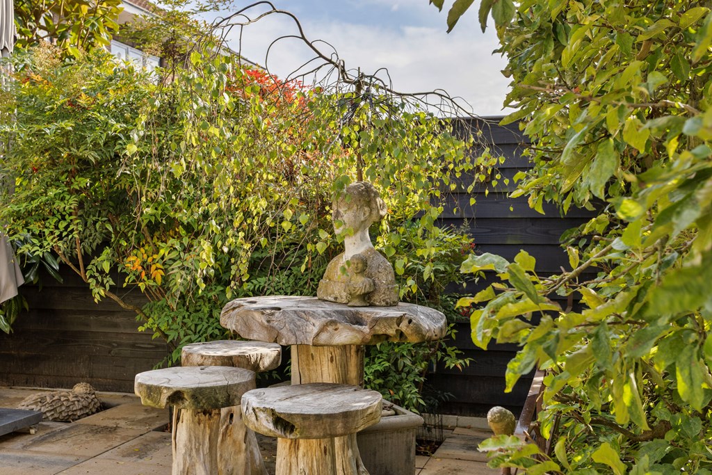 De tuin is zonder twijfel een van de meest bijzondere elementen van deze villa. Op een perceel van 674 m² eigen grond heeft u hier genoeg ruimte, privacy en rust. De tuin strekt zich ver naar achteren uit en biedt meerdere terrassen, sierlijke beplanting en verrassende doorkijkjes. Achterin staat een grote vrijstaande garage met aangrenzend een afsluitbare carport en een berging met dubbele lichtkoepel. Als extra toevoeging is er een knus tuinkamertje, sfeervol afgewerkt en voorzien van een raam om lekker te ontsnappen of creatief bezig te zijn. De tuin is ontworpen om elk seizoen tot zijn recht te laten komen: van het eerste voorjaarzonnetje tot de warme zomeravonden. Het is een plek waar u kunt eten, loungen, tuinieren en ontspannen — alles in uw eigen groene omgeving.