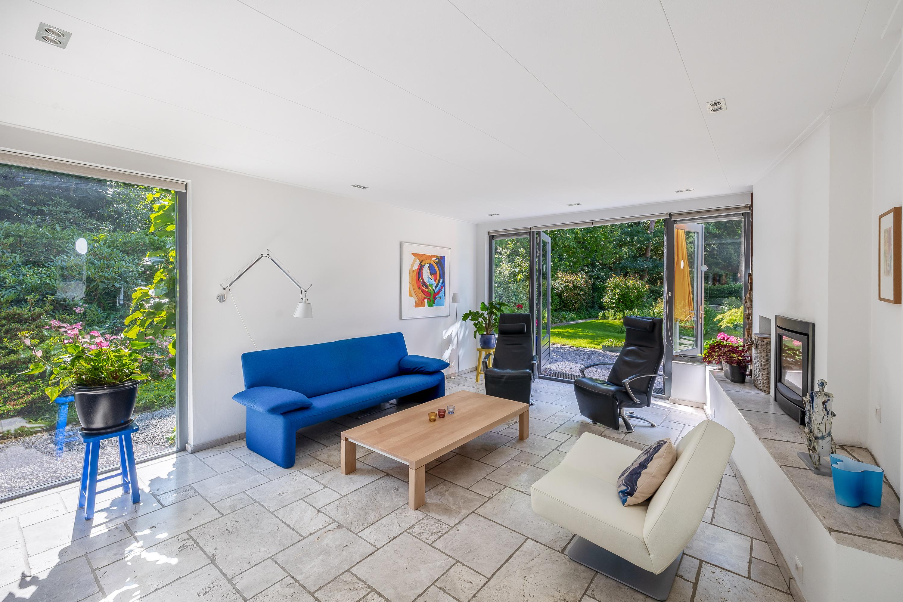 Aan de achterzijde van de woning bevindt zich de sfeervolle zitkamer. Deze kamer, met strakke stucwerkwanden, een plafond met inbouwspots en een marmeren vloer in Romeins verband nodigt uit tot ontspanning. De inbouwhaard zorgt voor extra gezelligheid en de dubbele openslaande tuindeuren bieden een prachtig uitzicht op en directe toegang tot de achtertuin.