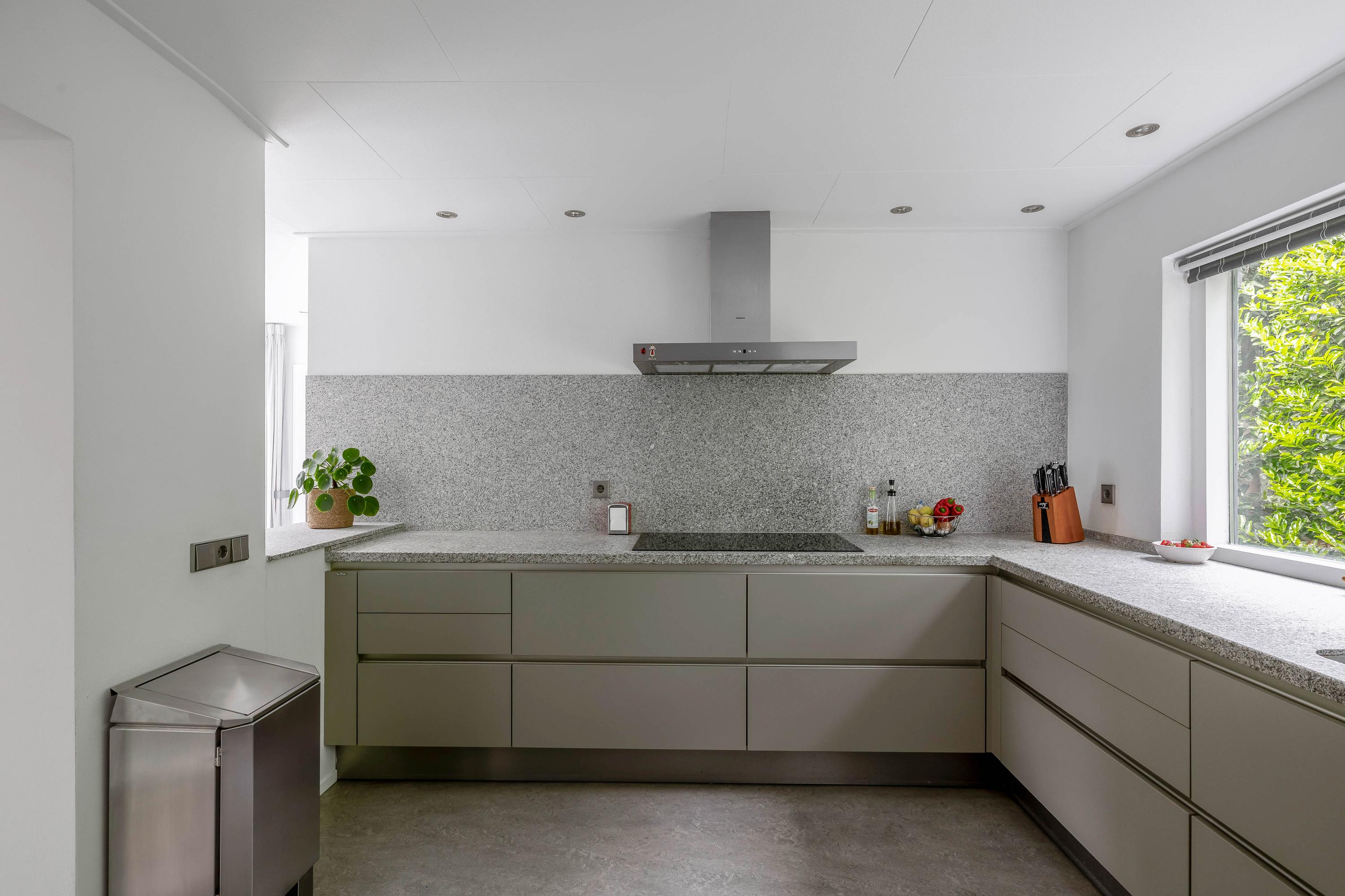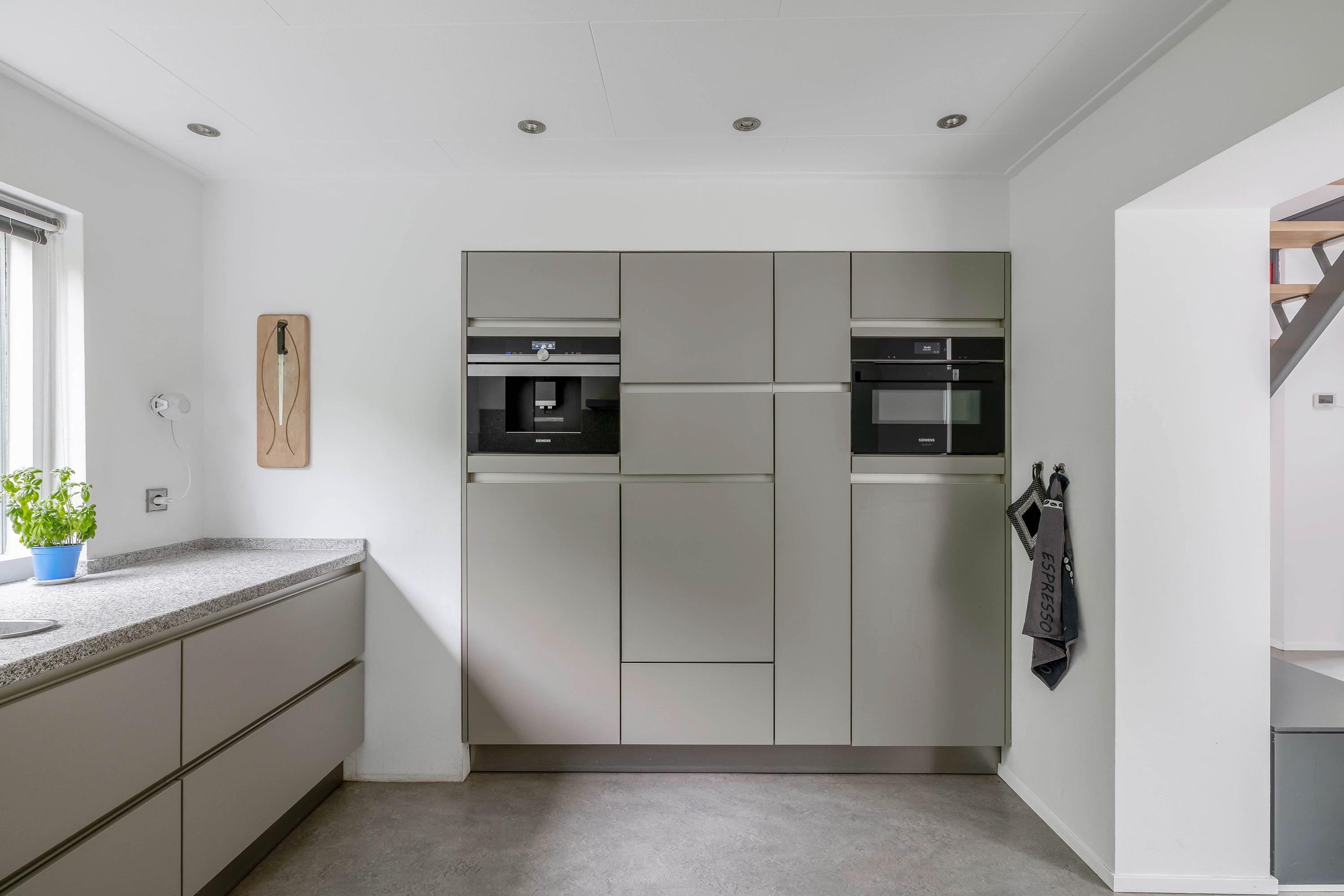 De half open greeploze Siematic keuken is een droom voor elke thuiskok. De keuken is voorzien van een gebrand granieten blad, spoelbak met een Fusion Quookerkraan ,afzuigkap, een 5-pits inductie kookplaat (11kW) en een wandopstelling met Home Connect combi-oven, twee koelkasten, een volautomatische koffiemachine met vele