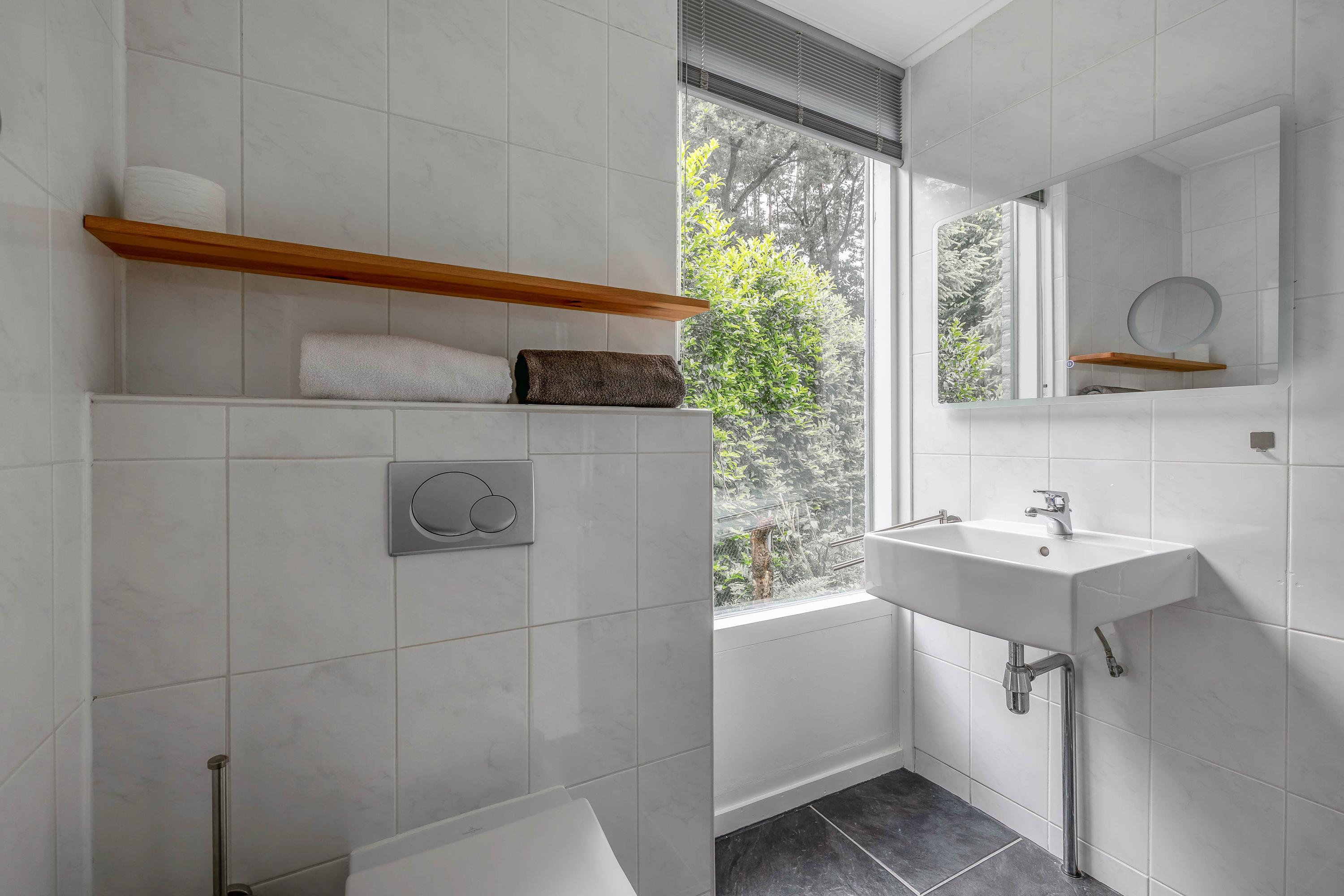 Aansluitend is er de geheel betegelde badkamer. Hier geniet je van een ruime doucheruimte met glasdeur, regendouche met thermostaatkraan, mechanische afzuiging, wastafel met verlichte en verwarmde spiegel en een toilet.