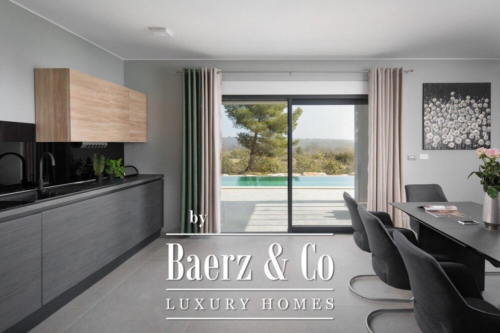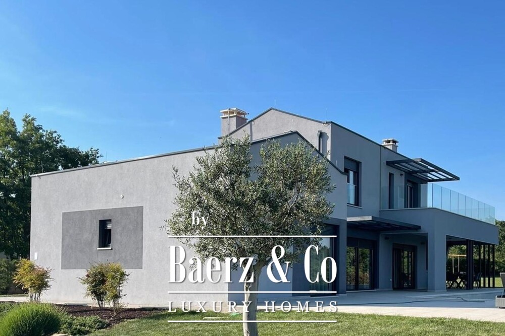 Elke slaapkamer is met zorg ingericht, heeft een eigen badkamer en modern meubilair voor optimaal comfort en discretie. Het binnenklimaat wordt geregeld via een geavanceerd fansysteem en wordt aangevuld door een stijlvolle sauna voor volledige ontspanning. De locatie is sereen, maar slechts zeven kilometer verwijderd van Fažana, de zee en Brijuni, en binnen tien minuten rijden bent u bij winkels, restaurants en lokale voorzieningen. Deze luxe villa te koop in Vodnjan combineert comfort, privacy en een unieke band met het landschap.