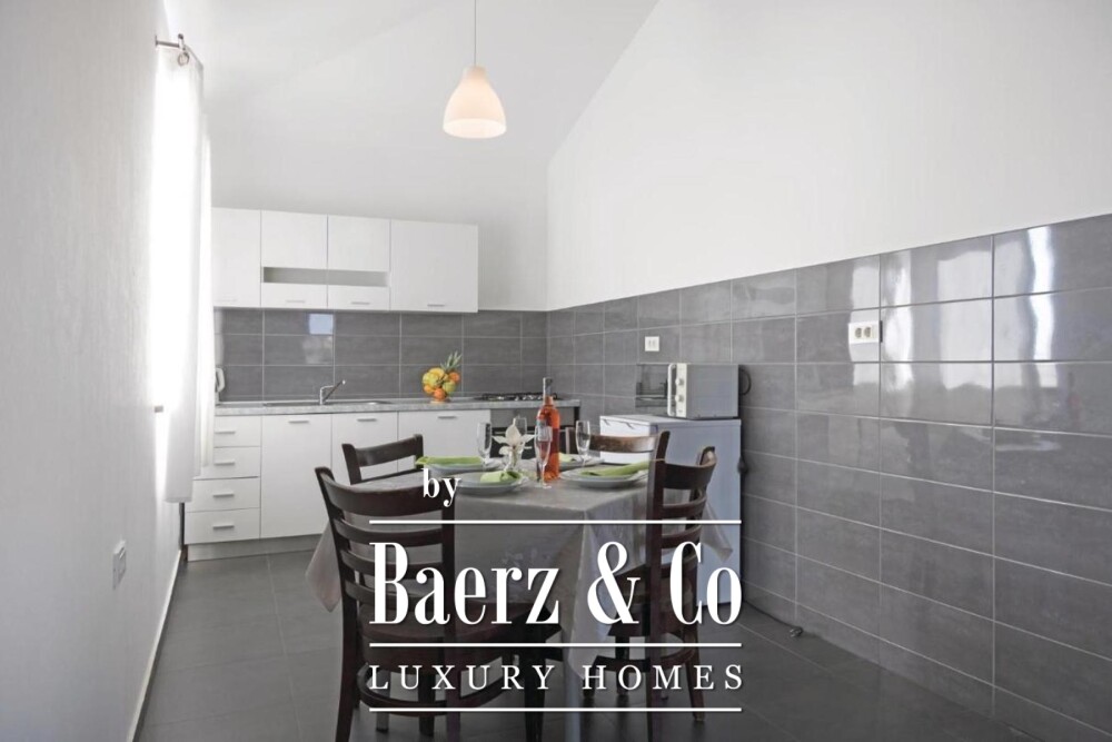 Het appartement op de begane grond, met een oppervlakte van 218 m², staat centraal rondom een open living, eetruimte en keuken, vergezeld door vier slaapkamers. Eén daarvan beschikt over een eigen badkamer en inloopkast. Daarnaast zijn er doordachte voorzieningen zoals een gastentoilet en extra badkamers voor optimaal comfort. Op de eerste verdieping bevinden zich nog twee appartementen — één van 104 m² en één van 86 m² — elk met een open indeling, twee slaapkamers en privébalkons. Het grotere appartement boven heeft daarnaast een terras van 70 m² met spectaculair zeezicht en toegang tot een hoger gelegen observatiedek, ideaal om te genieten van de Adriatische horizon.