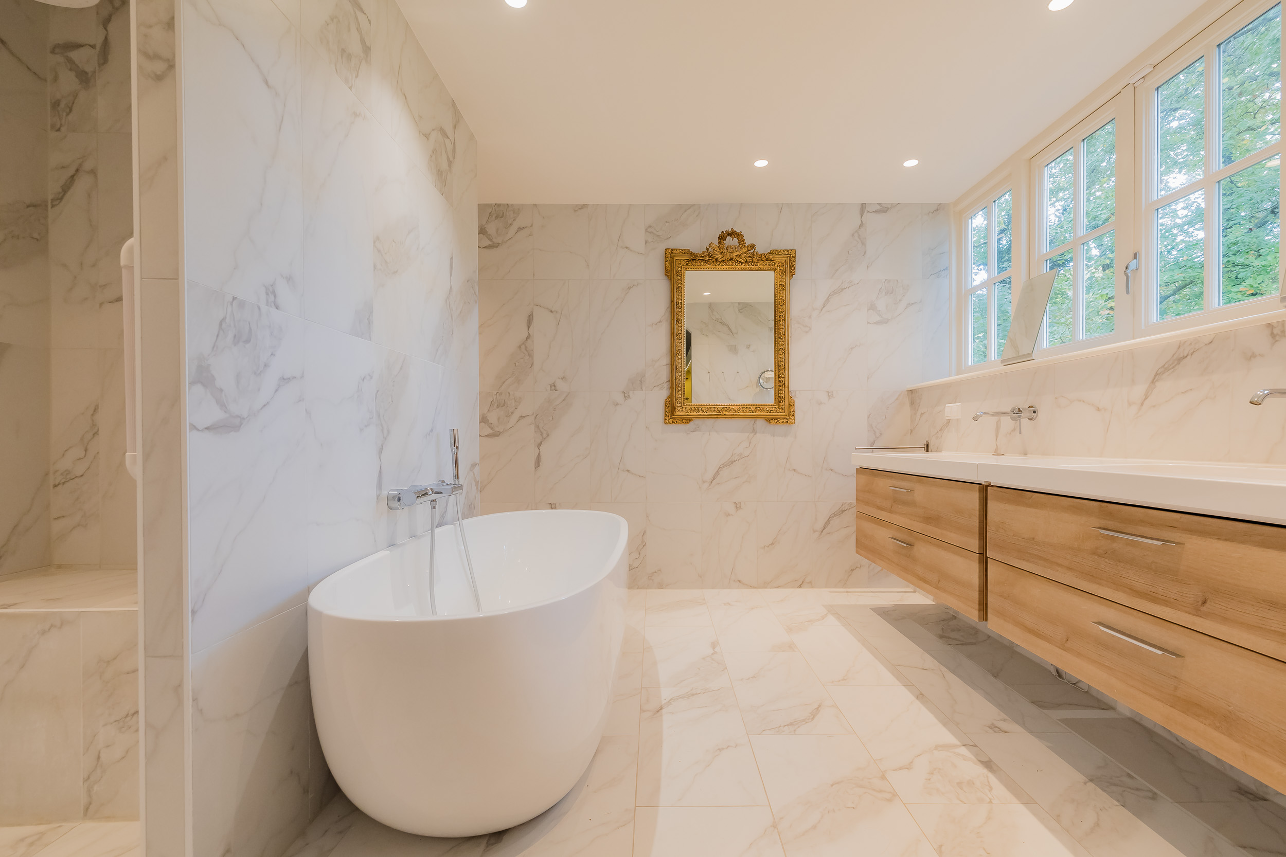 Via de indrukwekkende centrale hal met fraaie bordestrap en lift bereikt u alle vertrekken. De lichte woonkamer is een heerlijke ruime plek om van de rust en het uitzicht te genieten en biedt direct toegang tot de veranda. De open haard en vloerverwarming zorgen samen voor nog meer sfeer en comfort. Aan de voorzijde van de woning bevindt zich een sfeervolle herenkamer (of eetkamer) met uitzicht op het bos. Tussen deze kamers in bevindt zich een ruime werkplek.