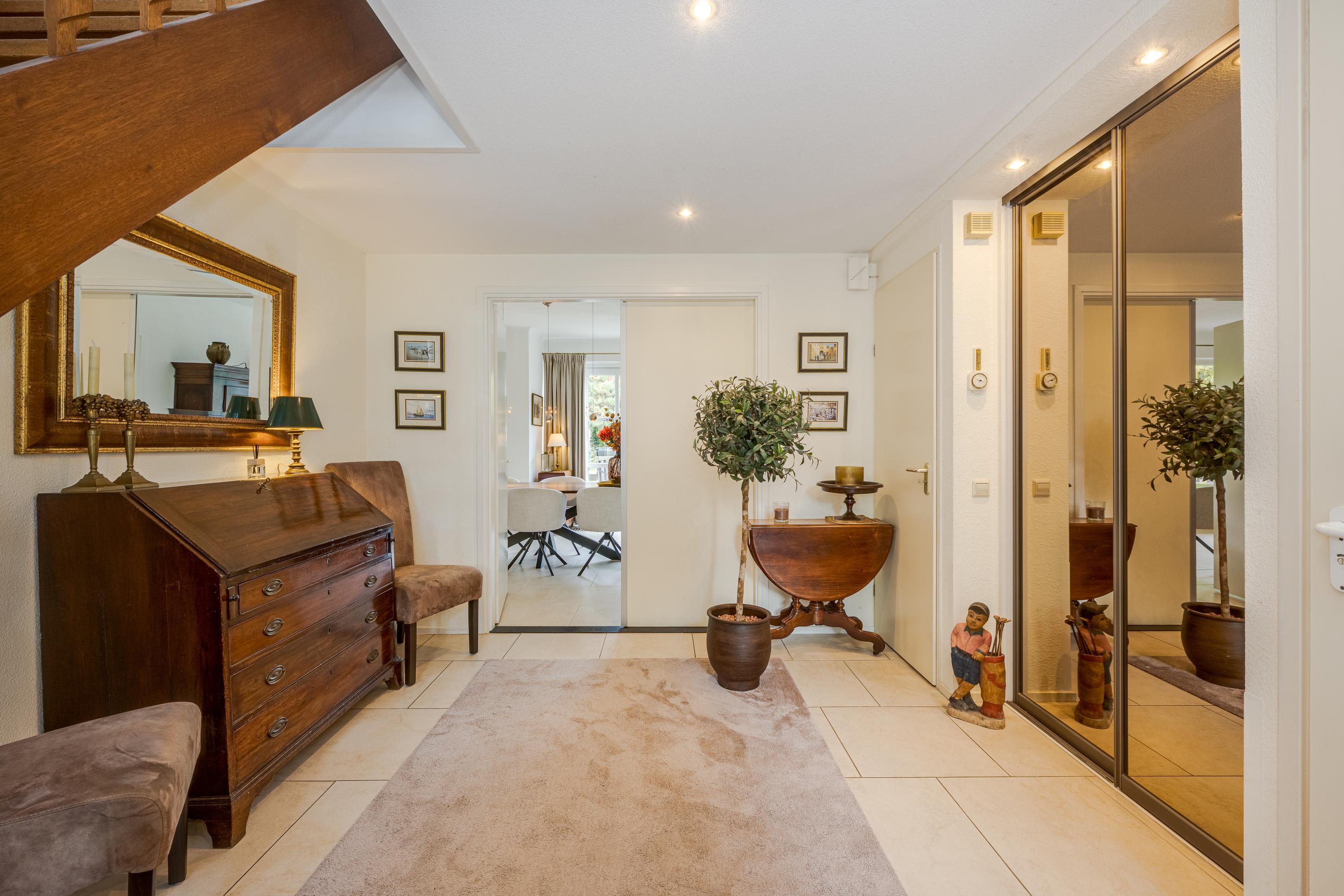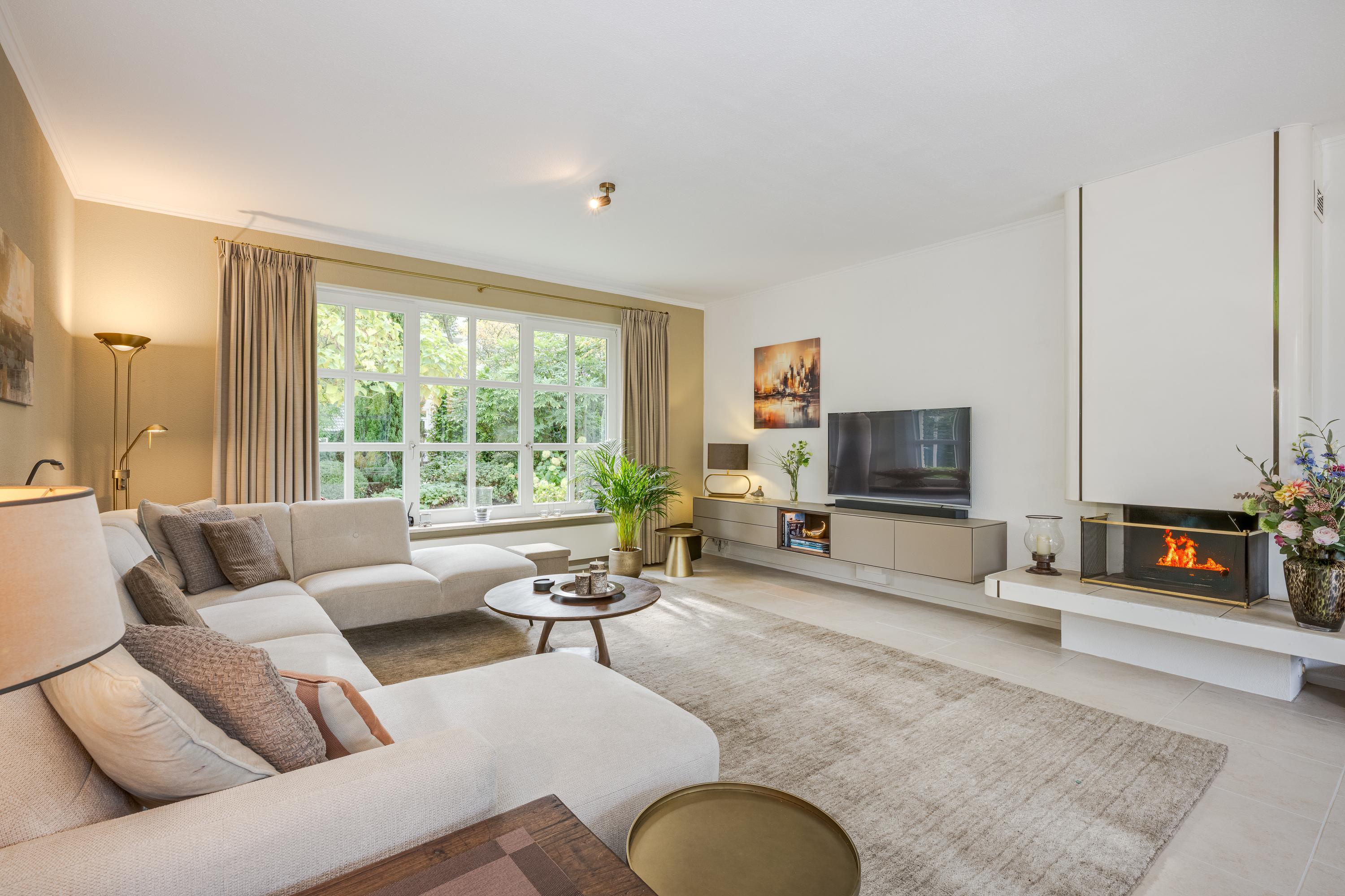 Entree met ruime hal, toilet en garderobe. Dubbele deuren geven toegang tot de lichte en riante woon-/eetkamer van ca. 55 m², met grote raampartijen, een schuifpui naar het terras en een sfeervolle houtgestookte open haard.