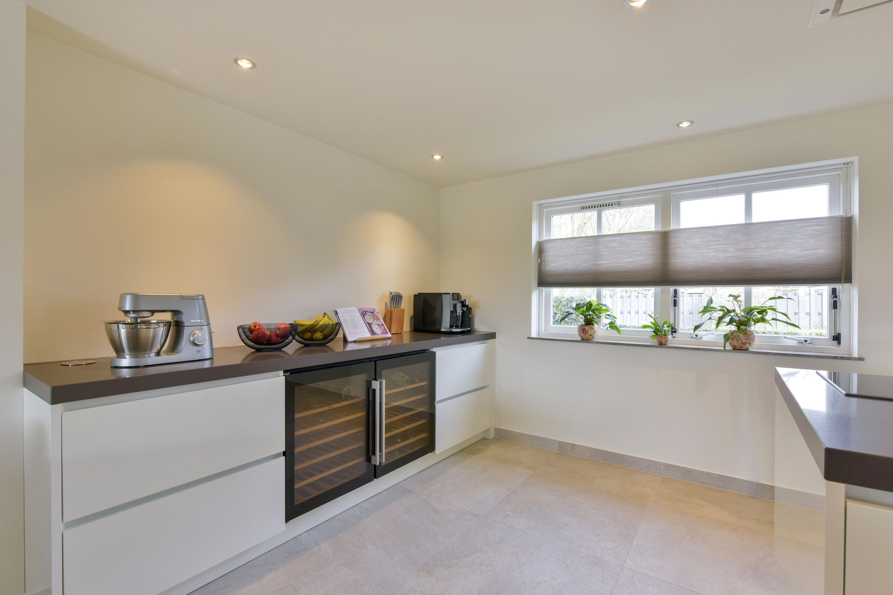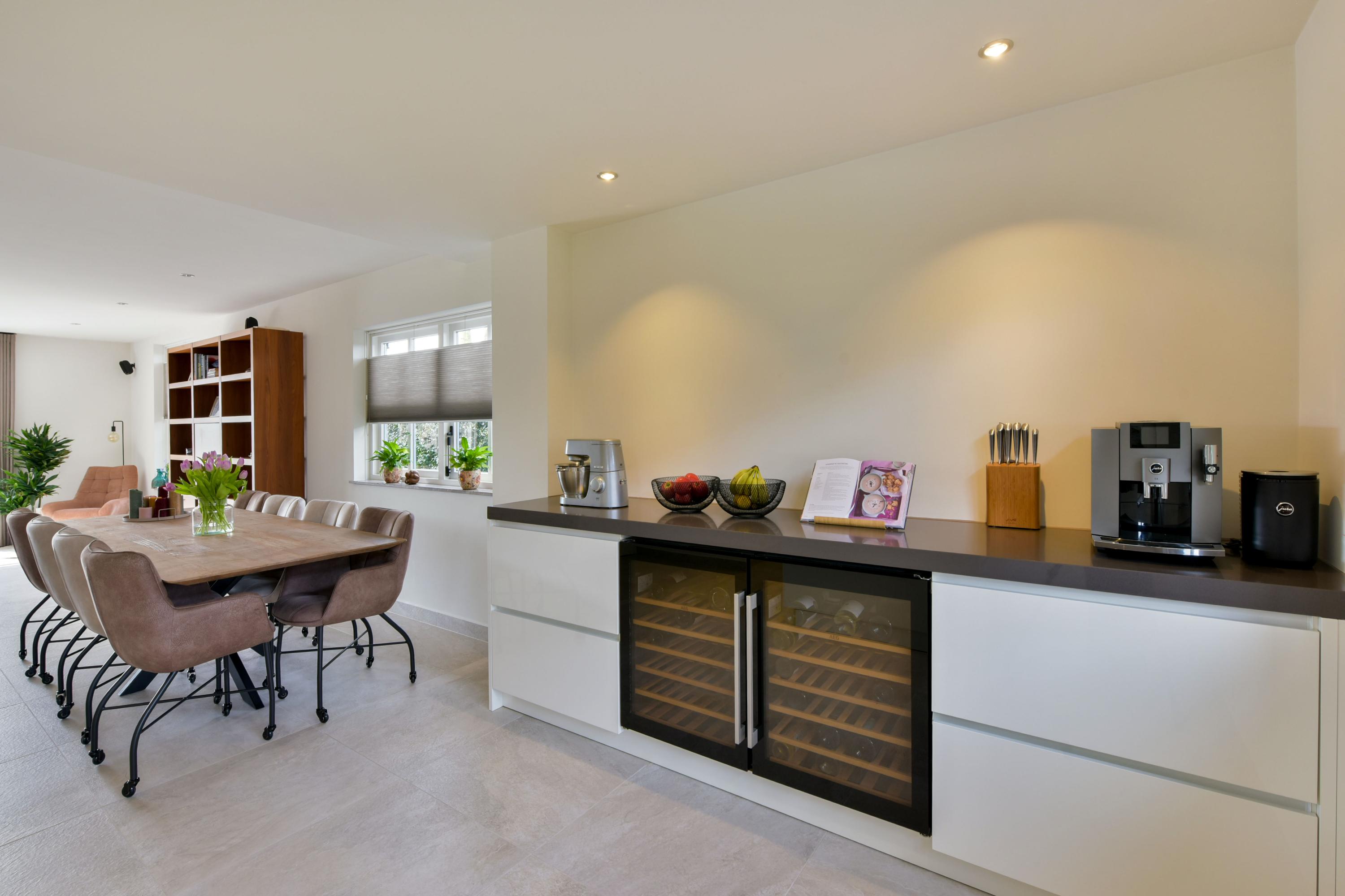Bij binnenkomst valt direct de royale hal op, die zorgt voor een prettige en open ontvangst. Vanuit deze representatieve hal heb je toegang tot het toilet, de vernieuwde meterkast voorzien van een 3 fase aansluiting, de multifunctionele ruimte en de heerlijk lichte woonkamer met open keuken. De L-vormige woonkamer bevindt zich aan de achterzijde van de woning en is een heerlijke plek om samen te komen. Grote raampartijen en de schuifpui zorgen voor een prachtige lichtinval en een naadloze verbinding met de tuin. Het vrije uitzicht over het groen maakt dat elk seizoen hier zijn charme heeft. De keramische vloer met vloerverwarming ( op de gehele BG), de subtiel geïntegreerde spotverlichting en de strak weggewerkte bekabeling dragen bij aan de rustige, moderne uitstraling. Aan de voorzijde van de woning ligt de indrukwekkende open keuken geplaats in 2019 , die met recht riant te noemen is. Het grote kookeiland vormt het centrale punt, perfect om samen te koken of gezellig aan te zitten. Aan beide zijden vind je stijlvolle kastenwanden met een compleet pakket aan inbouwapparatuur: een combi-oven, stoomoven, koelkast, vriezer, vaatwasser, inductiekookplaat, plafondafzuiging, Quooker en 2 wijnklimaatkasten. De gehele woning is voorzien van spotledverlichting met touch-dimmers, wat zorgt voor een sfeervolle en flexibele verlichting. Vanuit de centrale hal bereik je tevens de multifunctionele ruimte, voorheen de garage. Deze ruimte is nu volledig geïntegreerd in de woning en biedt talloze mogelijkheden, zoals een werkruimte, praktijk aan huis of extra leefruimte. Hier bevindt zich ook een moderne badkamer van 2022 voorzien van een dubbele regendouche ’s , wastafel, wc en design elektrische handdoekradiatoren, dus ook een slaapkamer op de begane grond behoort tot de mogelijkheden.