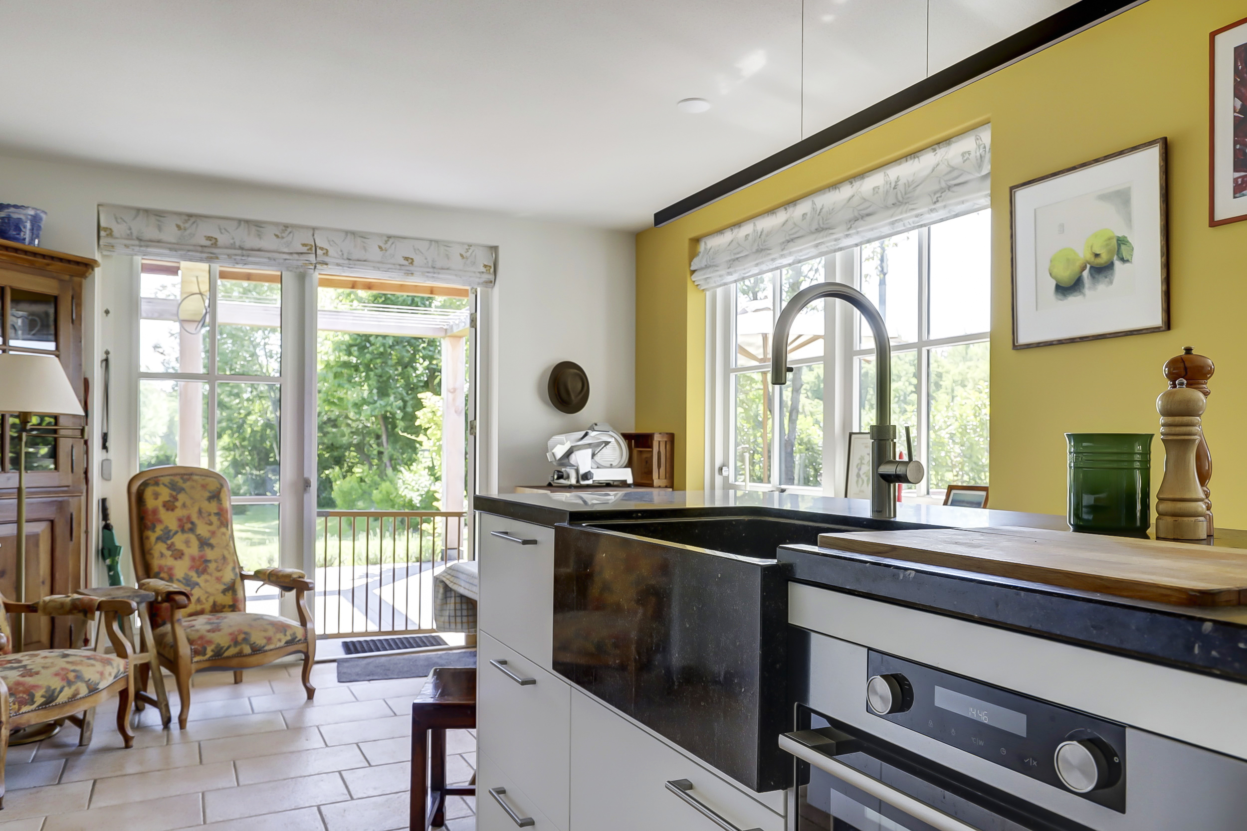 Het huis beschikt over een royale, lichte living met een erker en een sfeervolle open haard. De woonkamer is lekker licht door de grote raampartijen en de openslaande tuindeuren. De living staat in een open verbinding met de ruime eetkeuken, die plaats genoeg heeft voor een grote eettafel. Ook hier zijn openslaande tuindeuren die openen naar het zonnige terras met veranda.