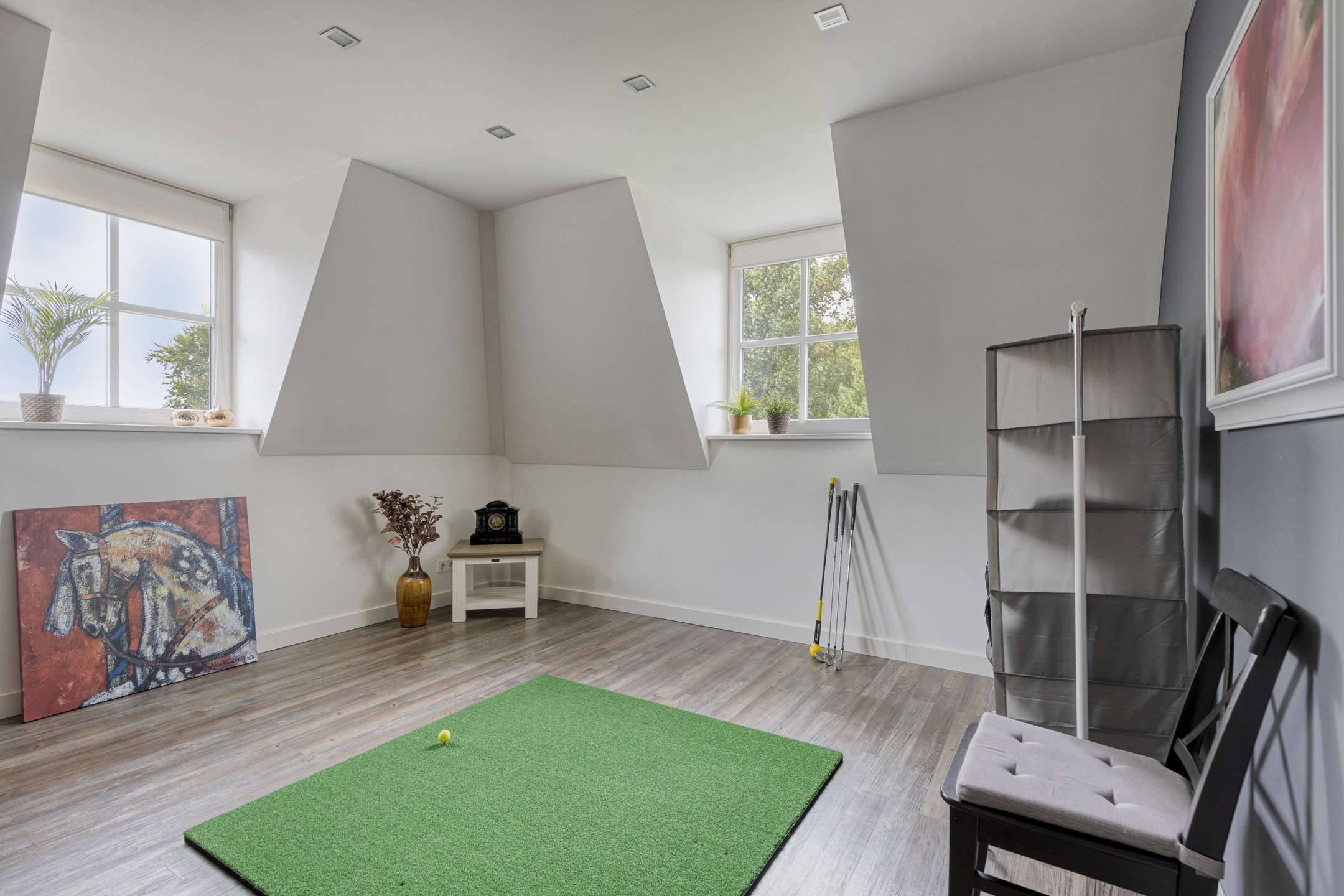 Werk-/speelkamer: wanden gestuct, natuurstenen vloer, plafond gestuct.
