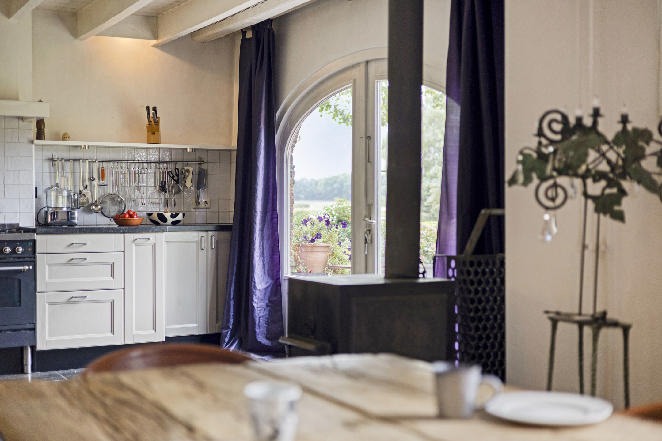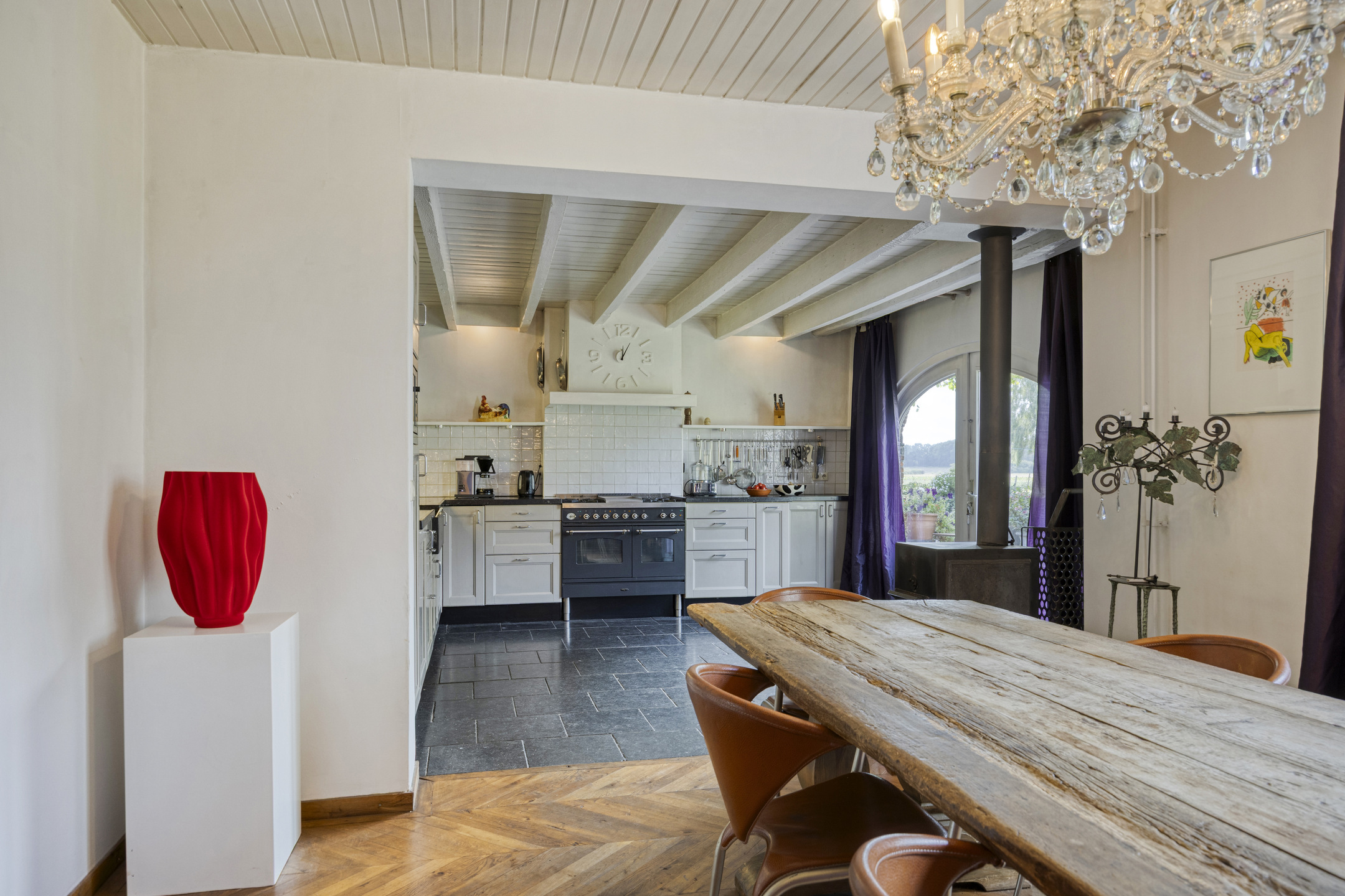 woonkeuken waarin geplaatst een in hoek opgestelde inbouwkeuken voorzien van een natuurstenen aanrechtblad met dubbele spoelbak, inbouw gasfornuis, -koeler -magnetron, -vaatwasser en een afzuigkap, tevens voorzien van een houtkachel, wandafwerking tegels en stucwerk, eiken visgraatvloer en deels natuurstenen vloer, plafond afgewerkt met houten schroten en balkenplafond, tuindeuren naar tuin/terras;