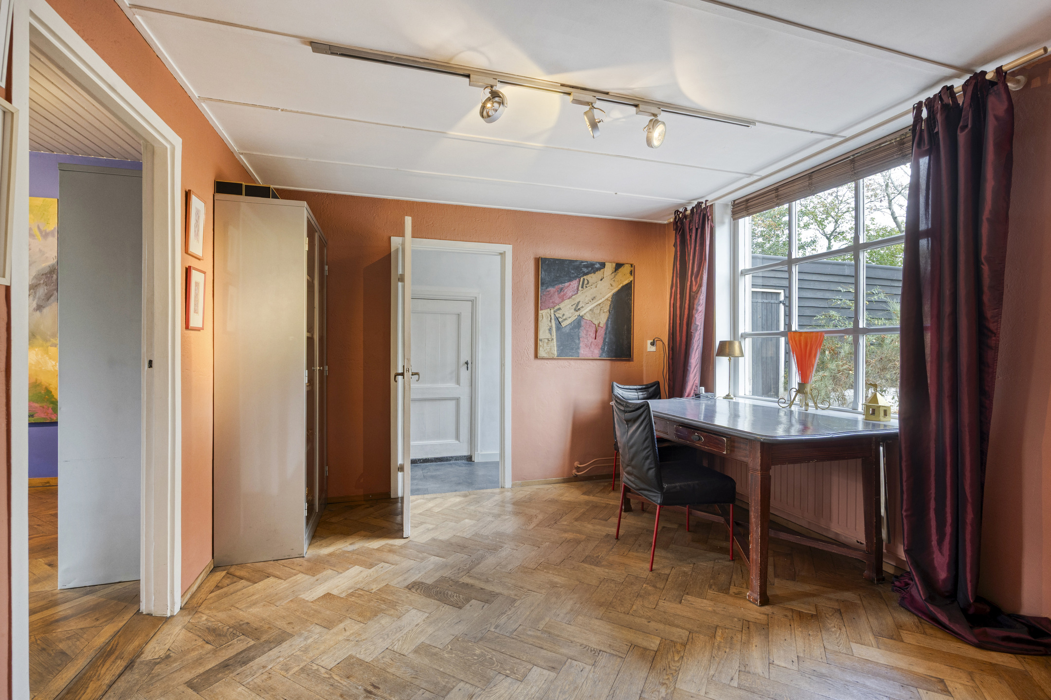 tussenruimte / nu in gericht als kantoor, wandafwerking stucwerk, visgraatvloer, plafond afgewerkt met boardplaten;