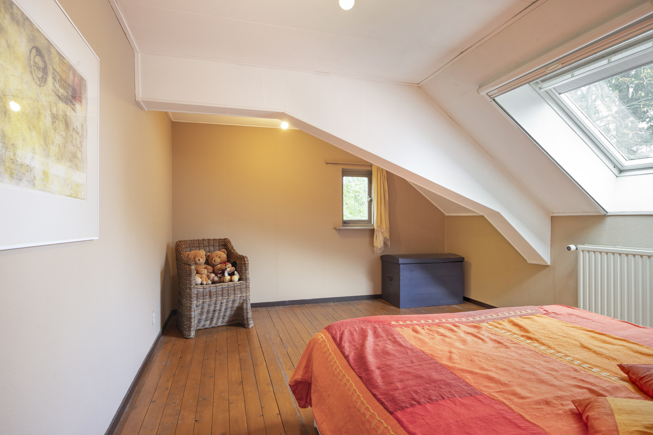 hoofdslaapkamer met een 3-tal dakramen, wandafwerking stucwerk, laminaatvloer met eiken bovenlaag, fraai zicht op de houten balkenconstructie, inloopkast vv. omvormer en een dakraam;