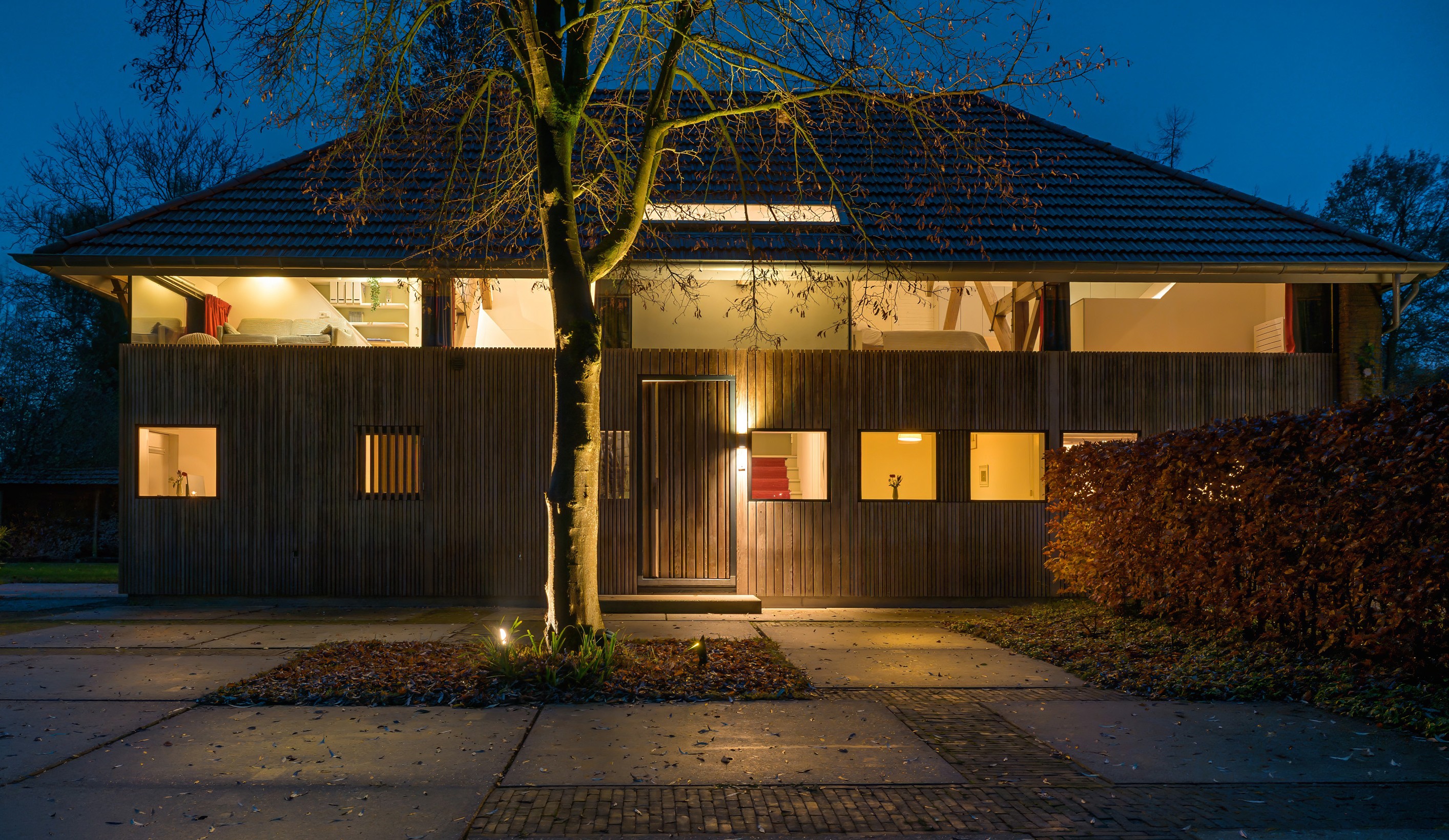 Площадь резиденции составляет 248 м² на частном участке площадью 2 395 м²; здесь гармонично сочетаются открытость и чёткая структурность. Высокая входная дверь ведёт в пространство, где пересекаются старое и новое: индивидуальные шкафы, кухня в форме буквы U из торцевого дерева и натурального камня, гостиная, выходящая в сад с ухоженными взрослыми деревьями. Оригинальные балки перекрытия и датские высокоэффективные печи создают атмосферу уюта. В планировке предусмотрены четыре спальни, одна элегантная ванная комната с душем открытого типа и встроенным освещением, а также универсальные помещения—идеальны для кабинета или гостевой зоны с отдельным входом.