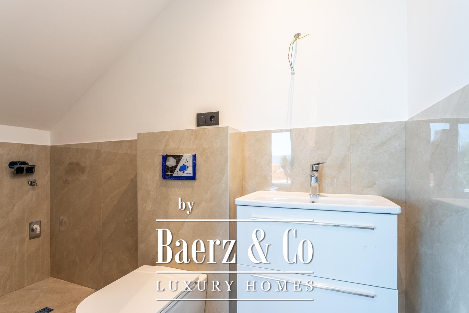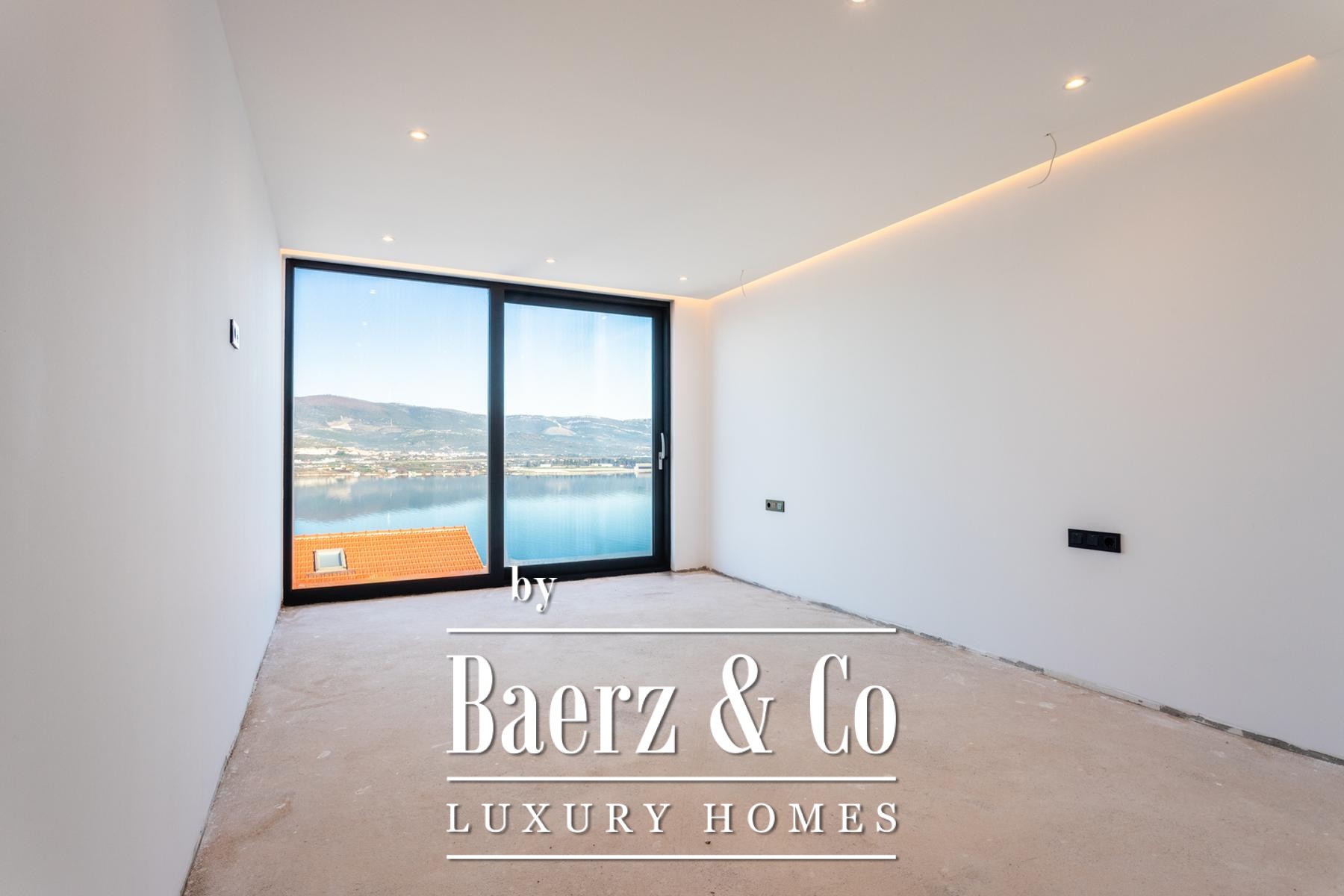 Коридор, гостевой санузел с прачечной и гибкая комната, подходящая для кабинета, спортзала или игровой, завершают продуманную планировку главного уровня. На верхнем этаже три спальни, каждая с собственной ванной комнатой и панорамным остеклением, открывающим захватывающий вид на Адриатику в любую сторону.