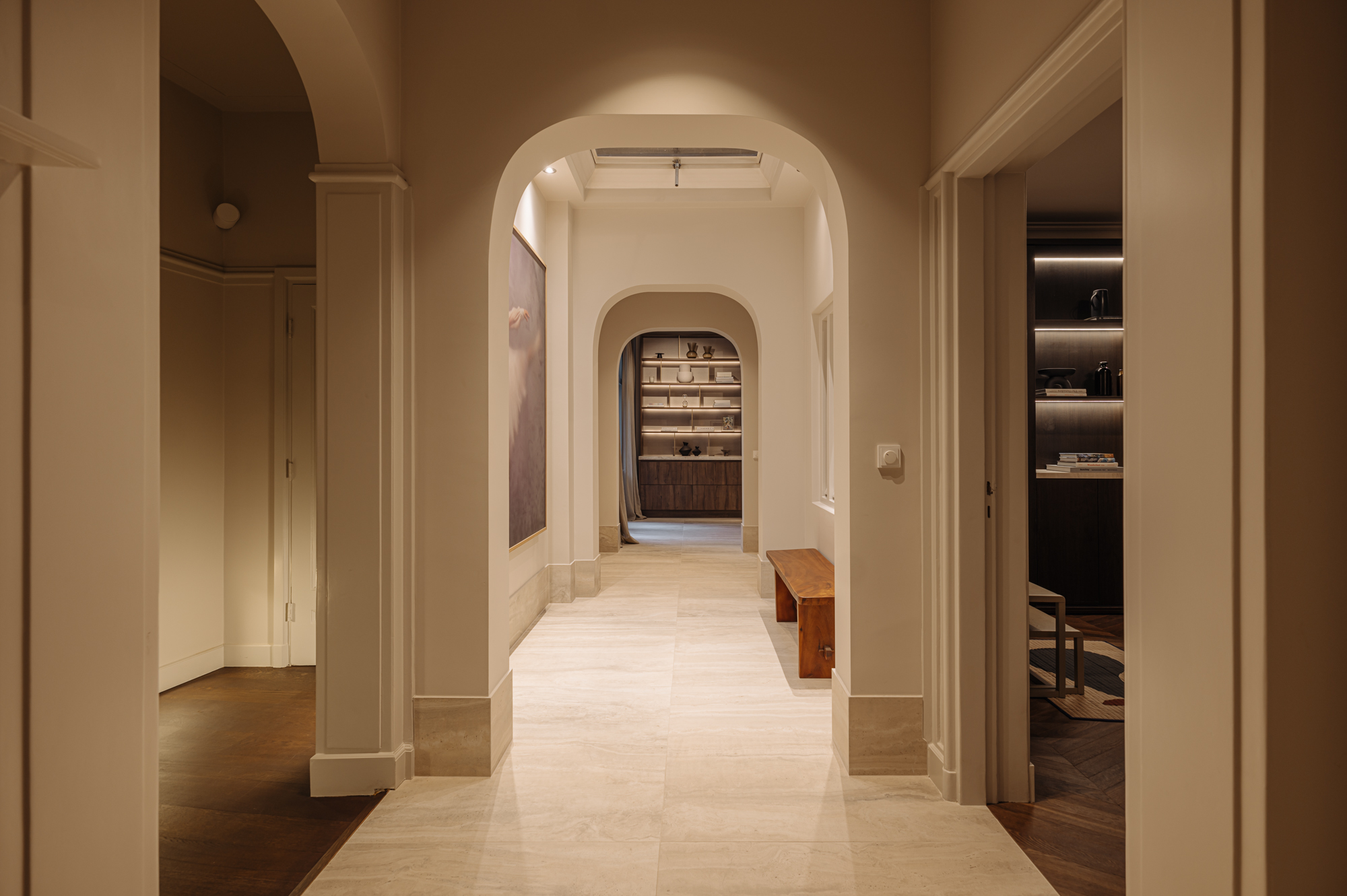 法式落地门引入充足阳光,通向约36平方米、朝西南的花园,将空间感延伸至户外。公寓布局包括多功能玄关、可作书房或次客厅的空间,以及下沉一层的两间额外房间(净高2.23米),为居住和储物带来灵活性。玄关、浴室和厨房均配有地暖,提升日常舒适度。