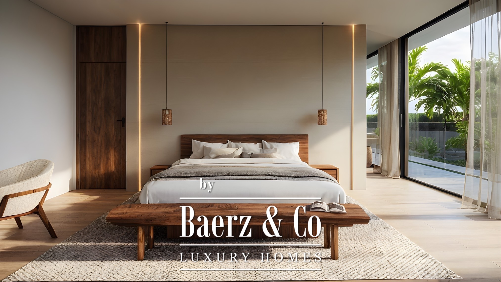 The main floor opens onto the garden through a large living-dining room with an integrated designer kitchen, fully equipped and connected to the outside area. Large full-height windows allow a perfect fusion between interior and exterior, giving way to the covered porch, the private pool and the chill-out area. On this level there is also a guest bedroom with its own bathroom and a guest toilet.