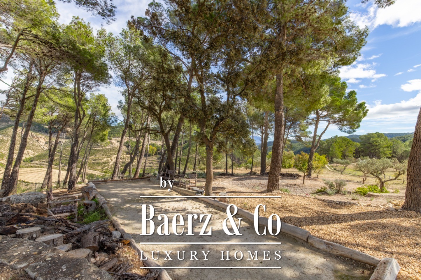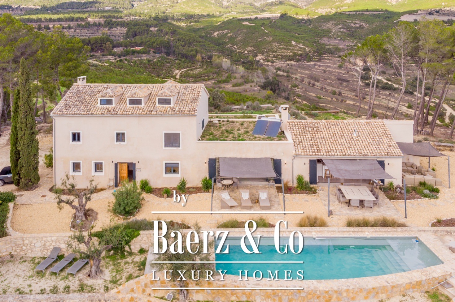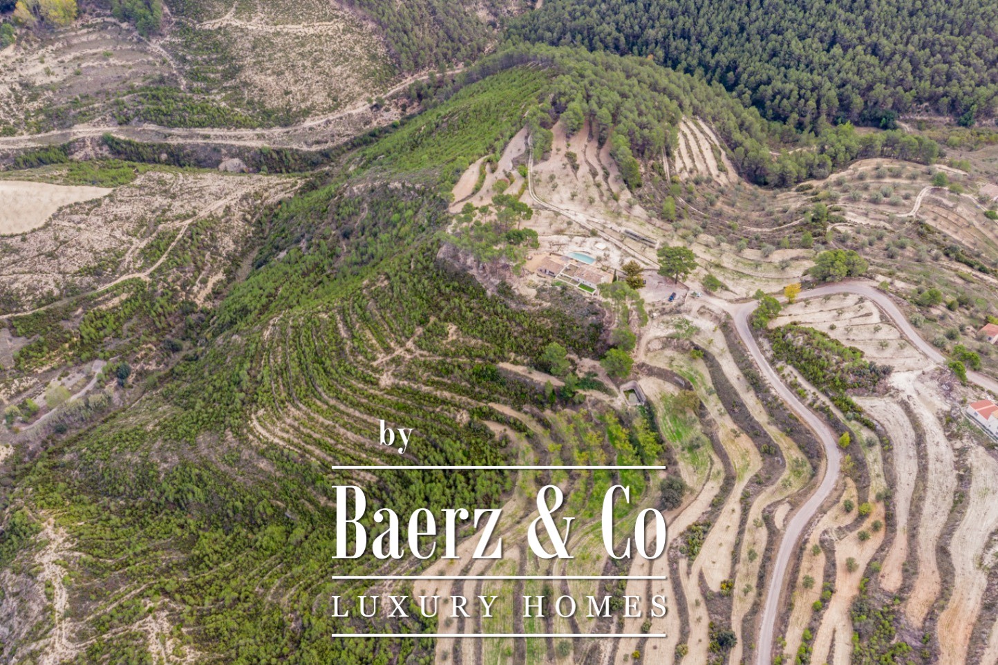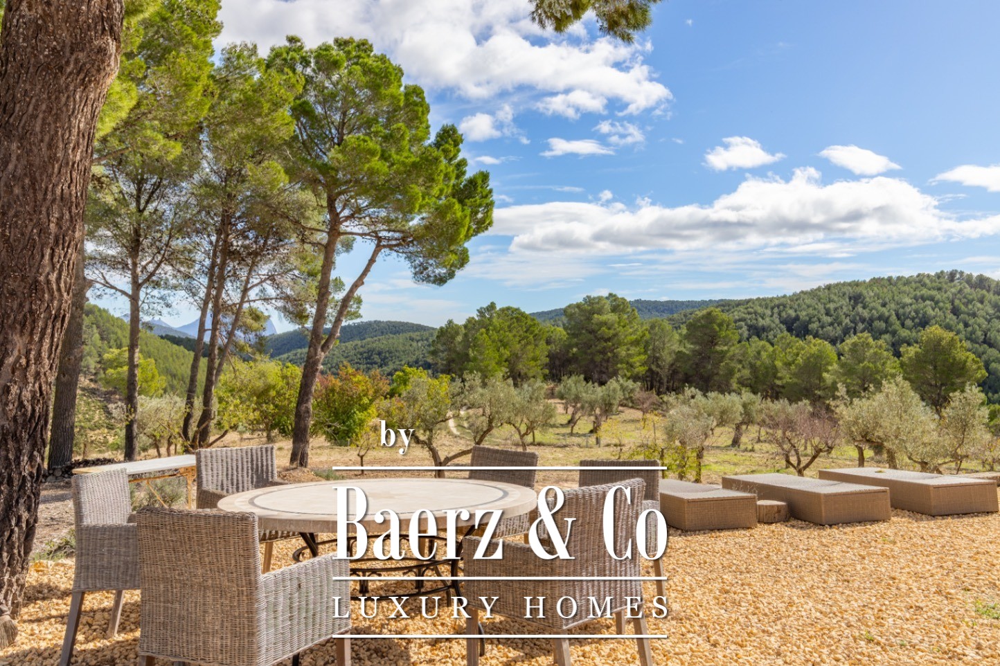 Torremanzanas庄园是西班牙内陆最宁静地区之一罕见的房产类型。庄园坐落于850米海拔的18公顷郁郁葱葱地中海风情土地上,距Torremanzanas村仅3公里,享有Puig Campana的全景美景。主楼面积450平方米,于2022年精心翻新,现代高端工艺与地中海本色和谐相融。每个生活空间均明亮、精致低调,并延伸至橄榄、杏仁和核桃树点缀的自然风光中。